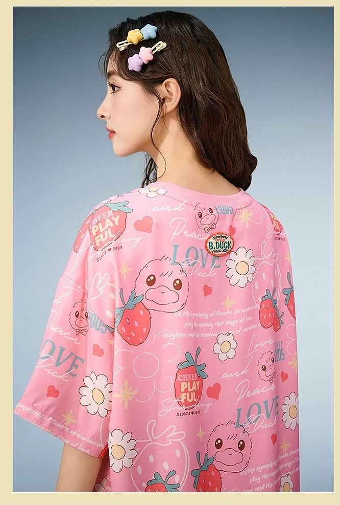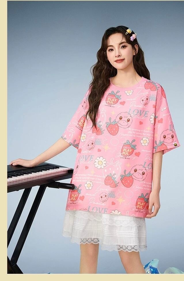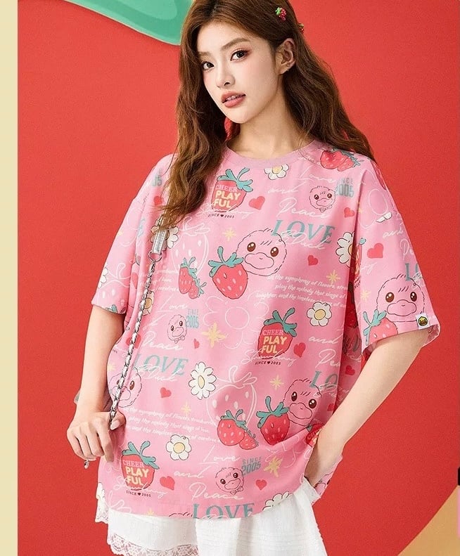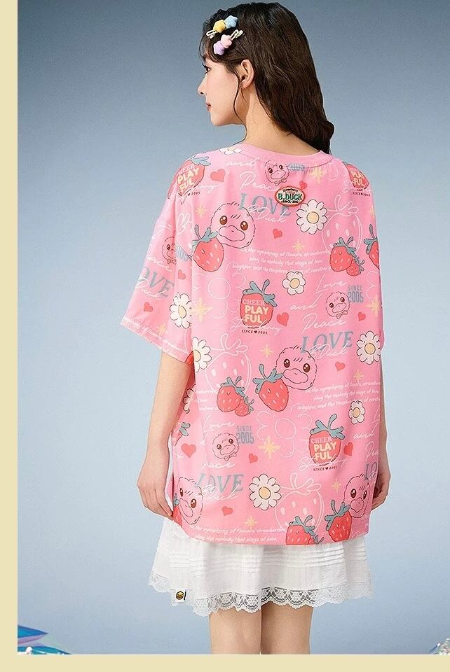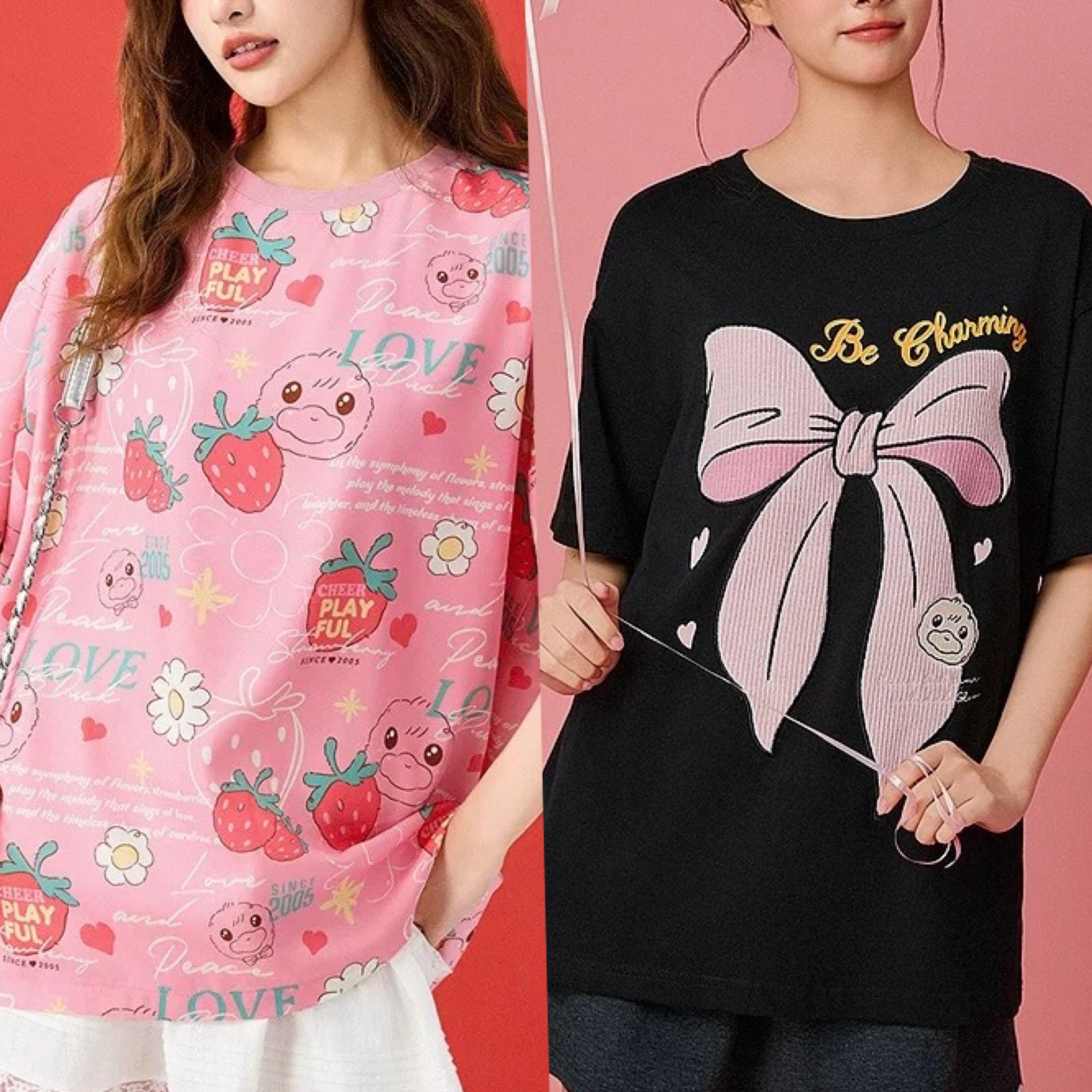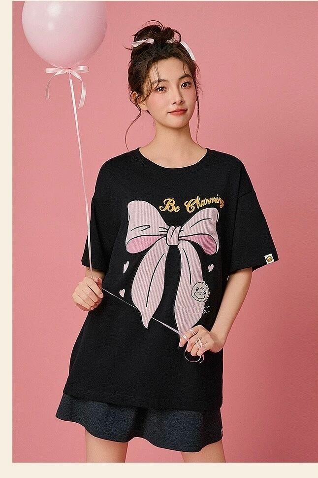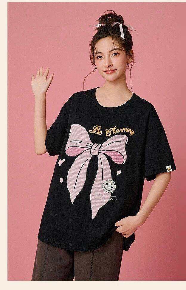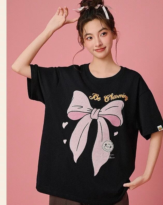 トップス、黒 ピンク Tシャツ、 かわいい 柄 リボン、XL トップス、カジュアル スウェット 原宿 いちご ガーリー、ゆったり ルームウェア XL 総柄 ブラウス