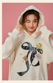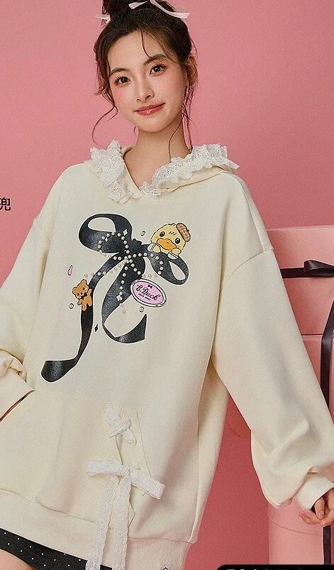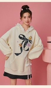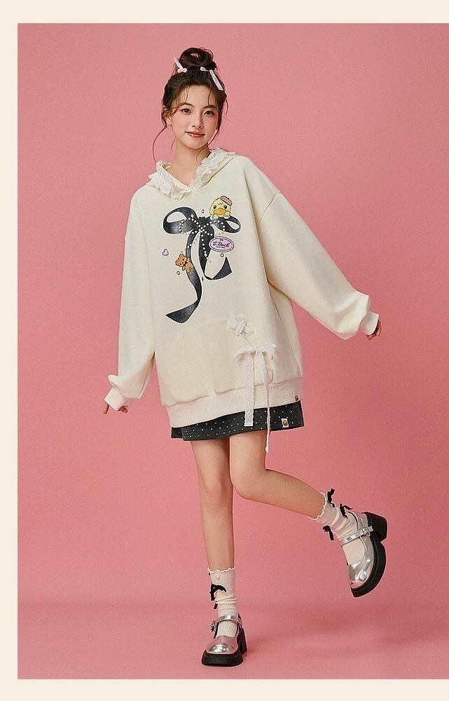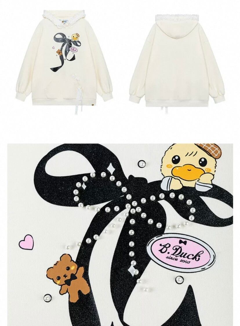 白 ホワイト フリルカ リボン かわいい ペンギン クマ アヒル パーカー スウェット トレーナー トップス リボン ガーリー デコレーション 原宿 ゆったり XL