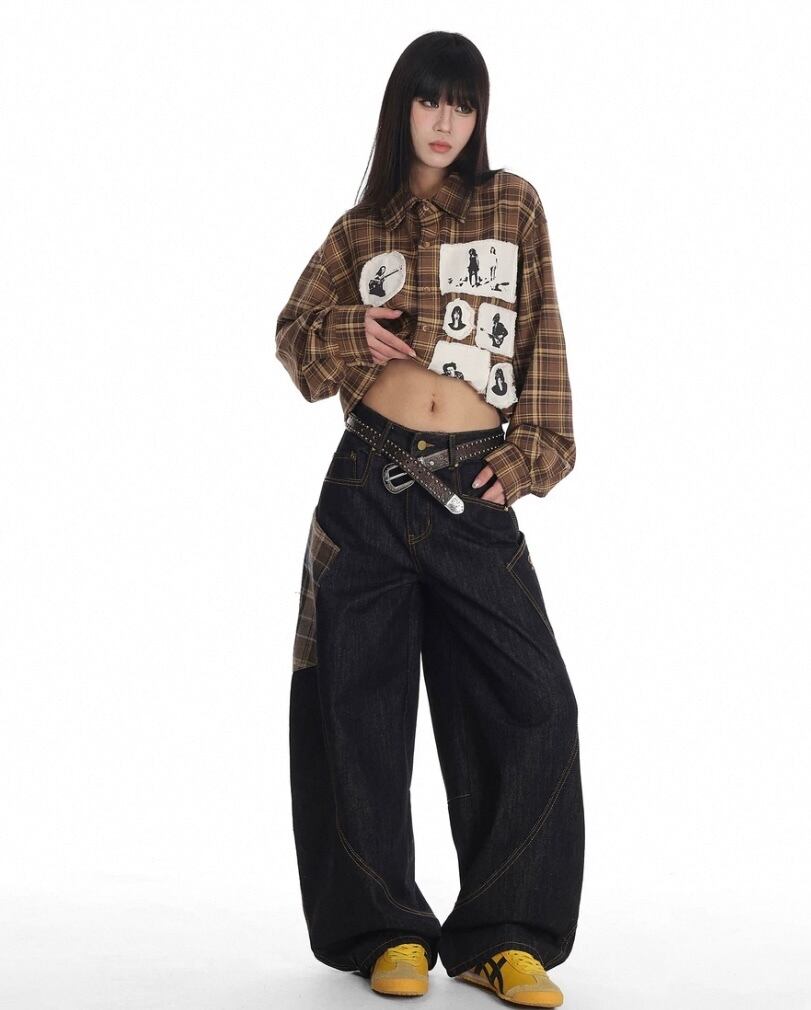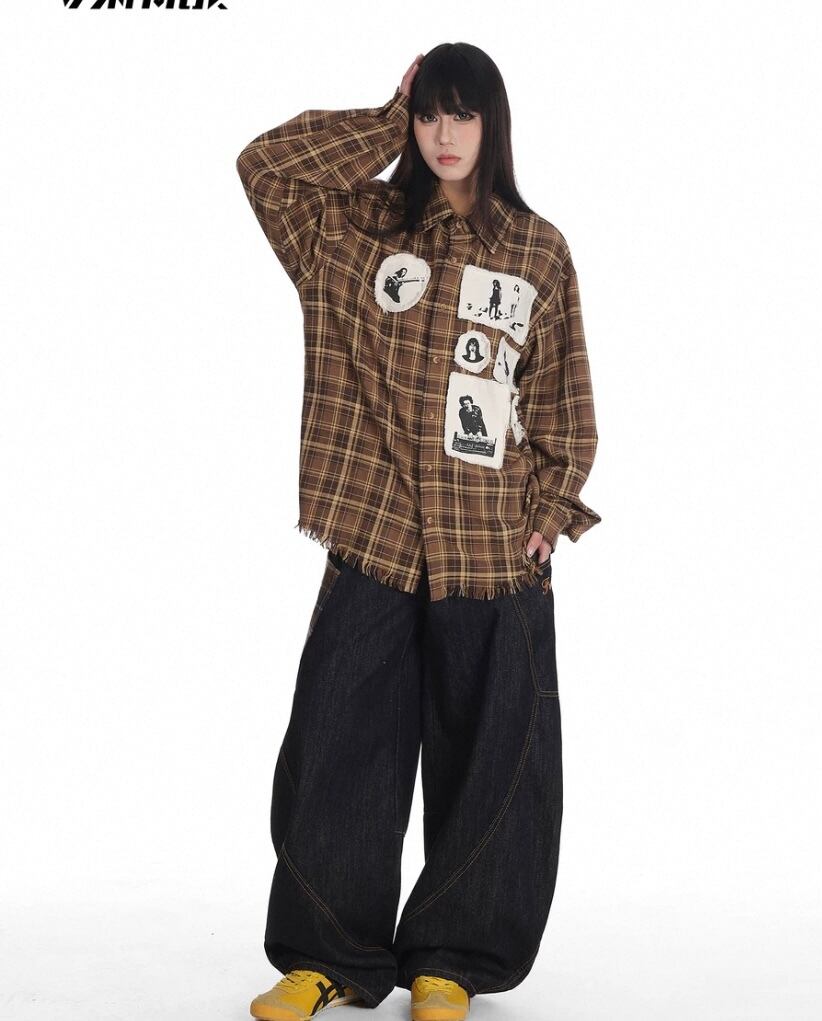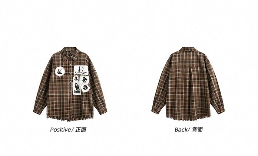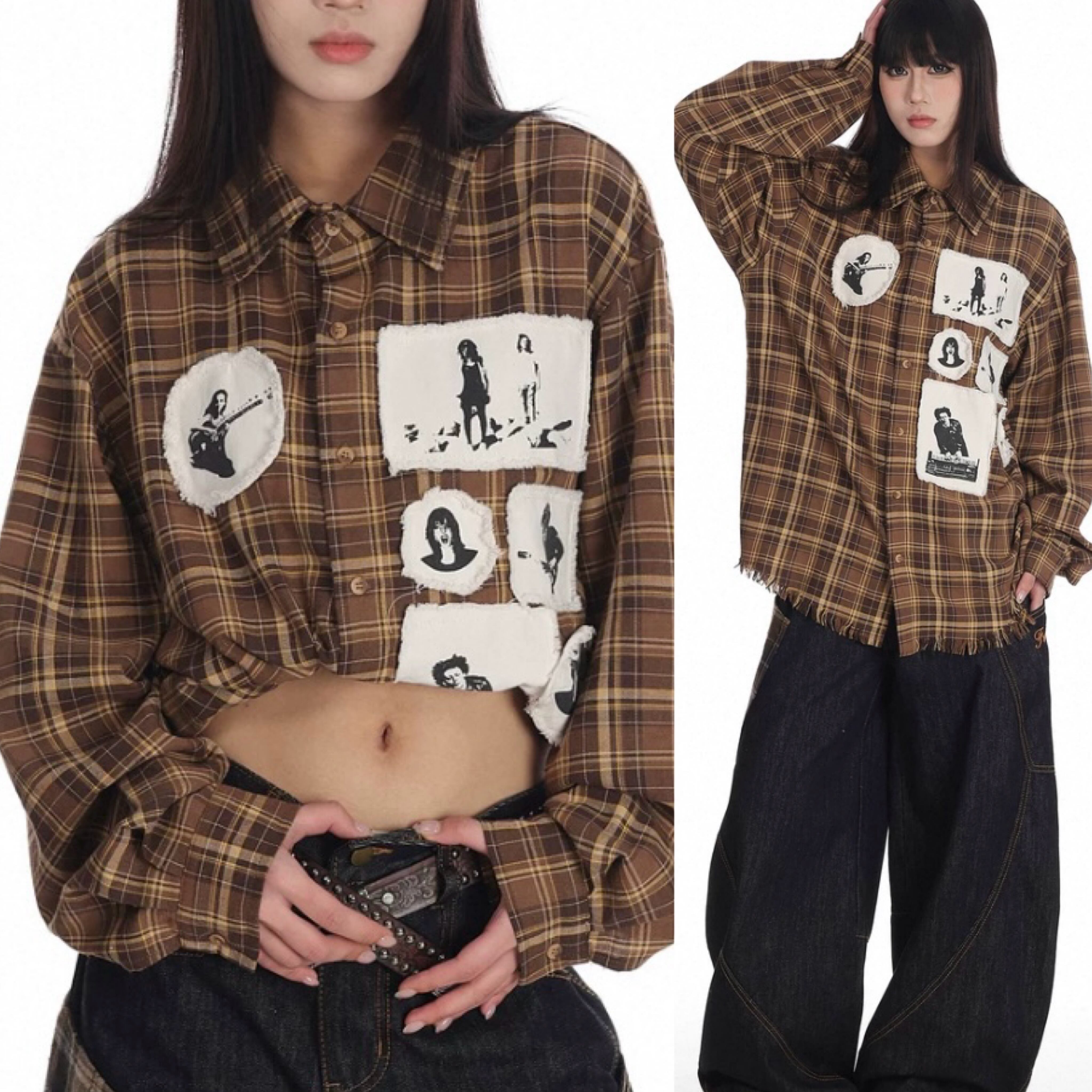 茶色、トップス ブラウス、シャツ XL チェック、ネルシャツ、ギンガム チェック ロック ワッペン プリント
