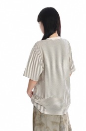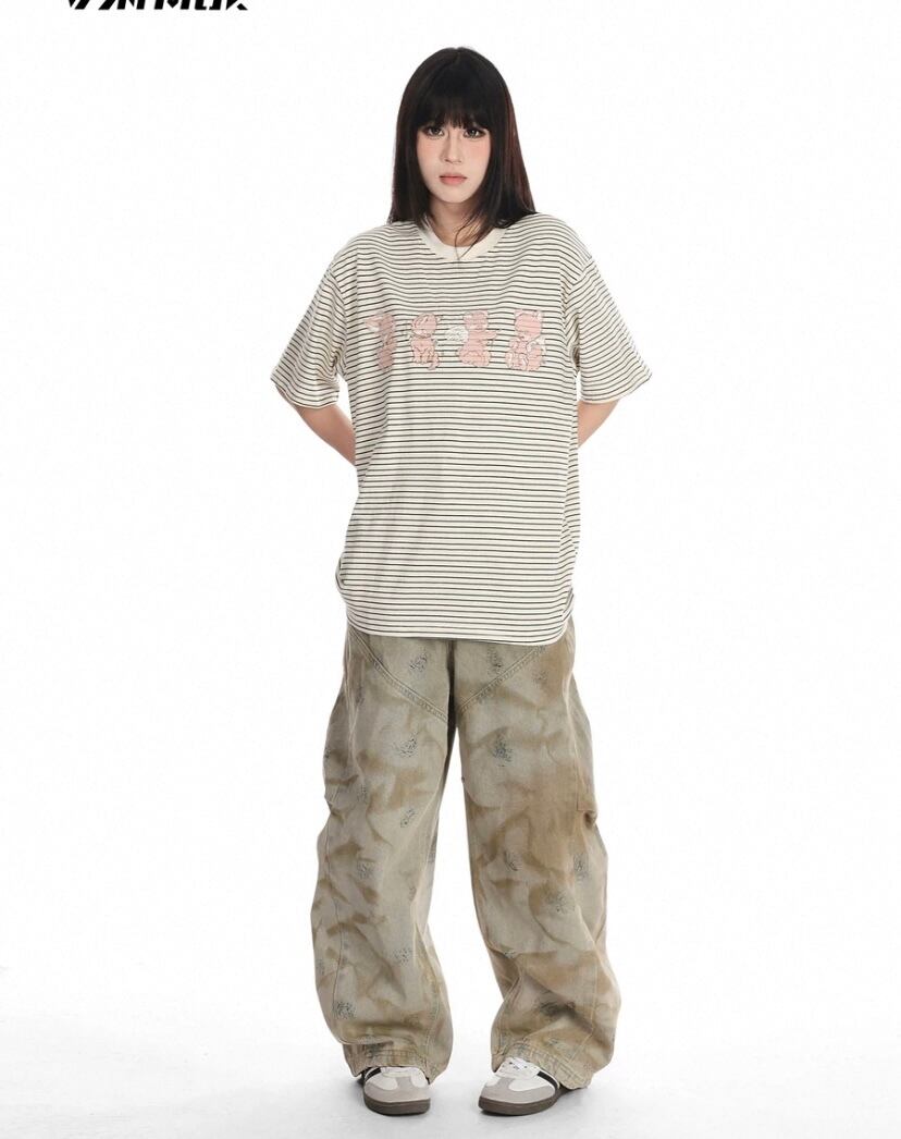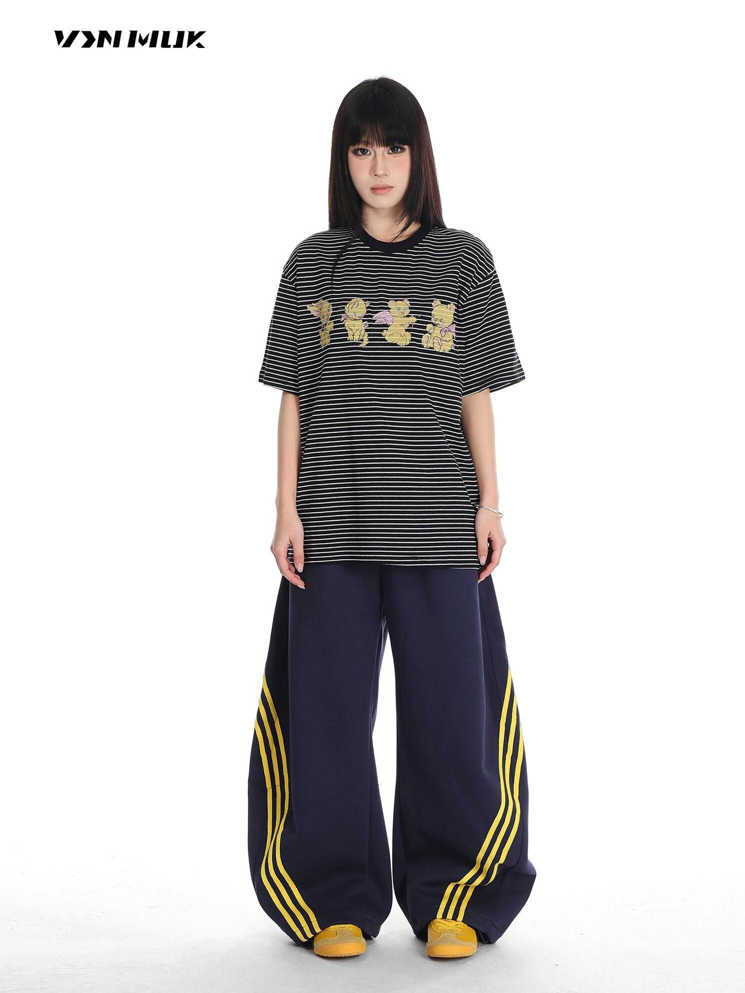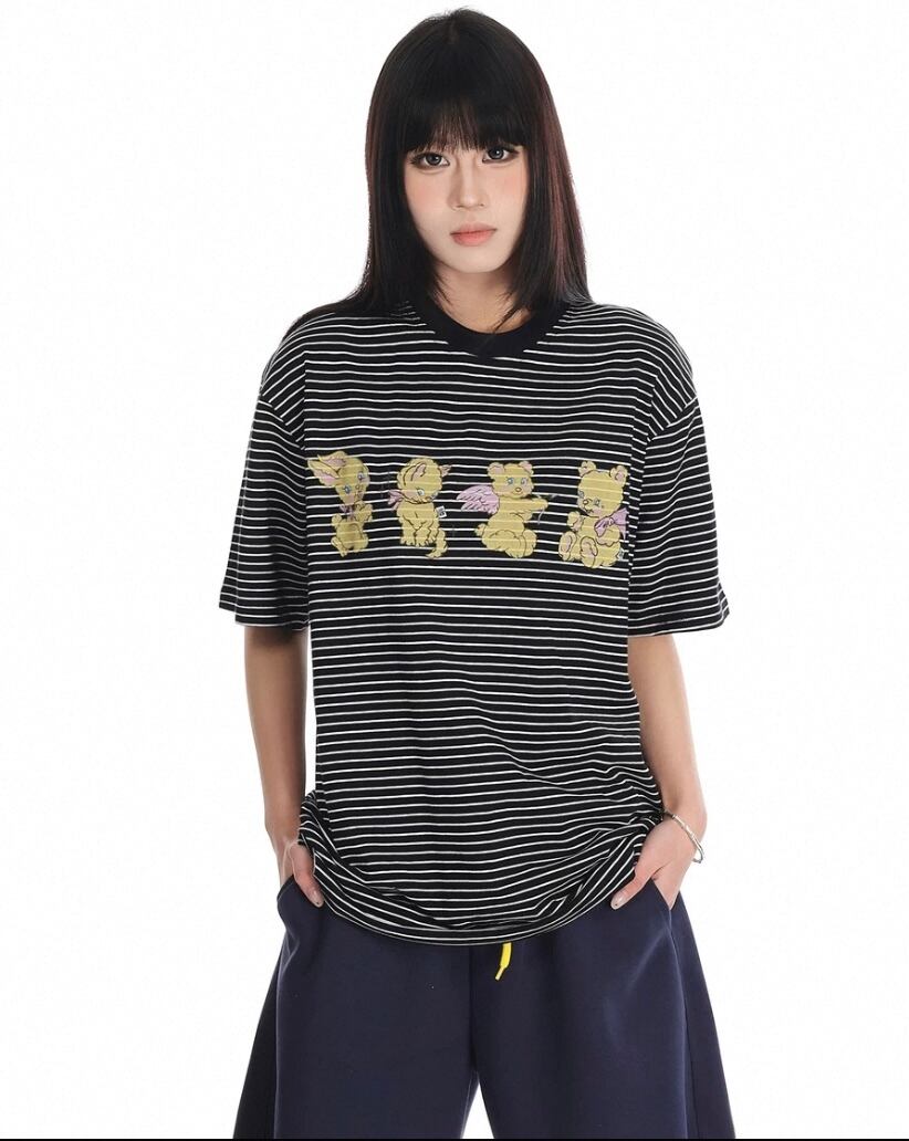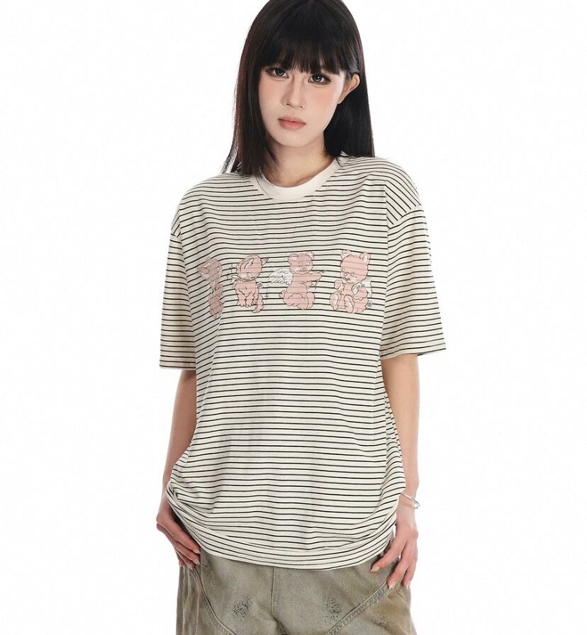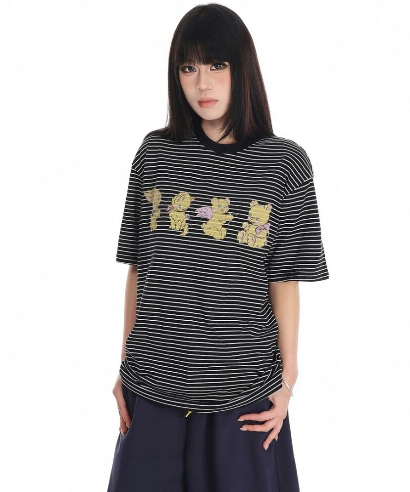 黒 くま、黒 熊、白 ストライプ、ボーダー ピンク Tシャツ トップス カジュアル かわいい