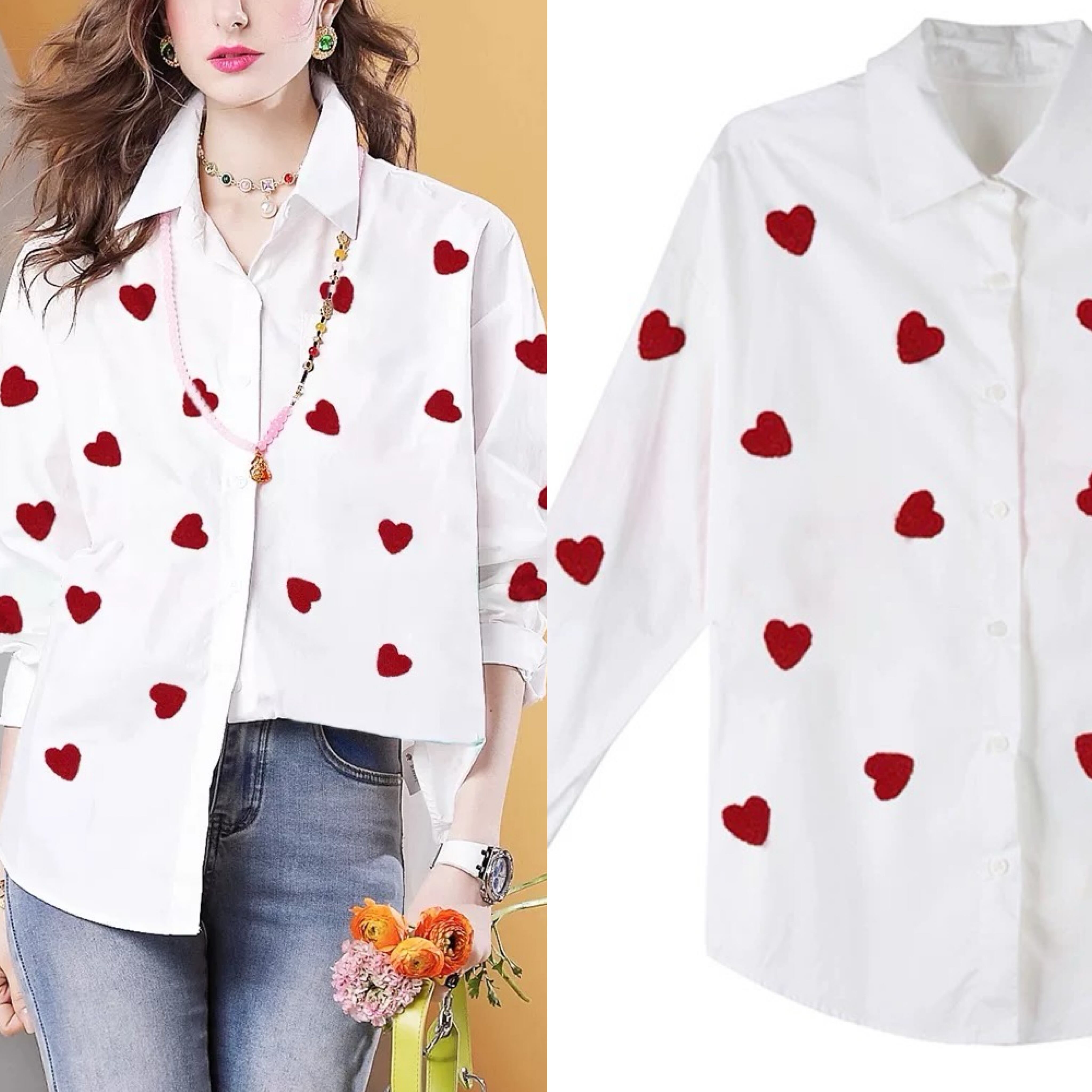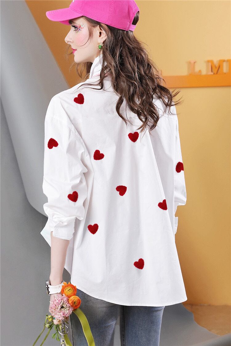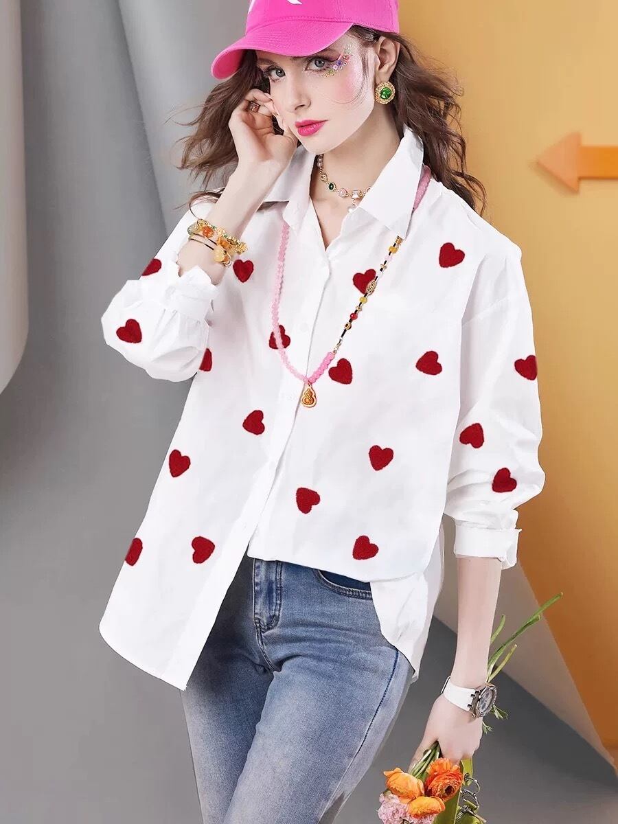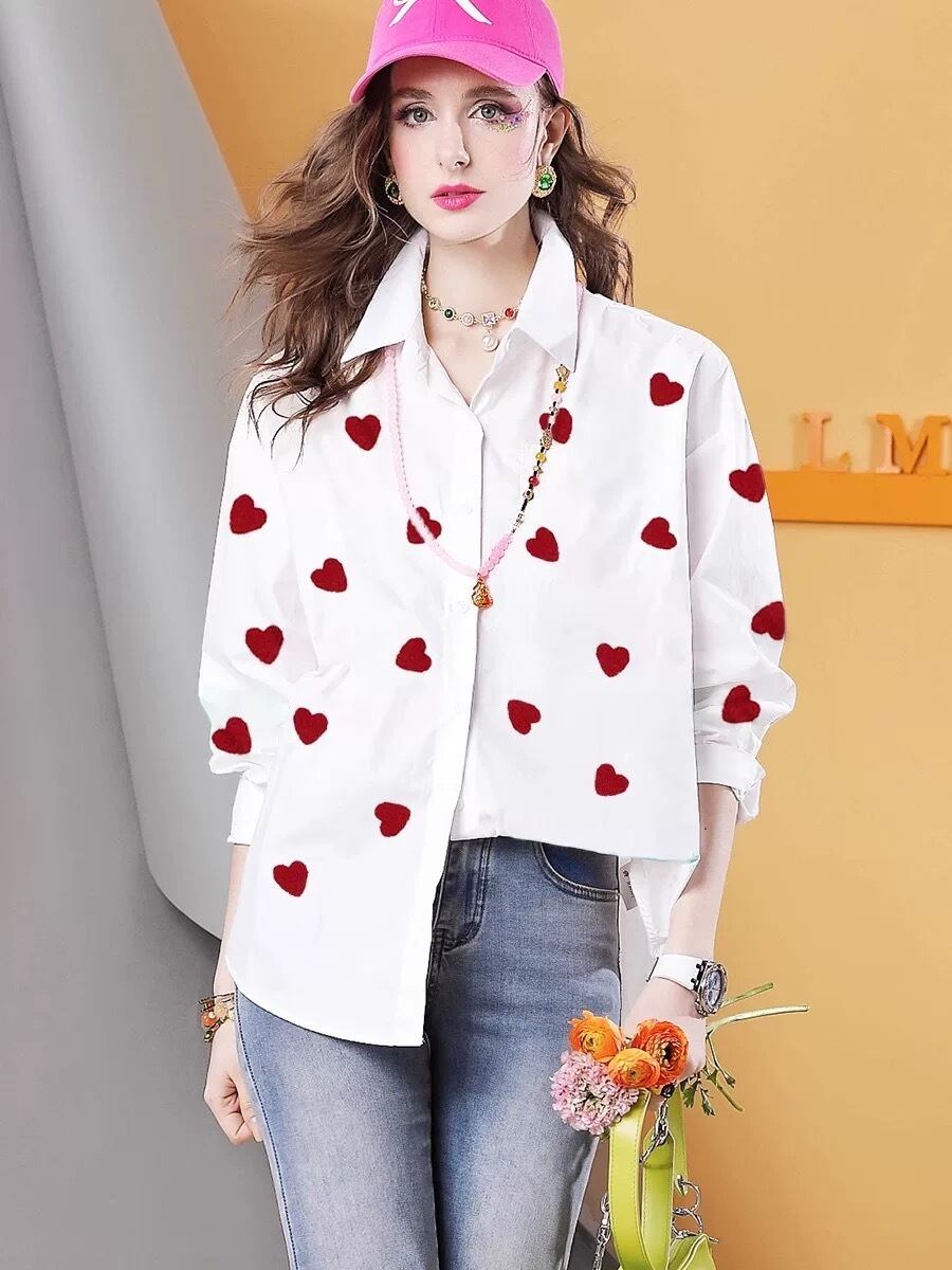 白 トップス シャツ、ハート 赤 カジュアル、かわいい エレガント、シンプル、爽やか、ブラウス、XL銀座 表参道、青山 エレガント、マダム、お嬢様 かわいい