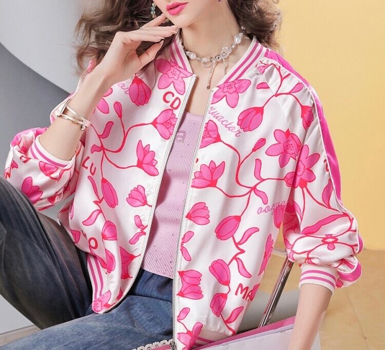 ピンク 花柄、白 ジャケット、ジャンバー、ブルゾン ジャージ フラワー XL 花柄
