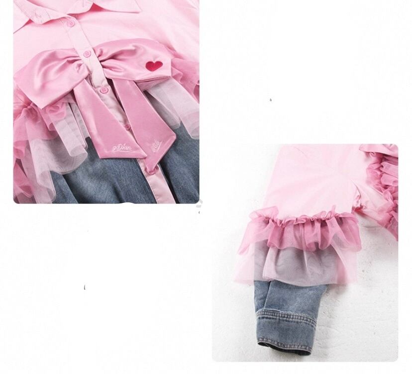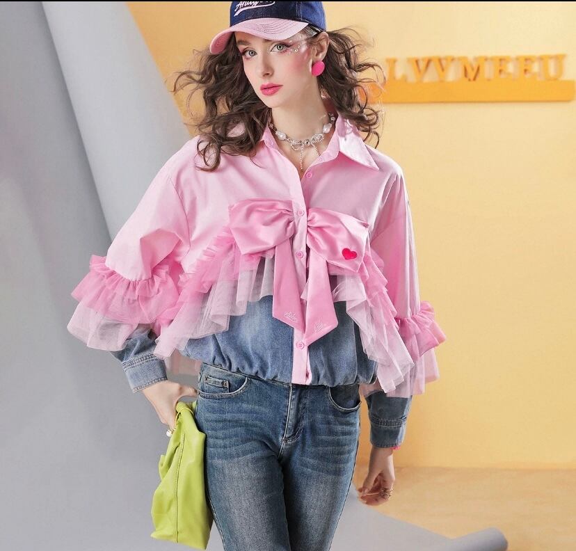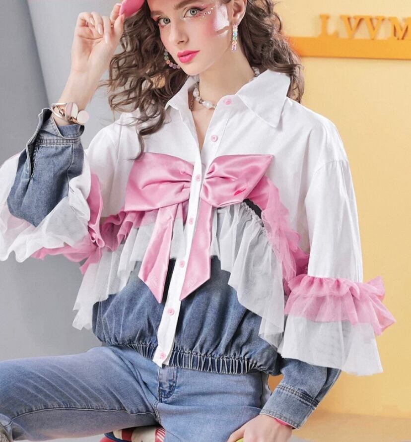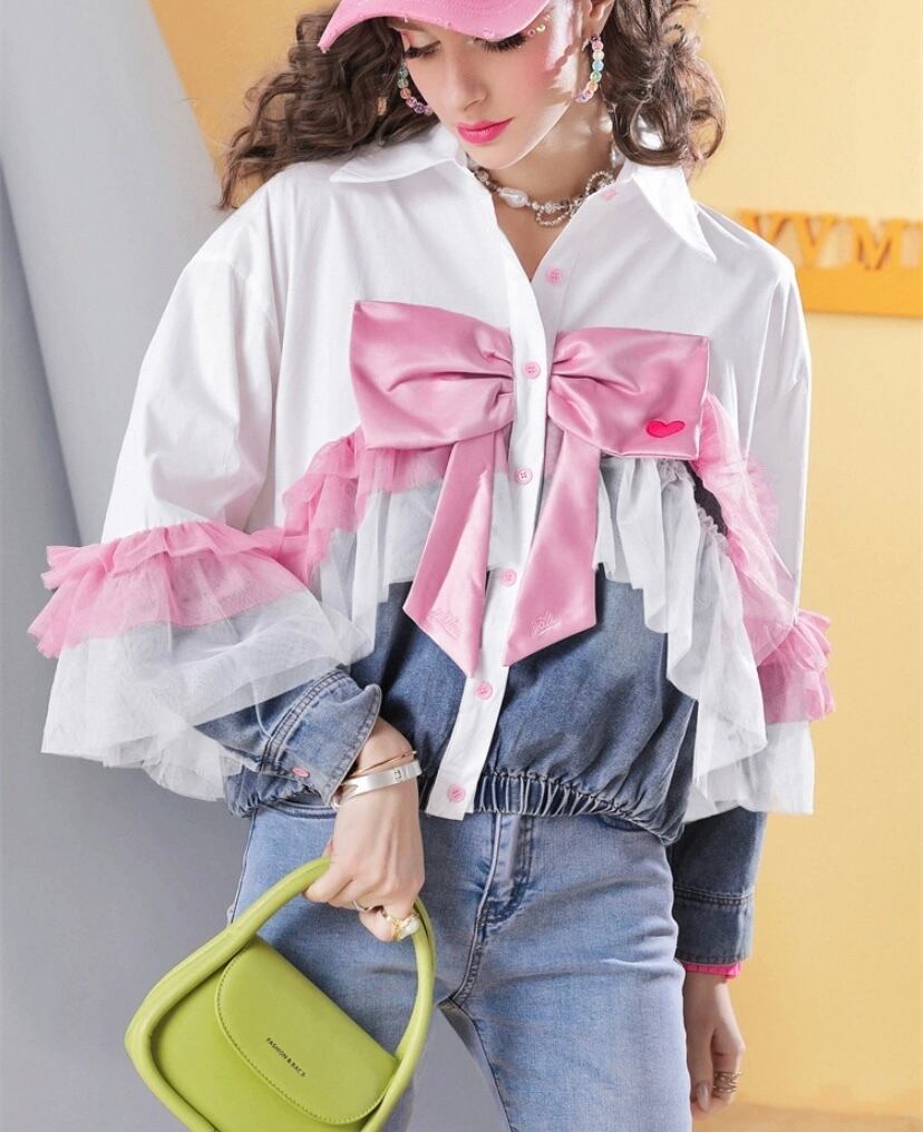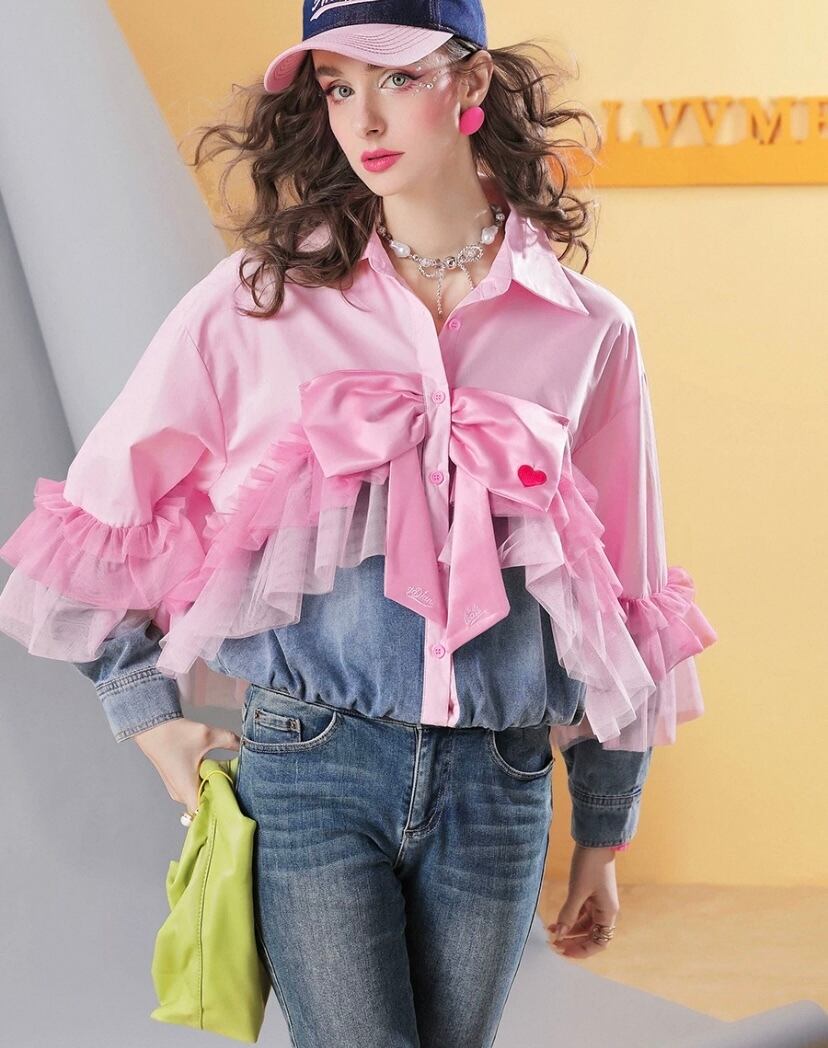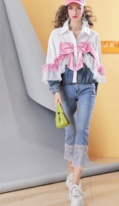 ピンク、白、リボン 可愛い ガーリー 姫 デニム ジャケット、ブラウス、トップス アウター