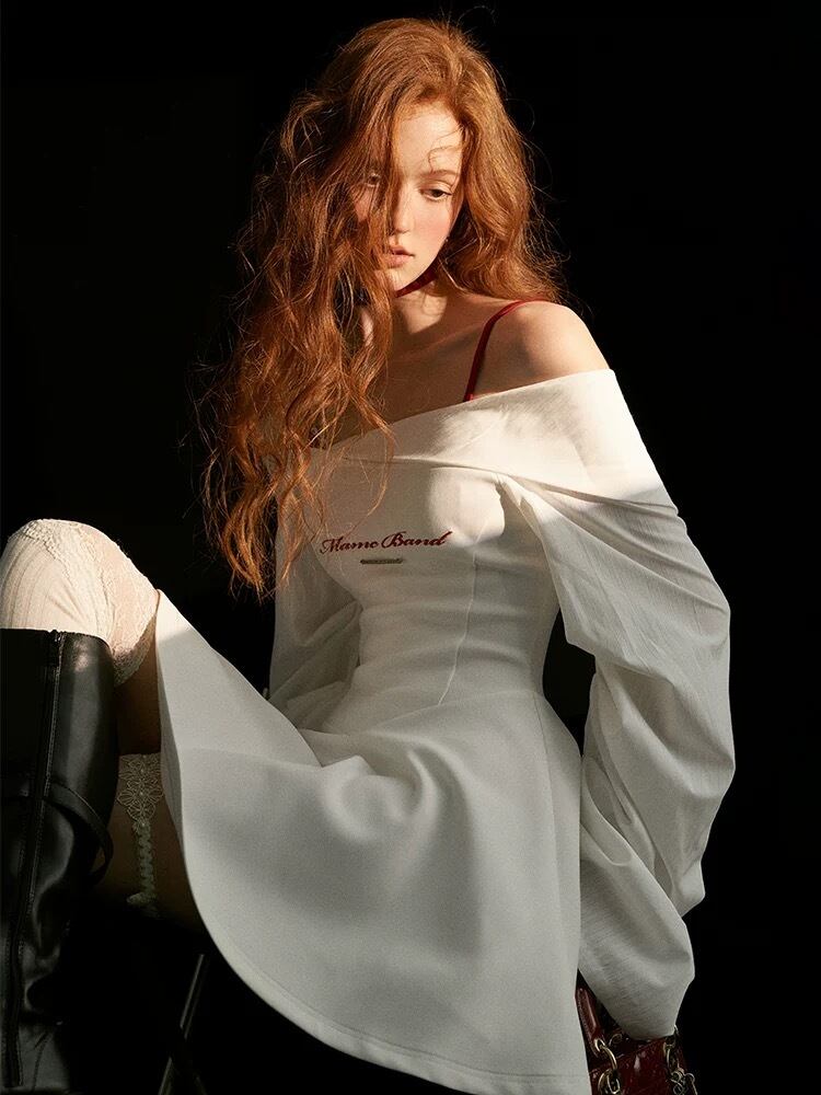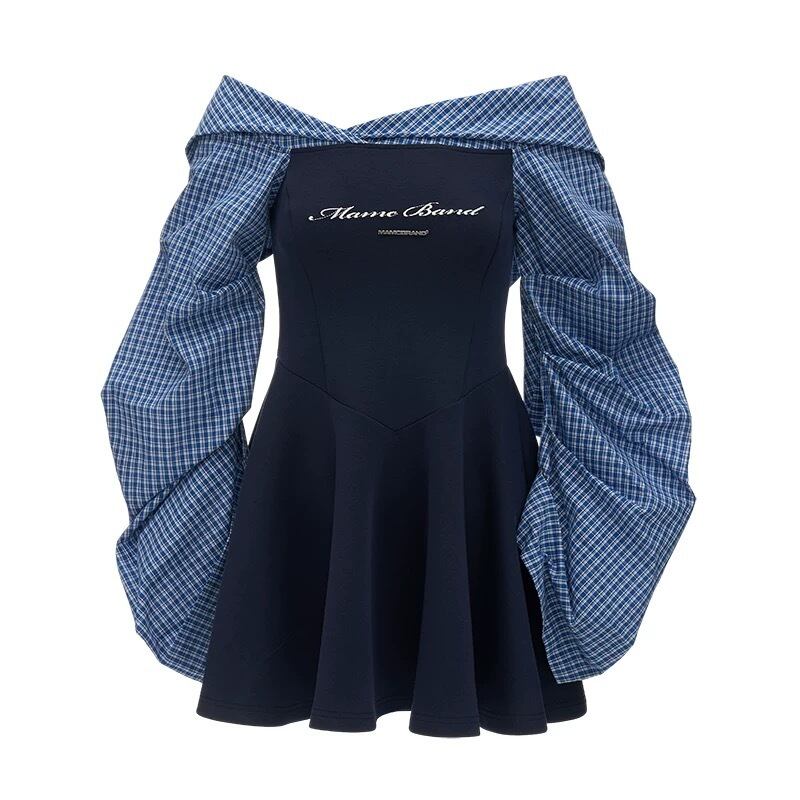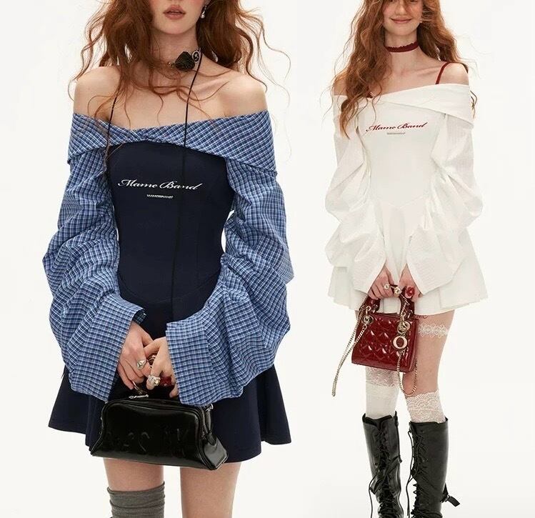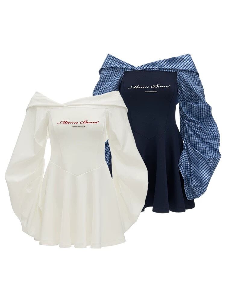 オフショルダー、ネイビー、白、カジュアル スポーティー ワンピース、ガーリー かわいい