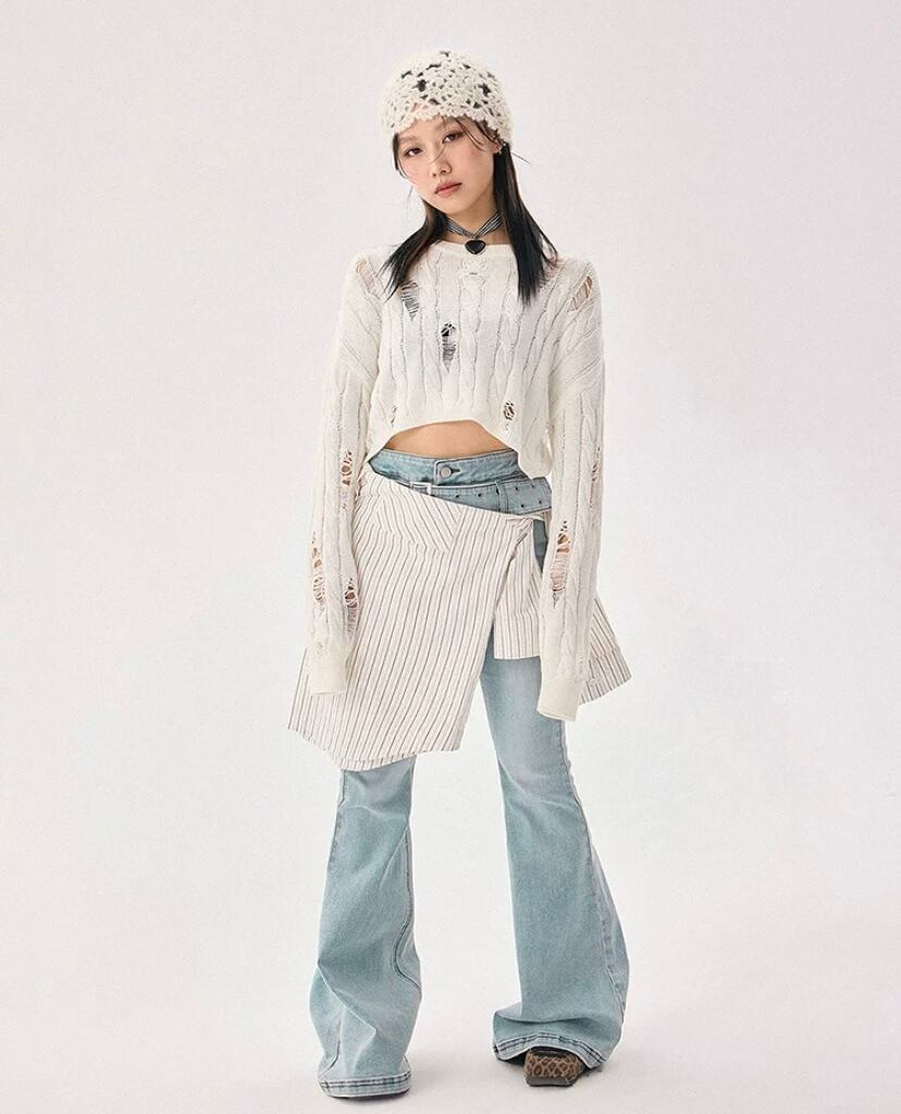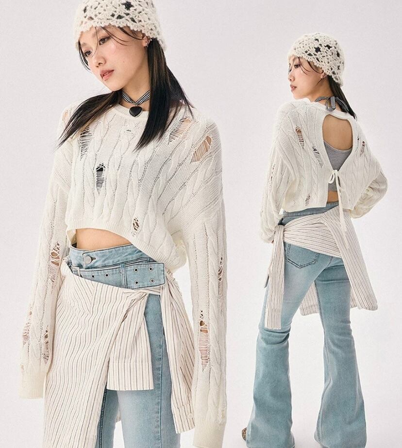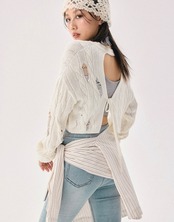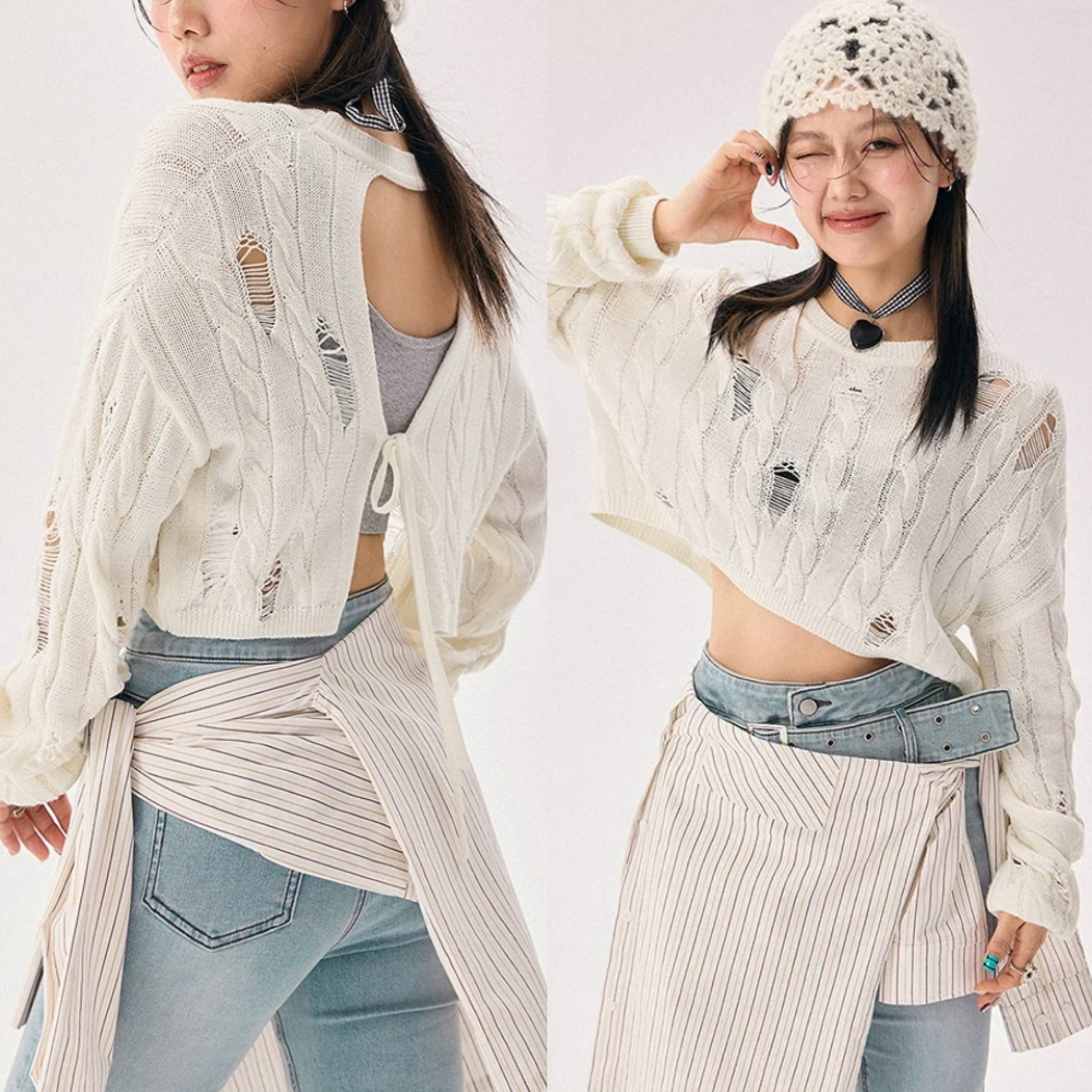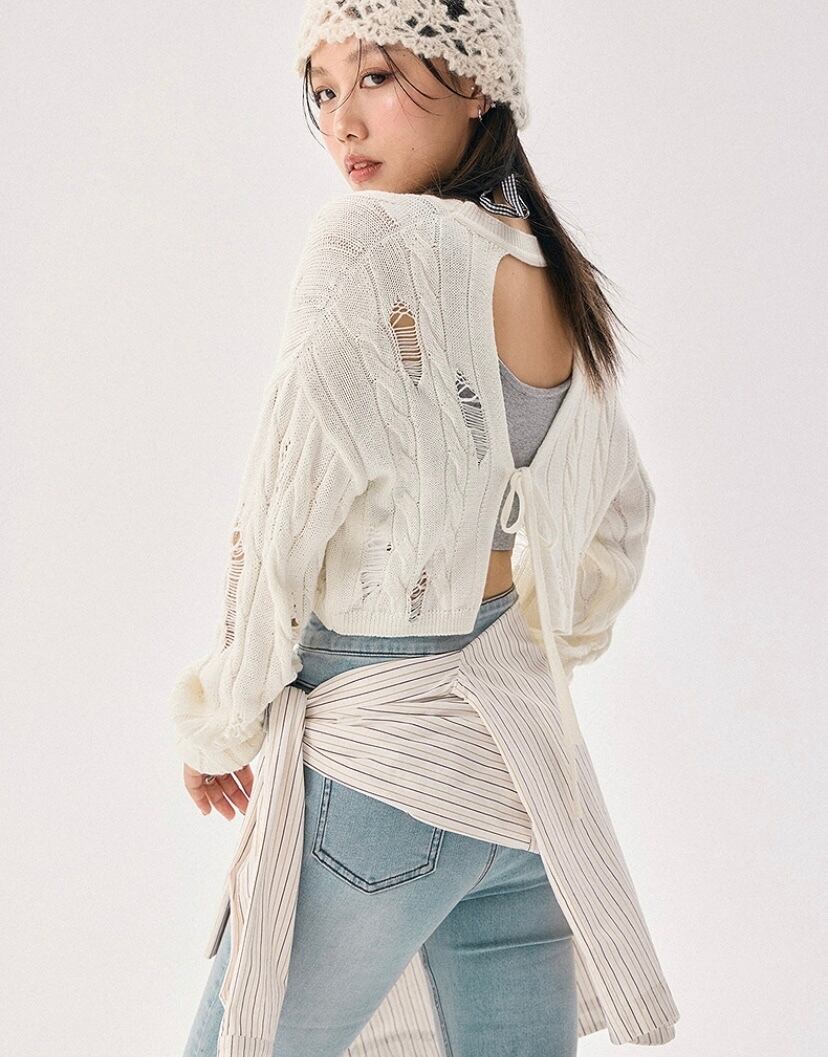白 あみあみ、メッシュ ニット、トップス、リボン、背中、リボン、カーディガン、トップス ブラウス
