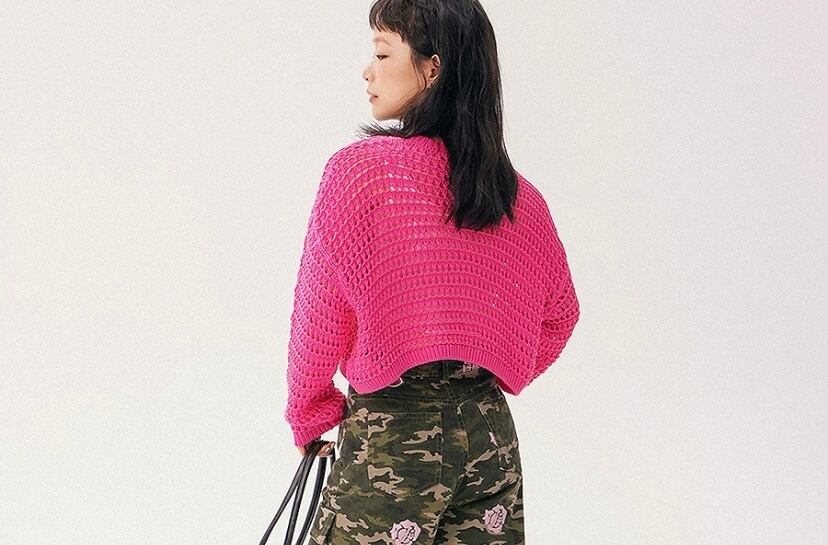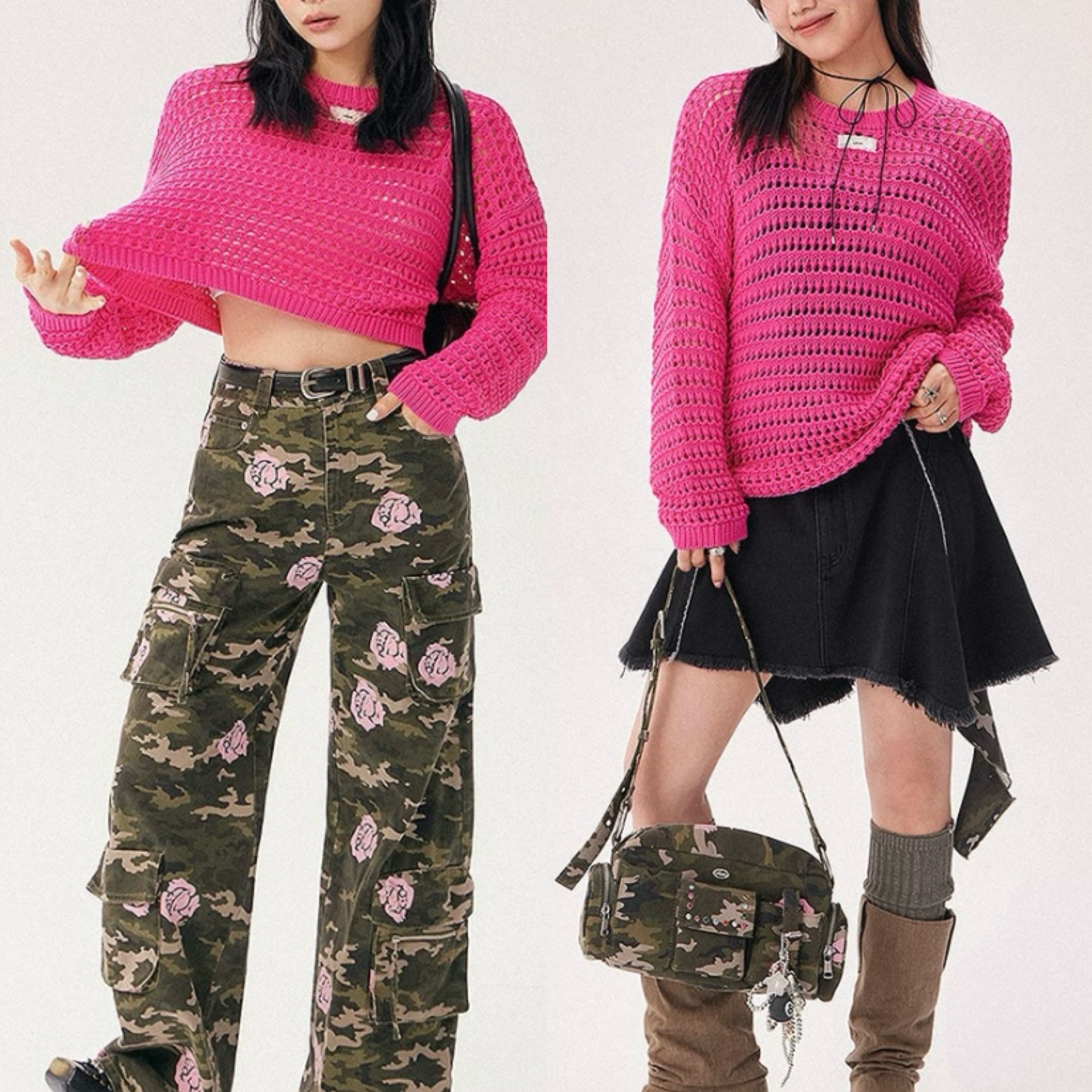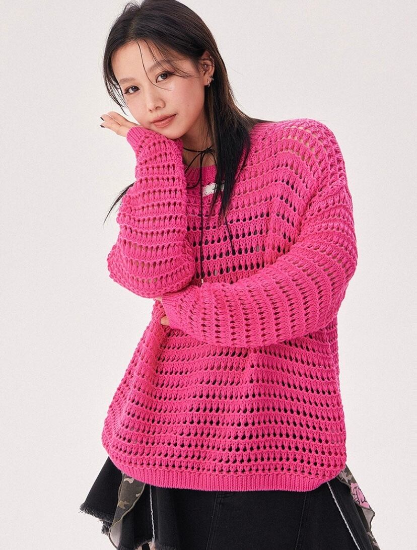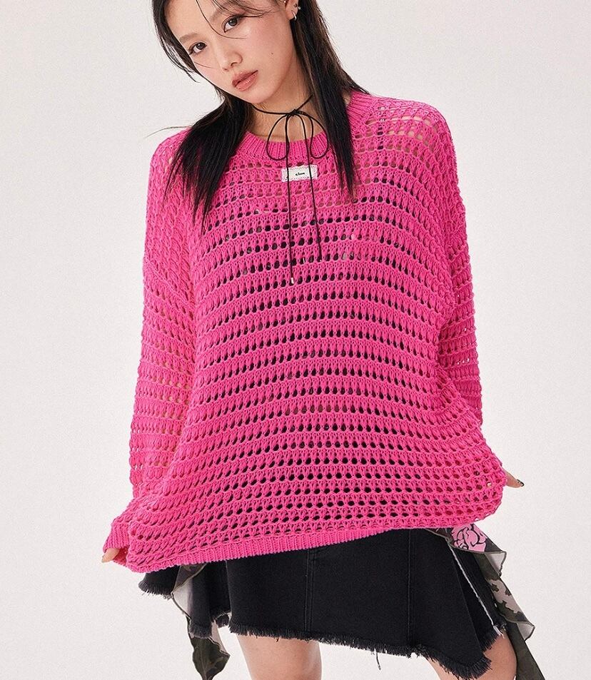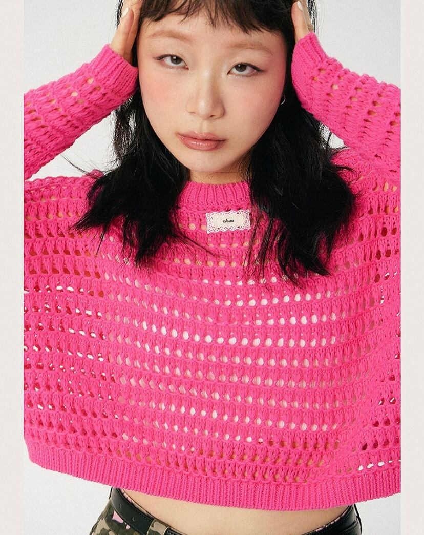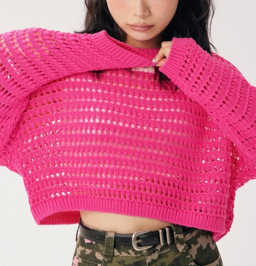 メッシュ、ピンク、ショート、Y2K、カジュアル、セーター、カーディガン、トップス、ブラウス、あみあみ