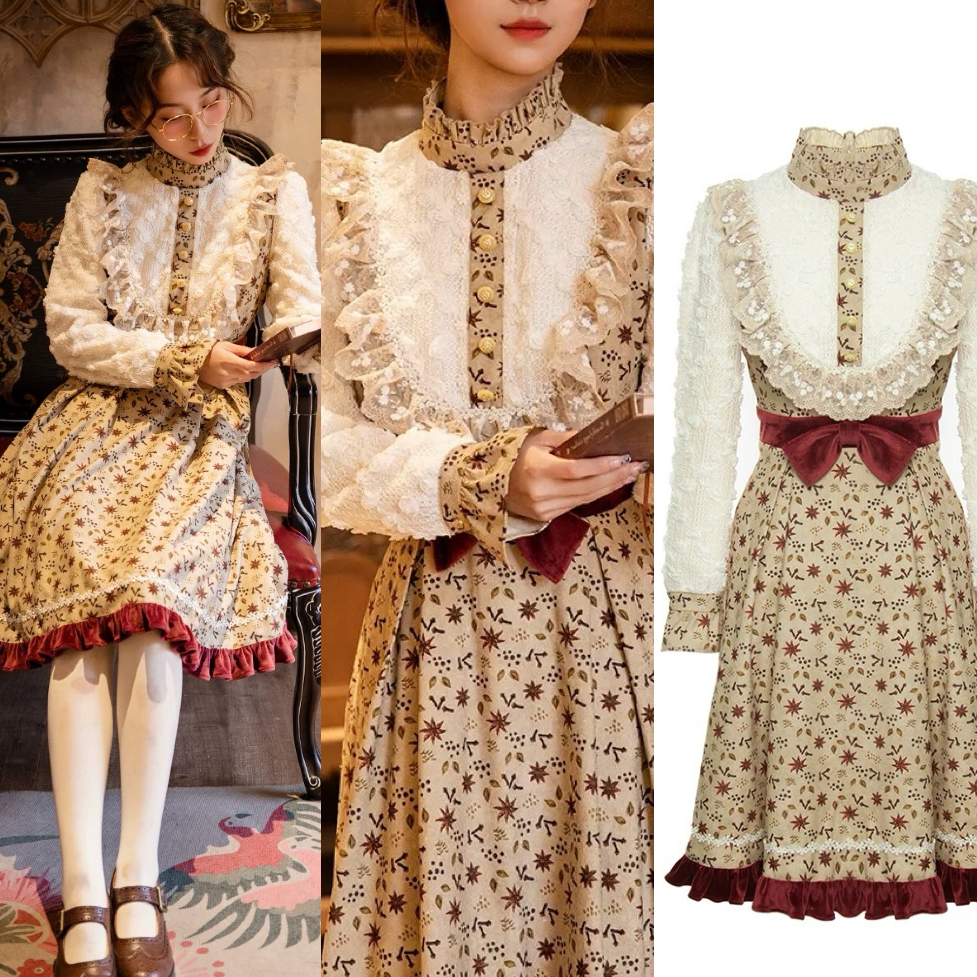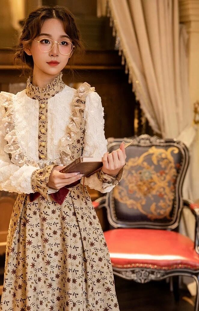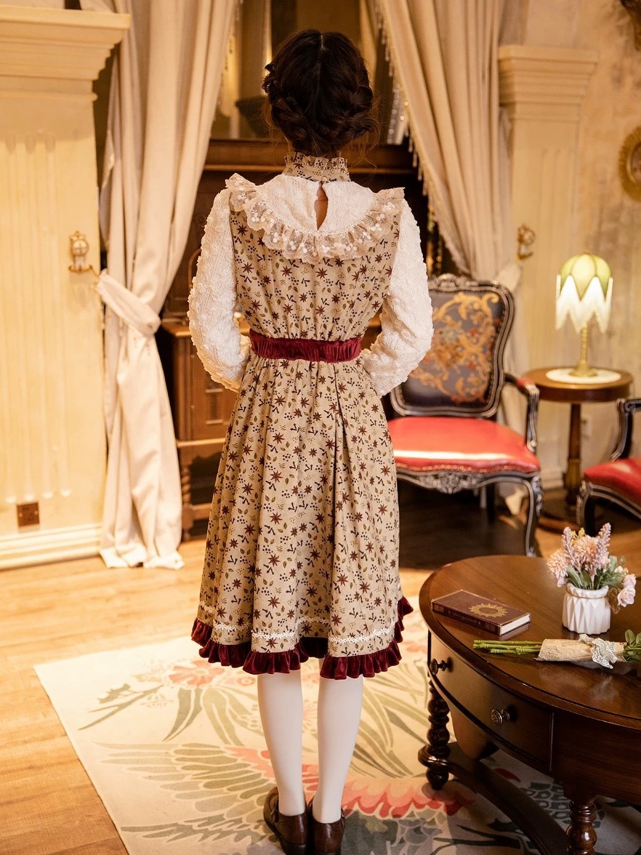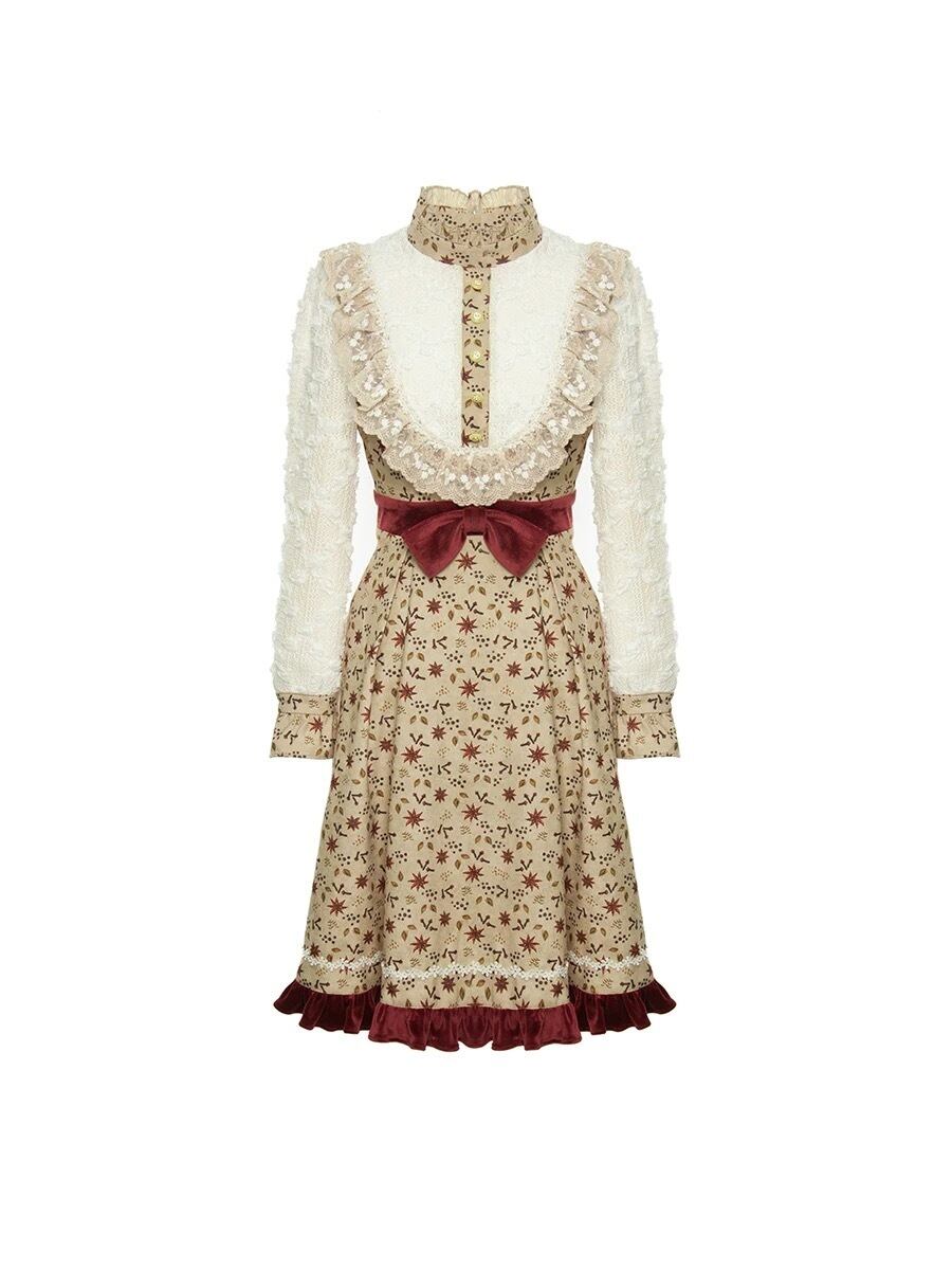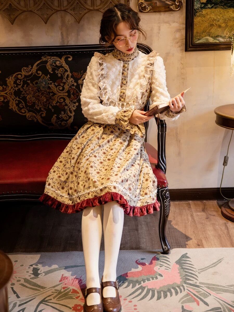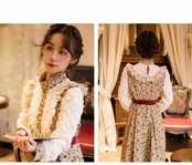 ガーリー 花柄、お嬢様、フレア リボン、赤 小花 フラワー かわいい 姫 ハイネック ブラウス