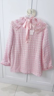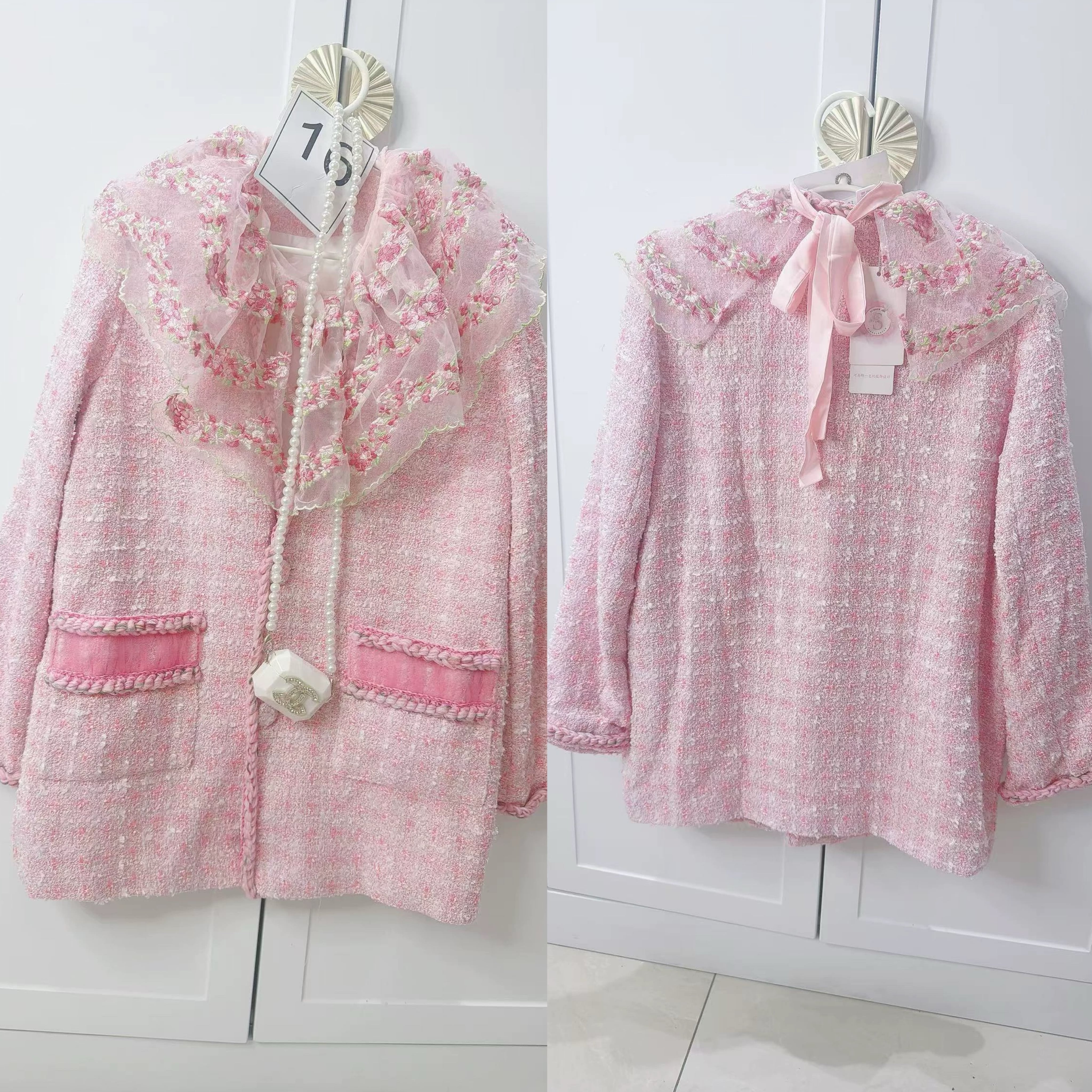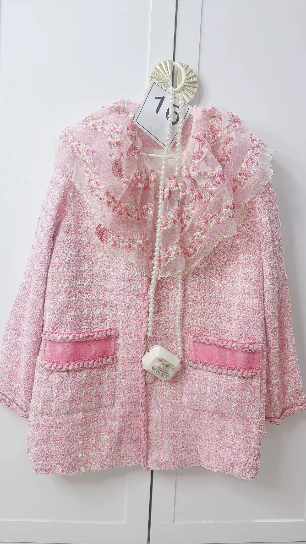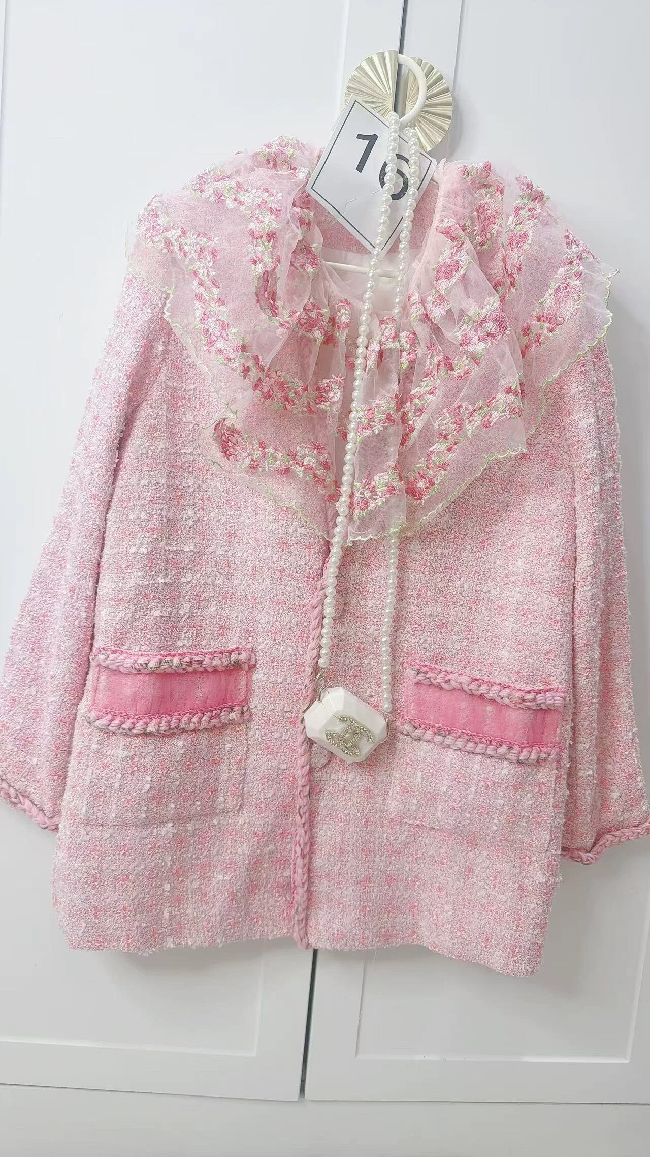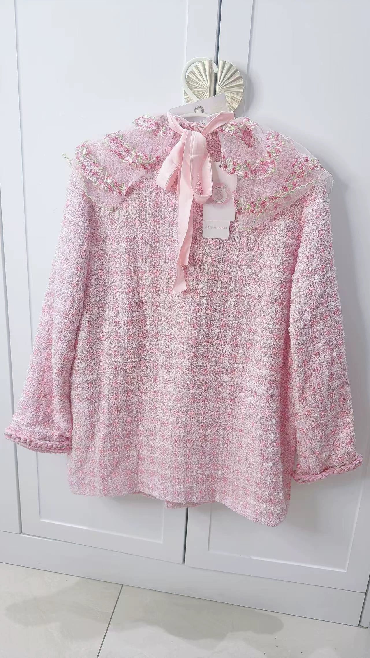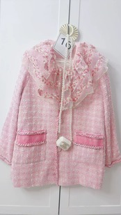 ピンク ジャケット、アウター ポケット 襟 フリル リボン かわいい チェック カーディガン