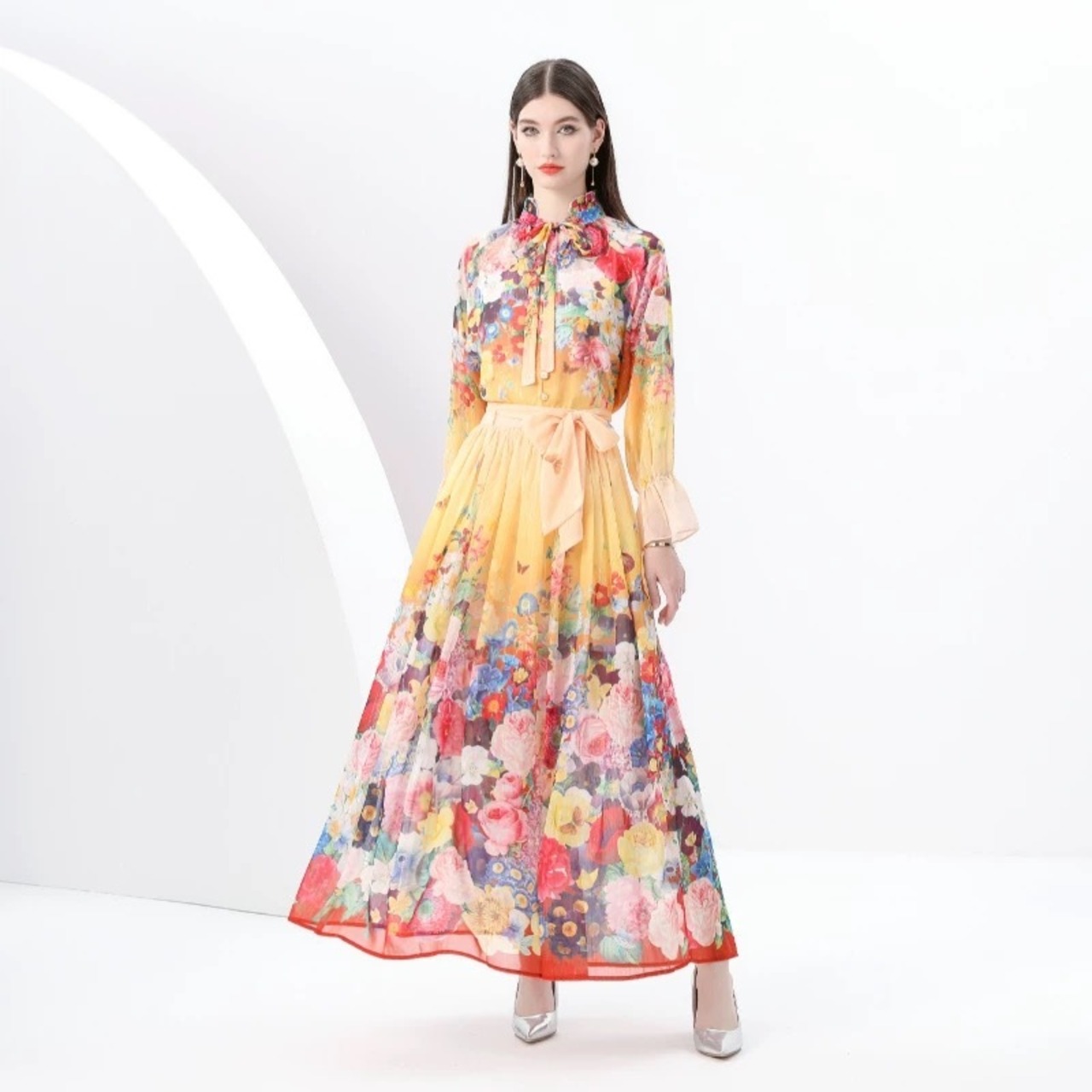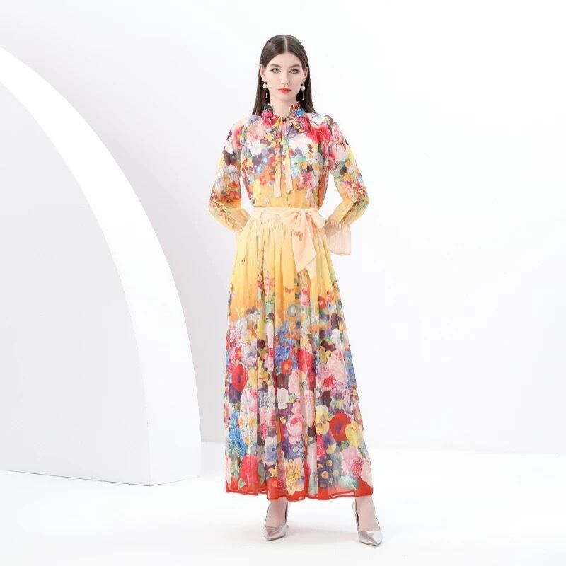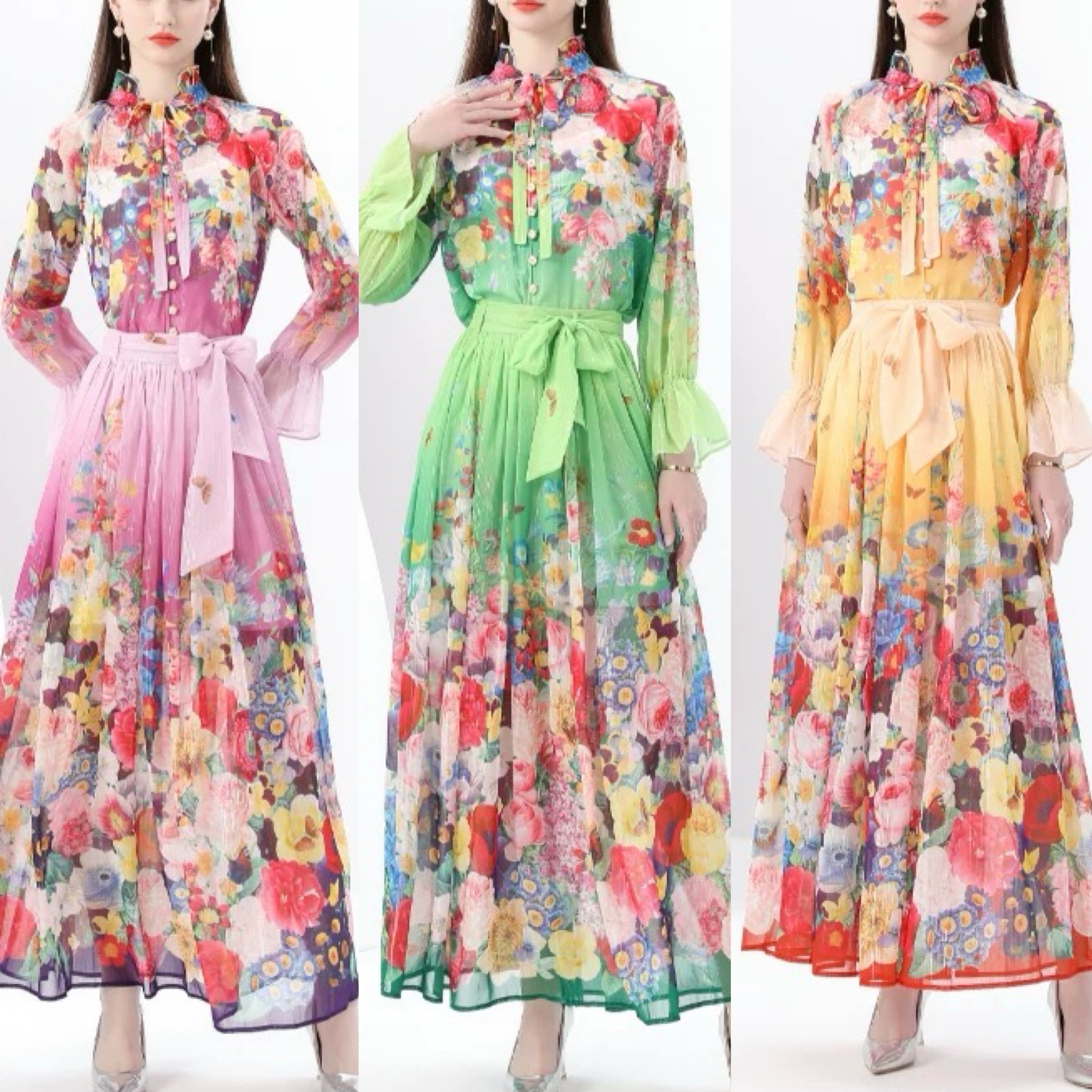黄色 ピンク、緑 花柄 リボン スカート ブラウス ワンピース