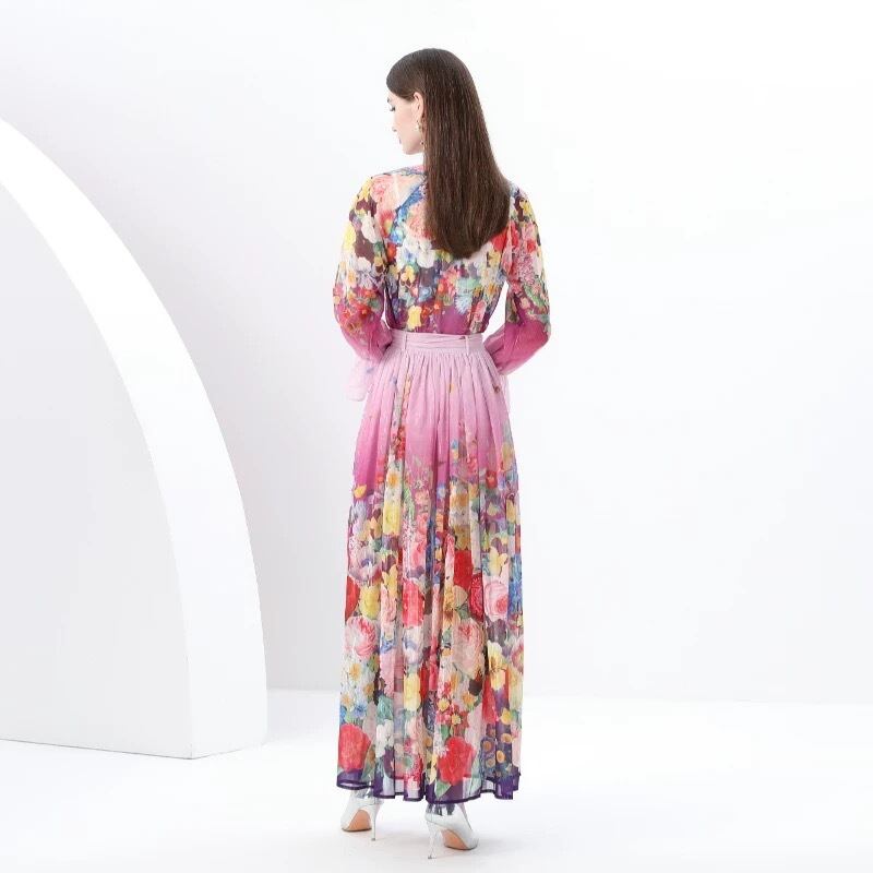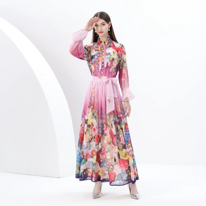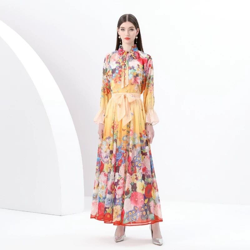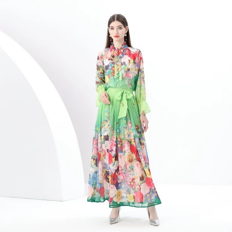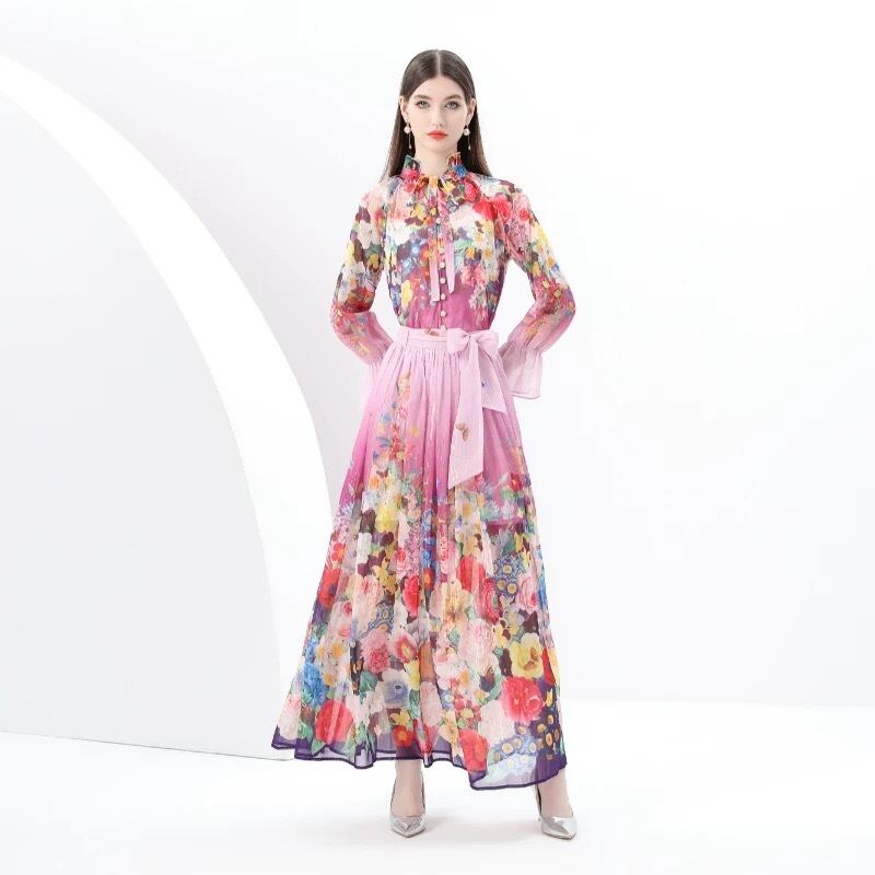 黄色 ピンク、緑 花柄 リボン スカート ブラウス ワンピース