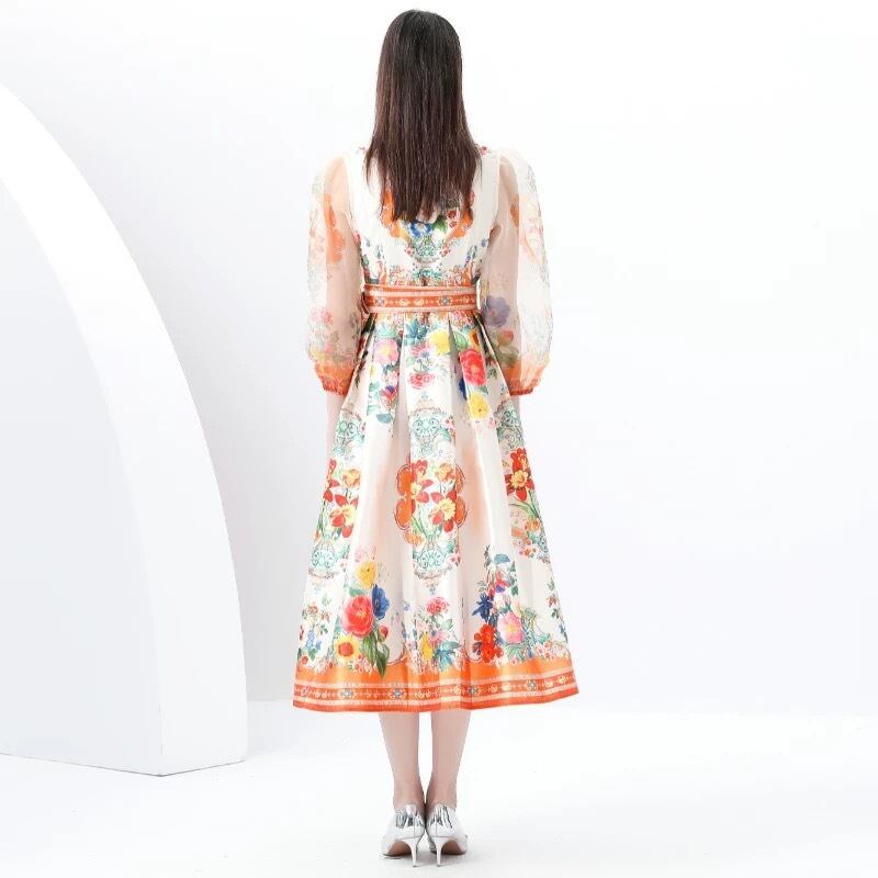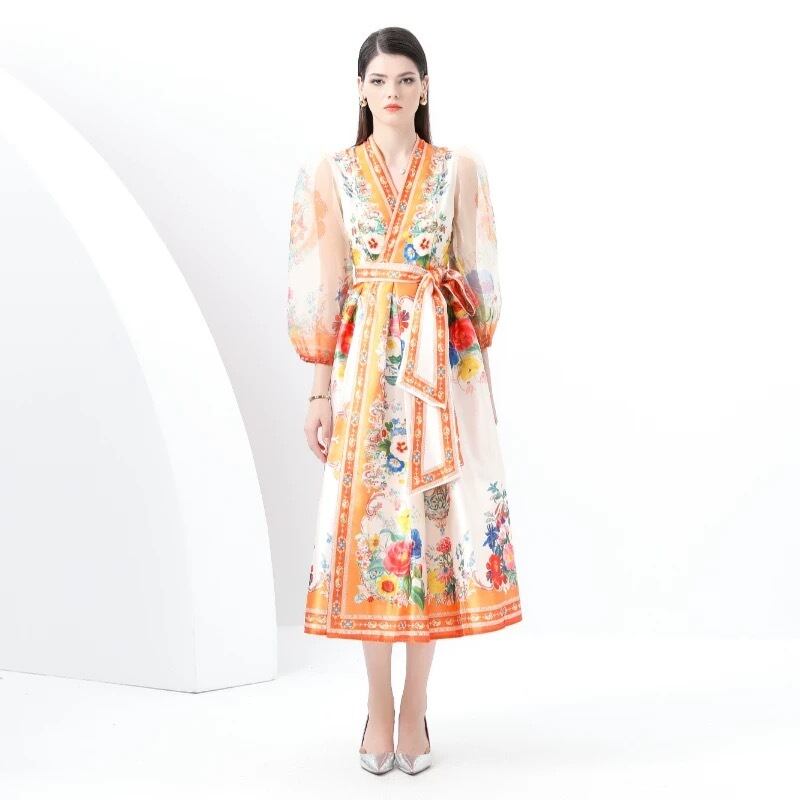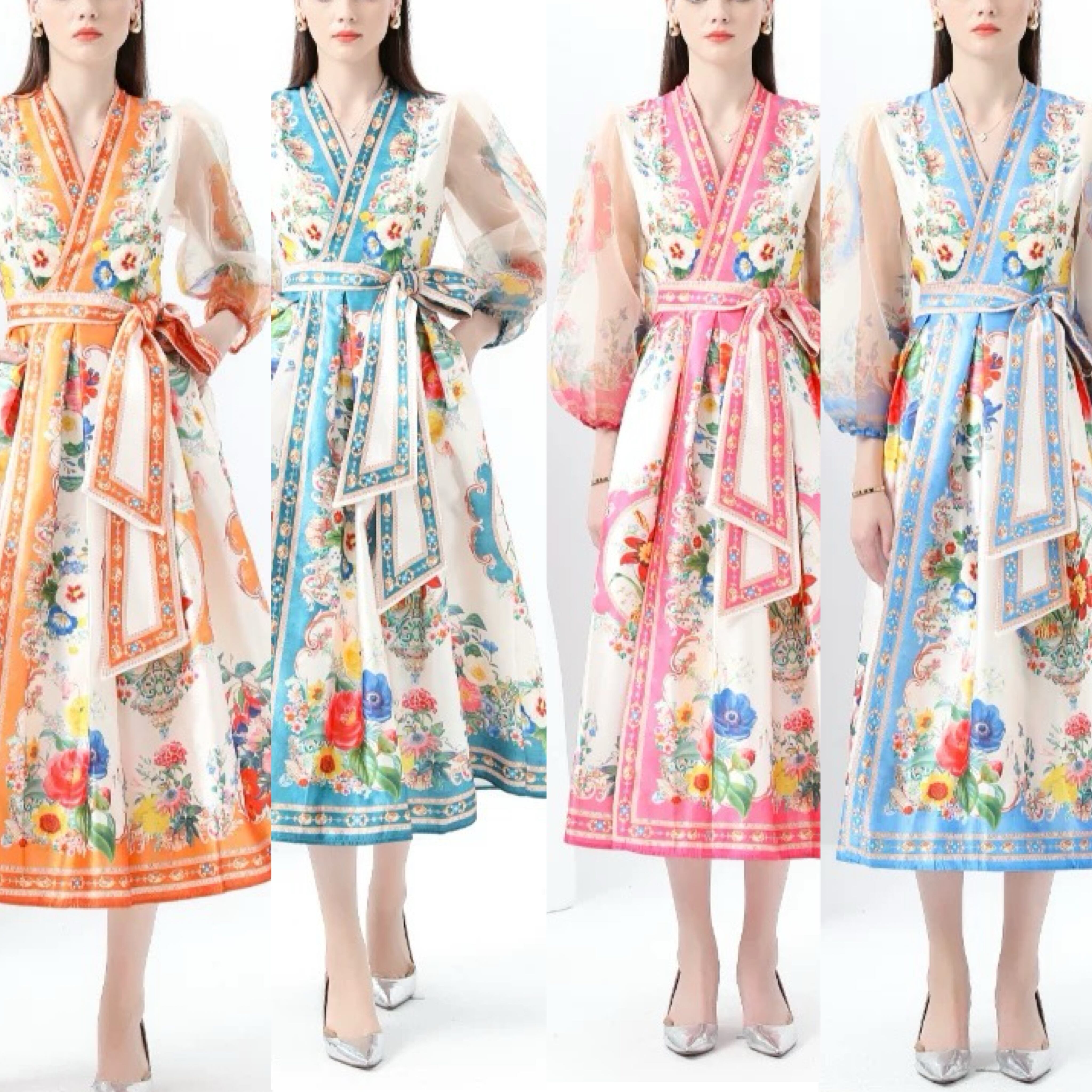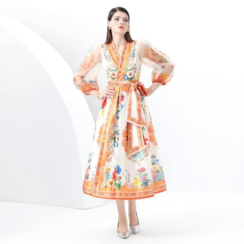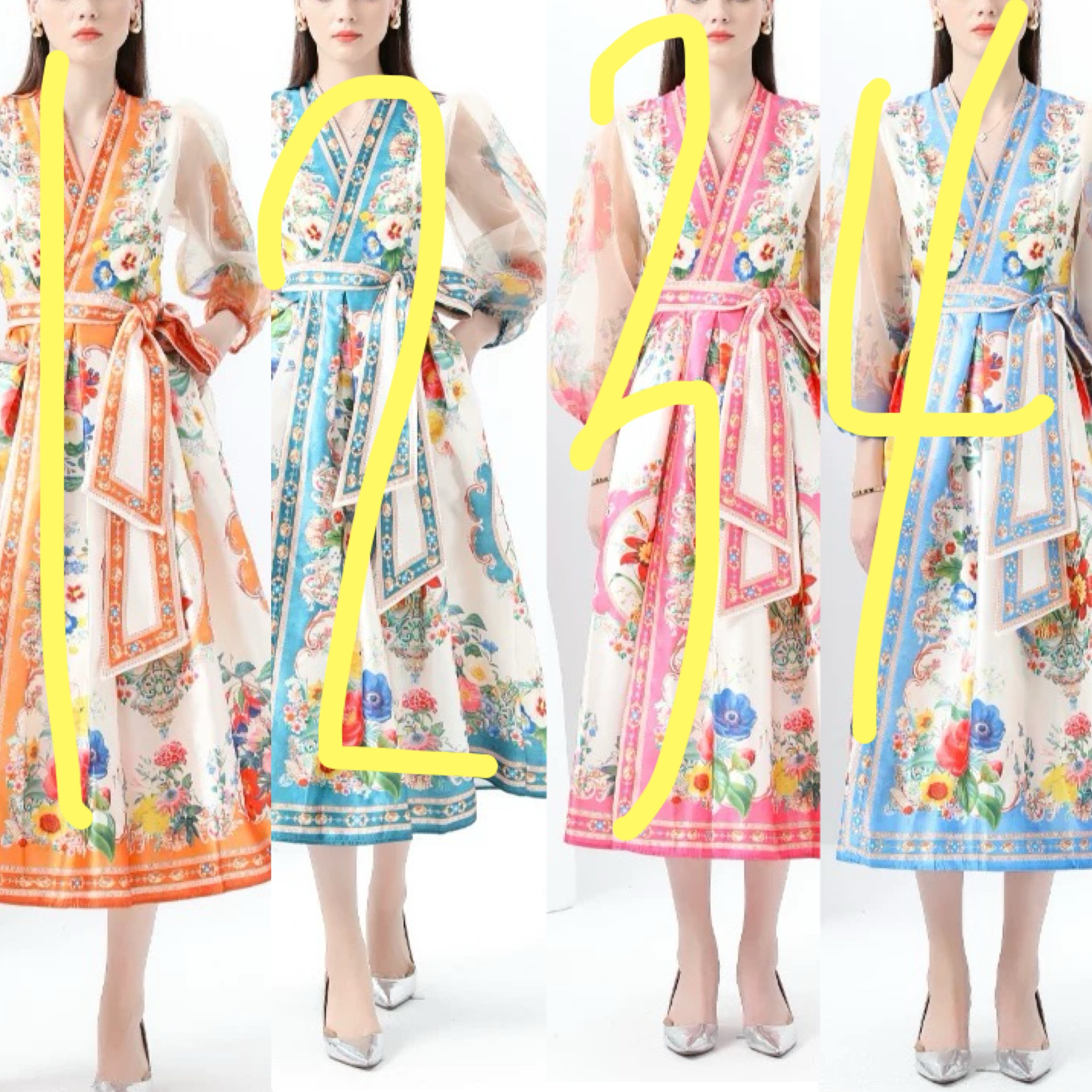 オレンジ、水色、緑、ピンク、エスニック エレガント ワンピース