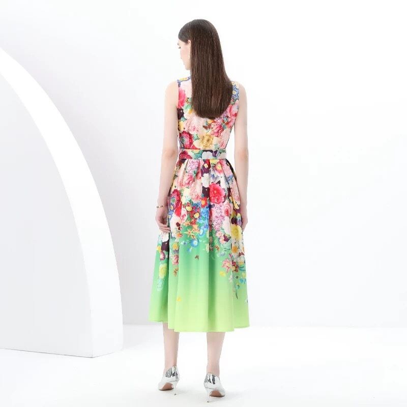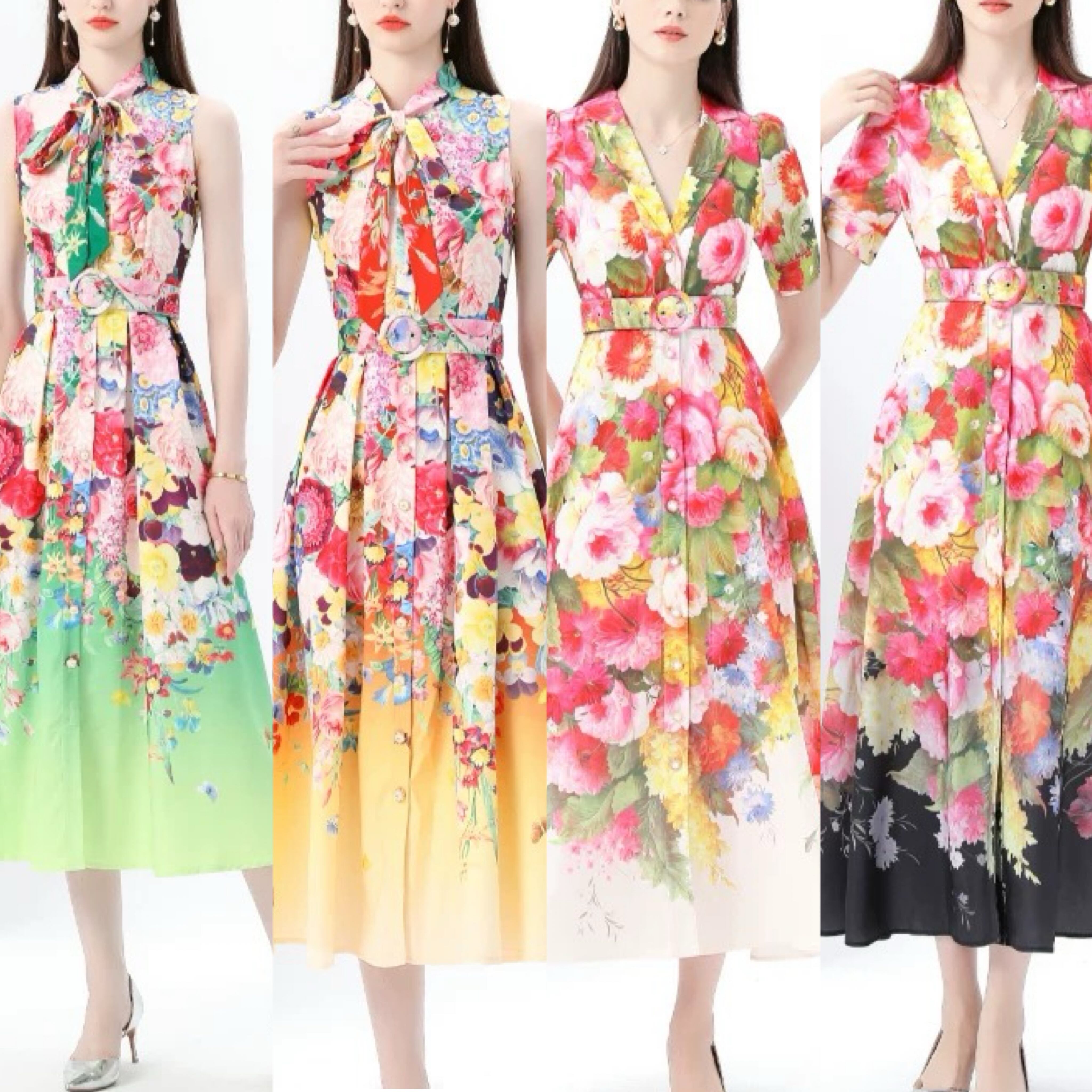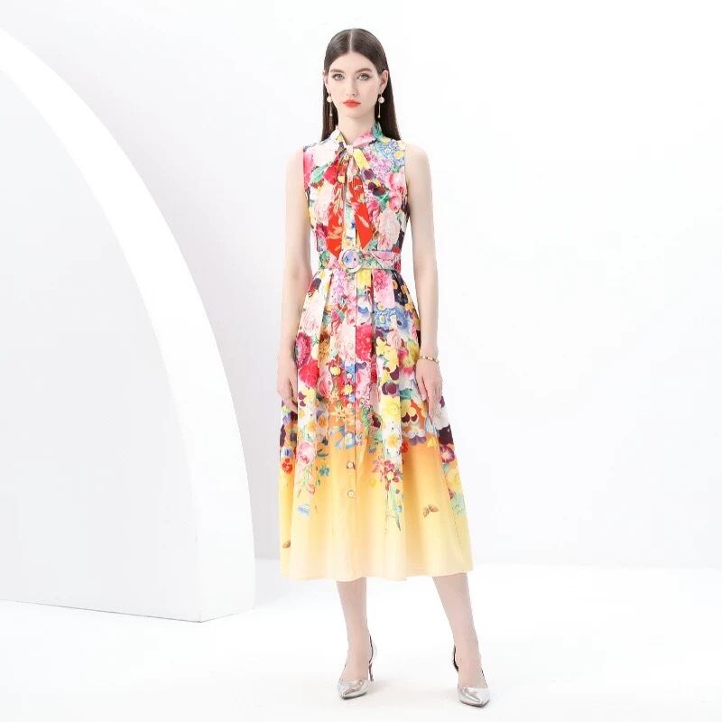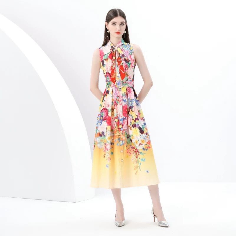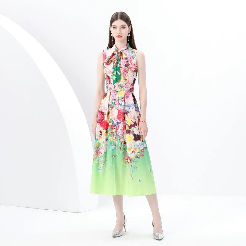 緑 黄色 リボン 花柄 フラワー マキシスカート ワンピース