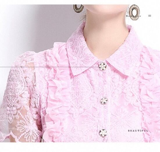 ピンク、黒 ブラウス、トップス、エレガント レース 花柄 白
