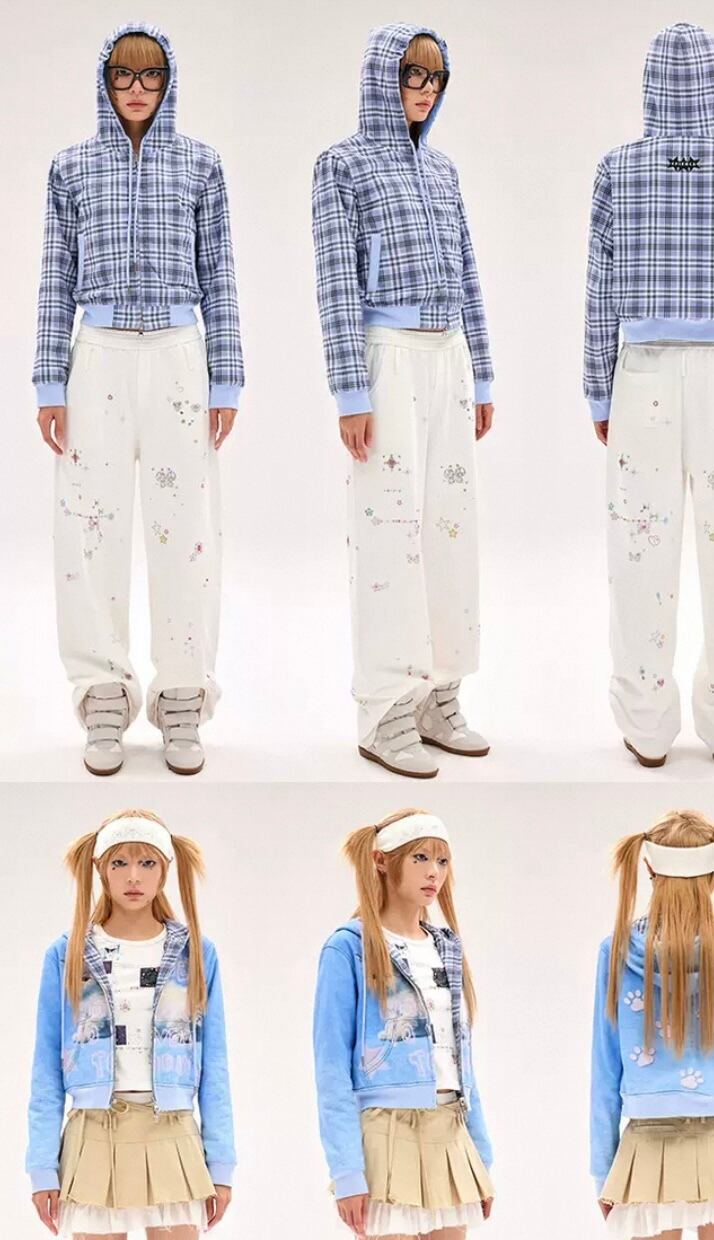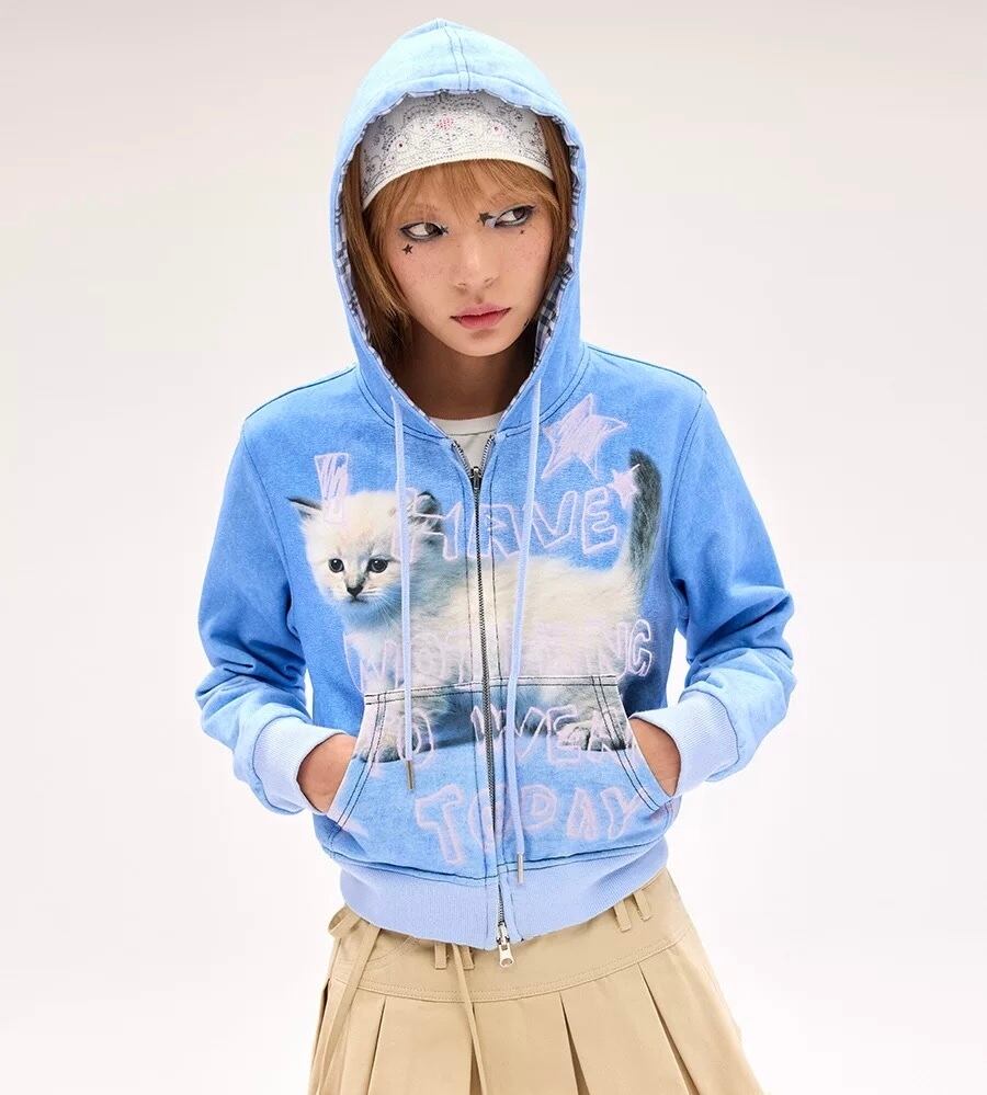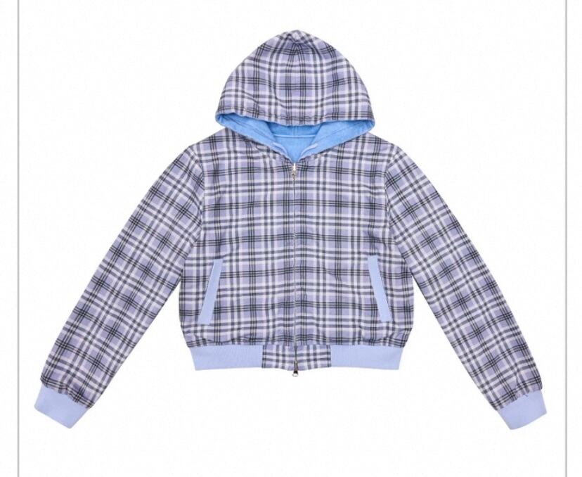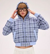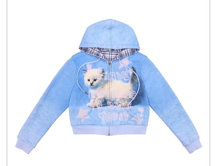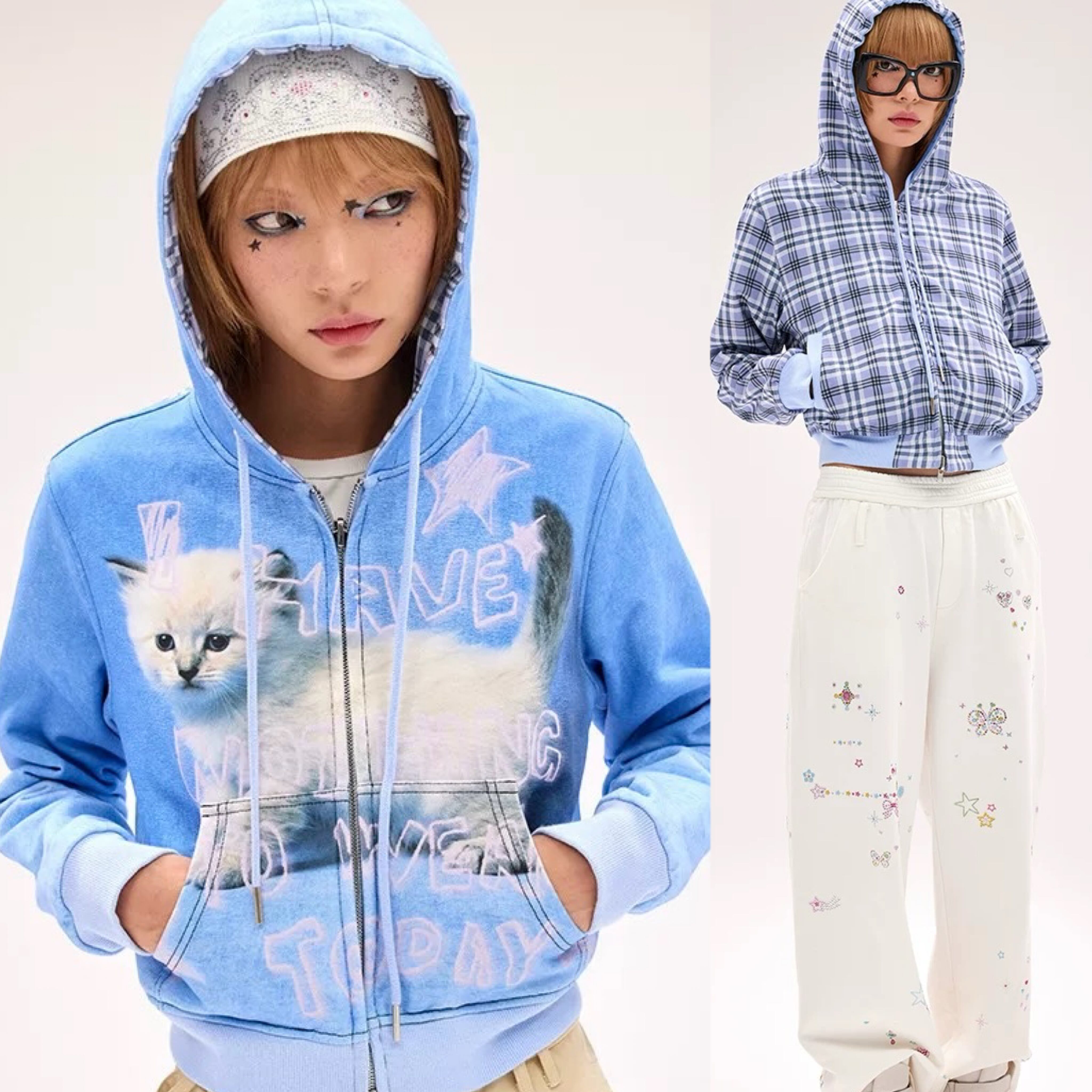 【リバーシブル】水色 白猫 パーカー フード スウェット チェック 水色 グレー トップス アウター スウェット