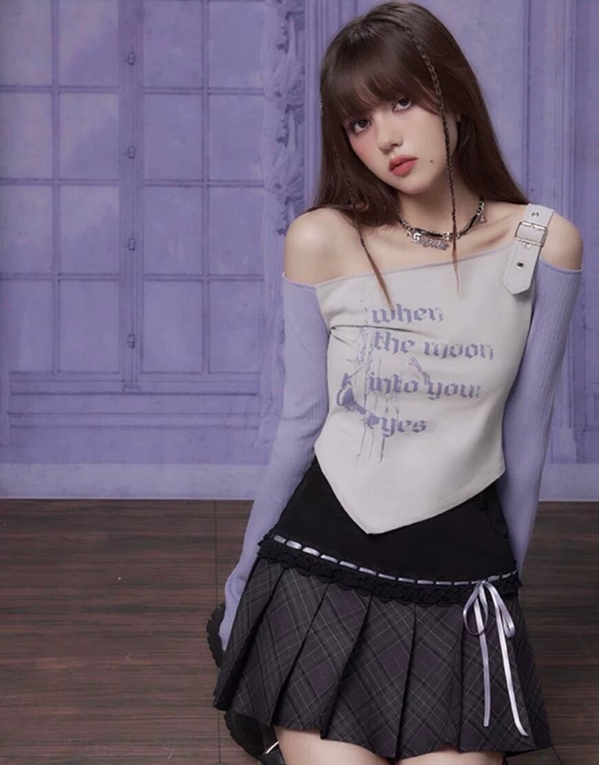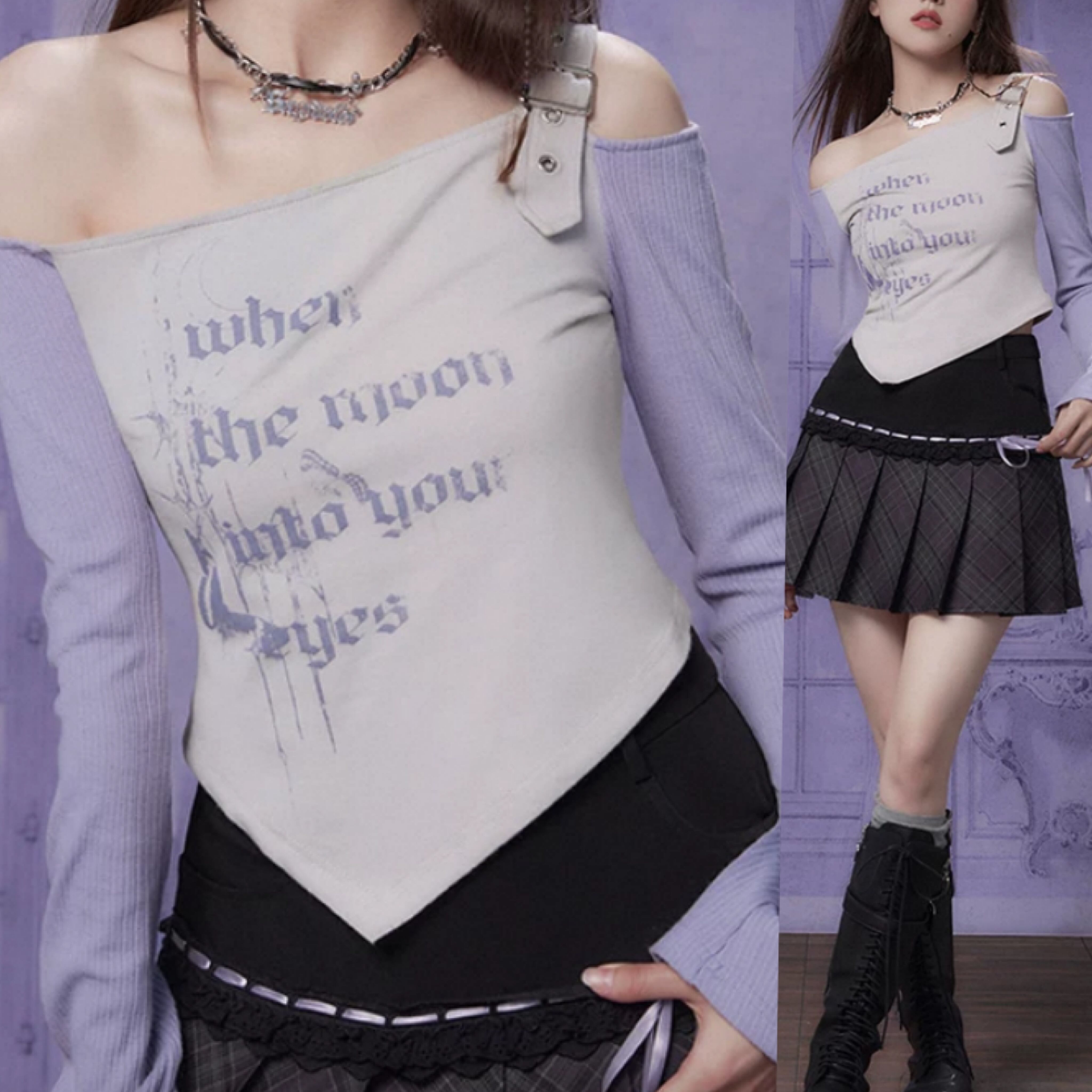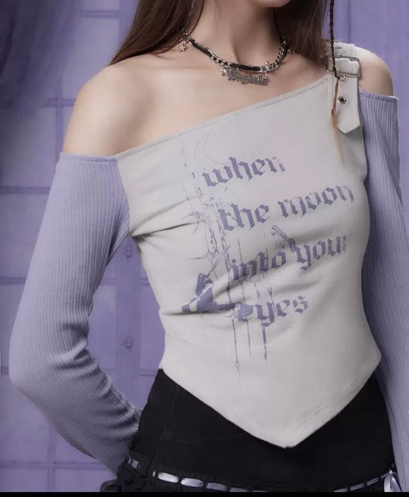 トップス グレー オフショルダー、水色 かわいい ガーリー Tシャツ。ロング Tシャツ ブラウス