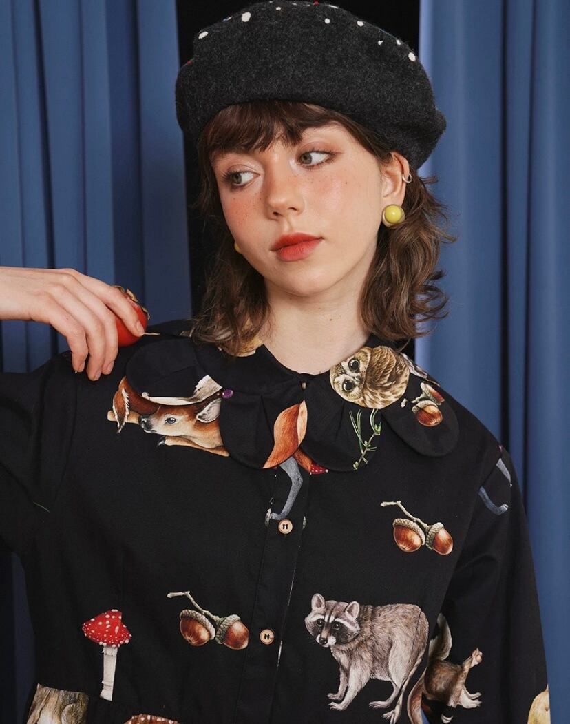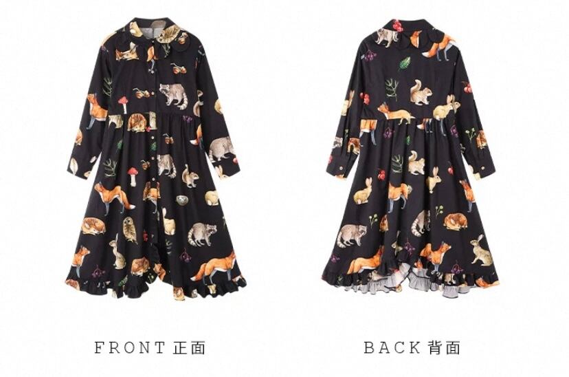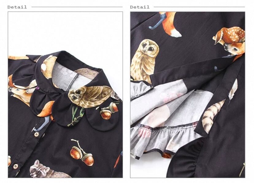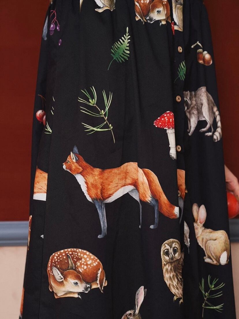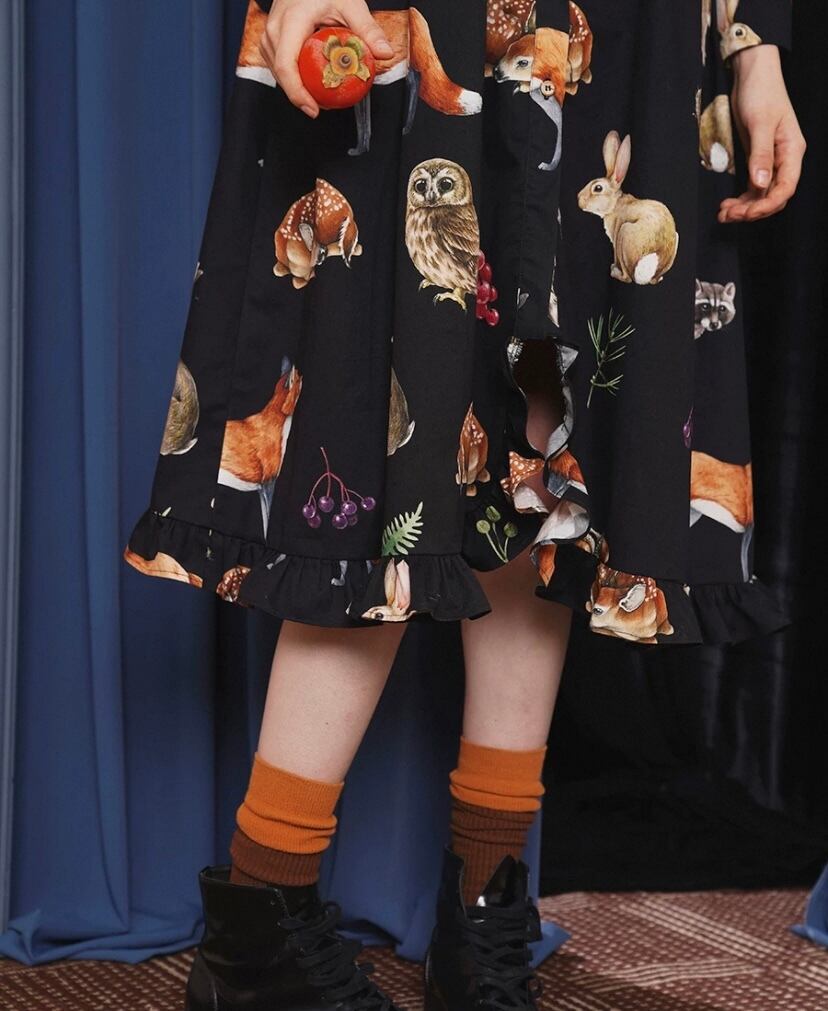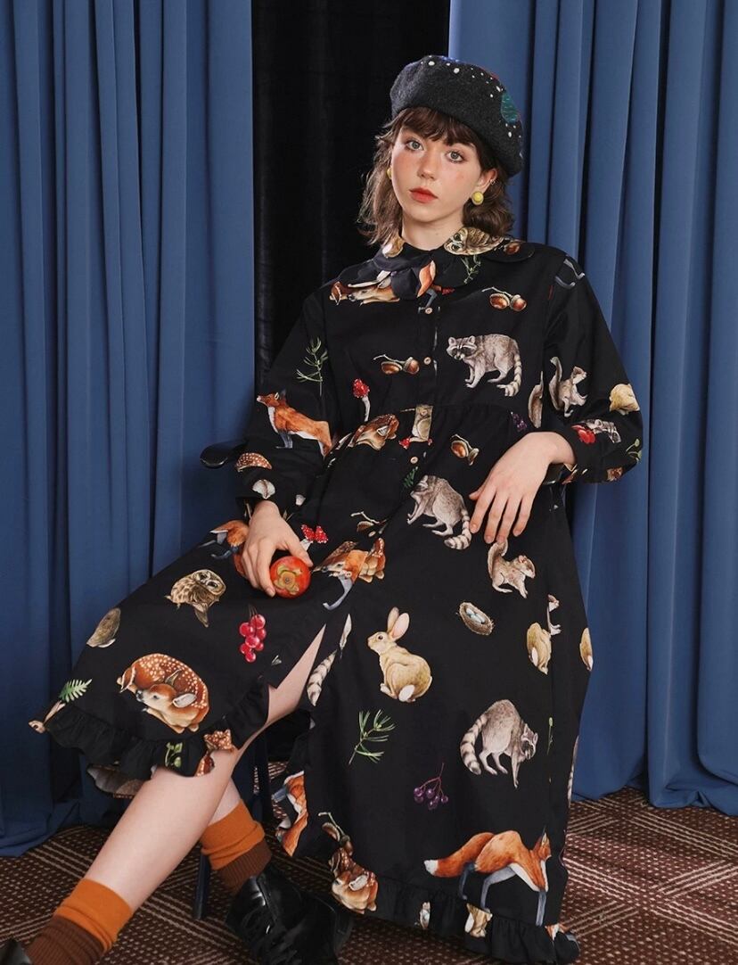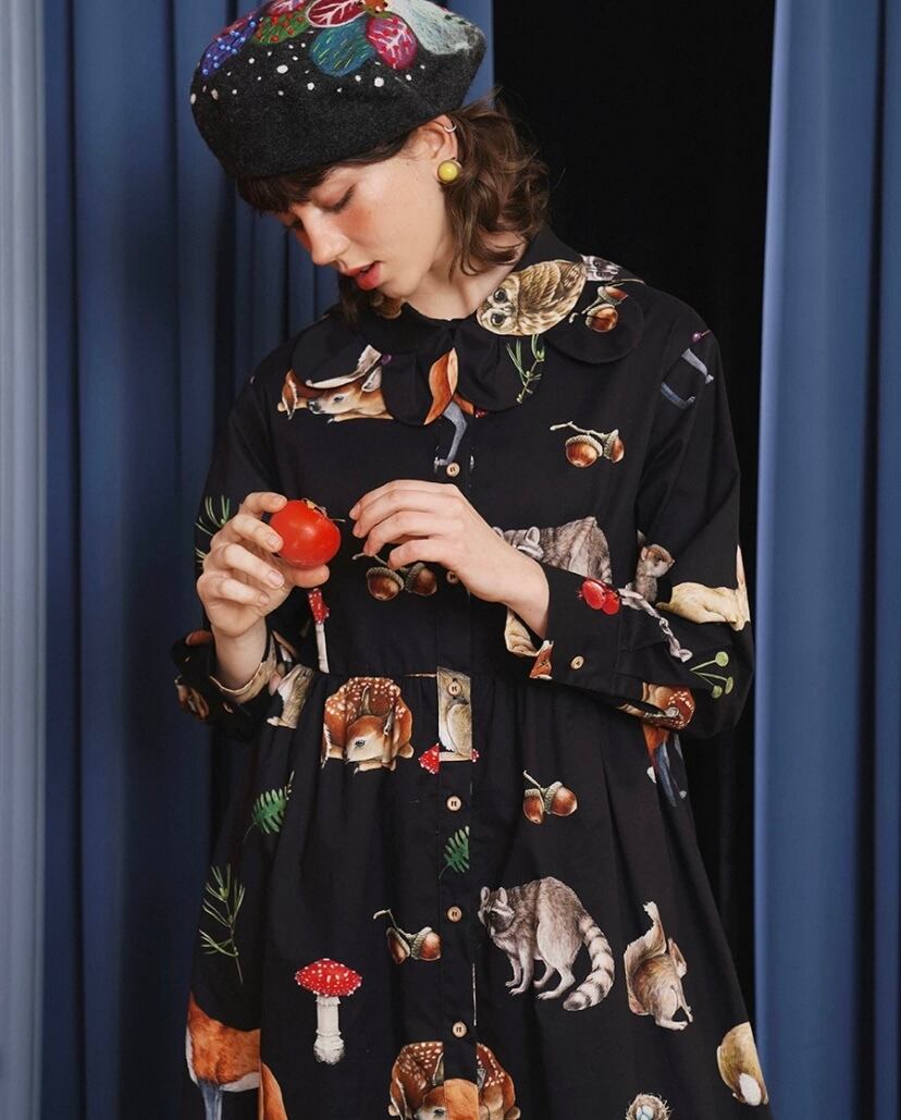 狐 ふくろう たぬき ふくろう 北海道、自然 アニマル 動物園 ワンピース ブラウス、丸襟 ロング ワンピース、黒 総柄