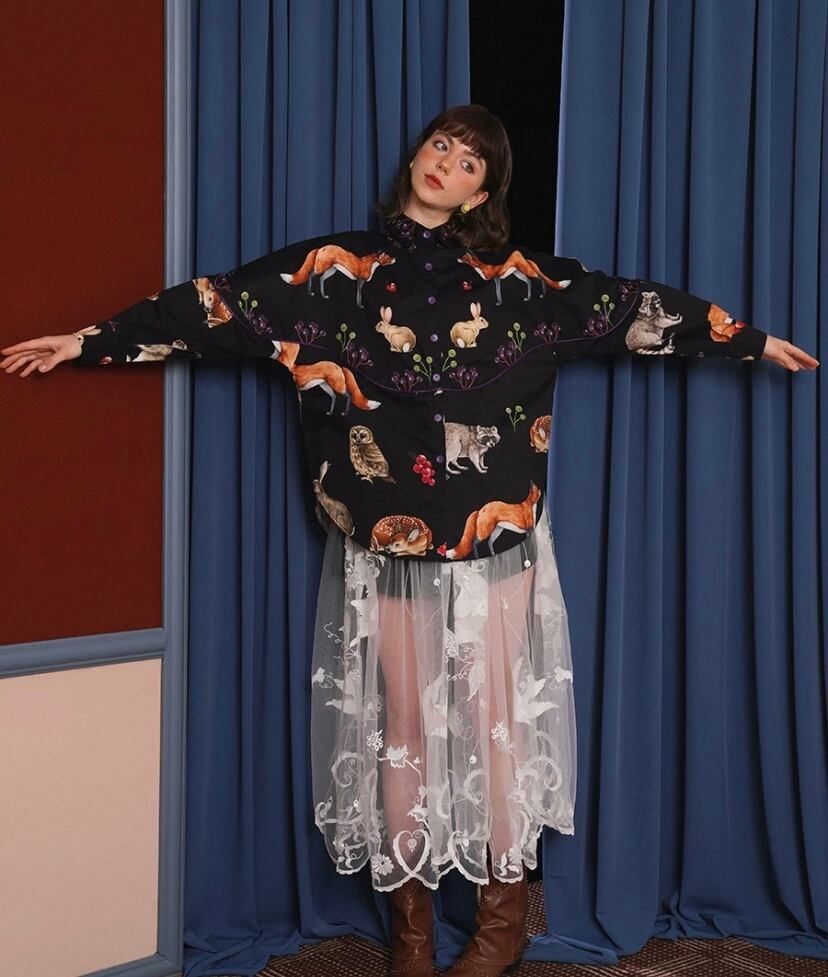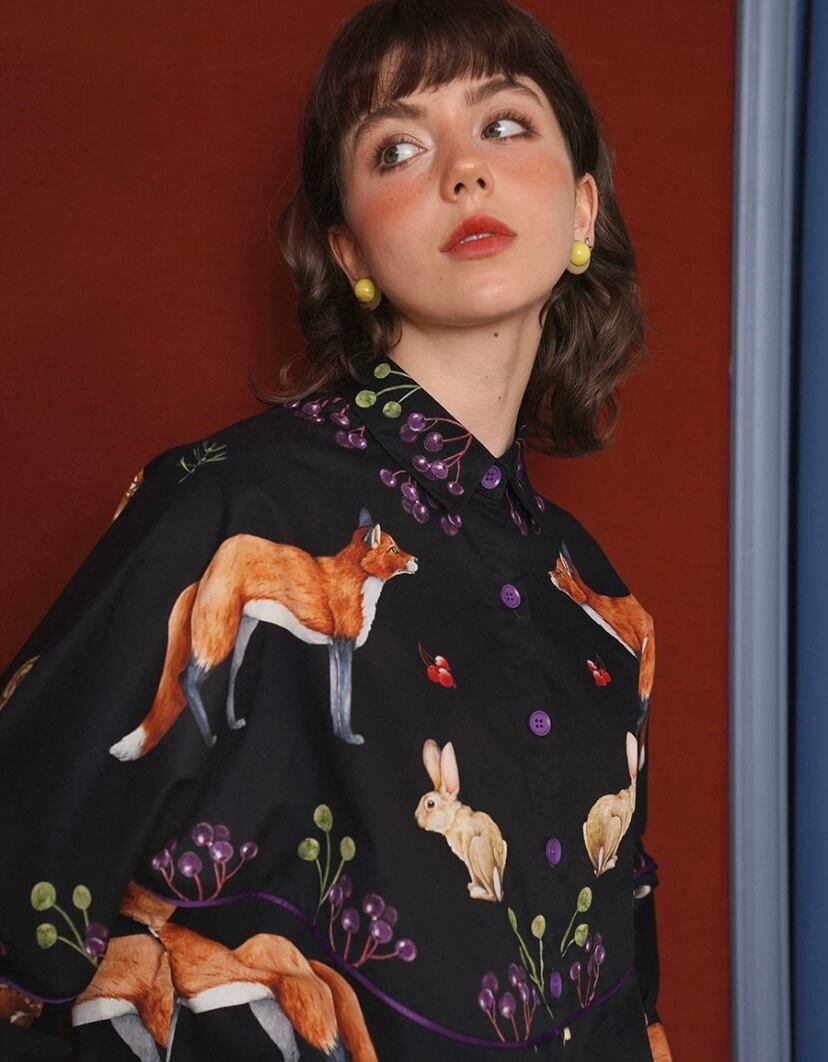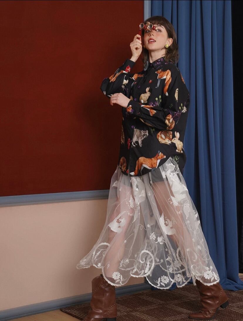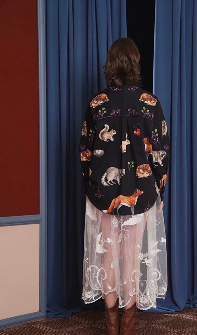黒 きつね たぬき、シャツ ブラウス、うさぎ、きのこ 総柄 動物園 アニマル