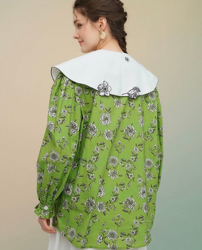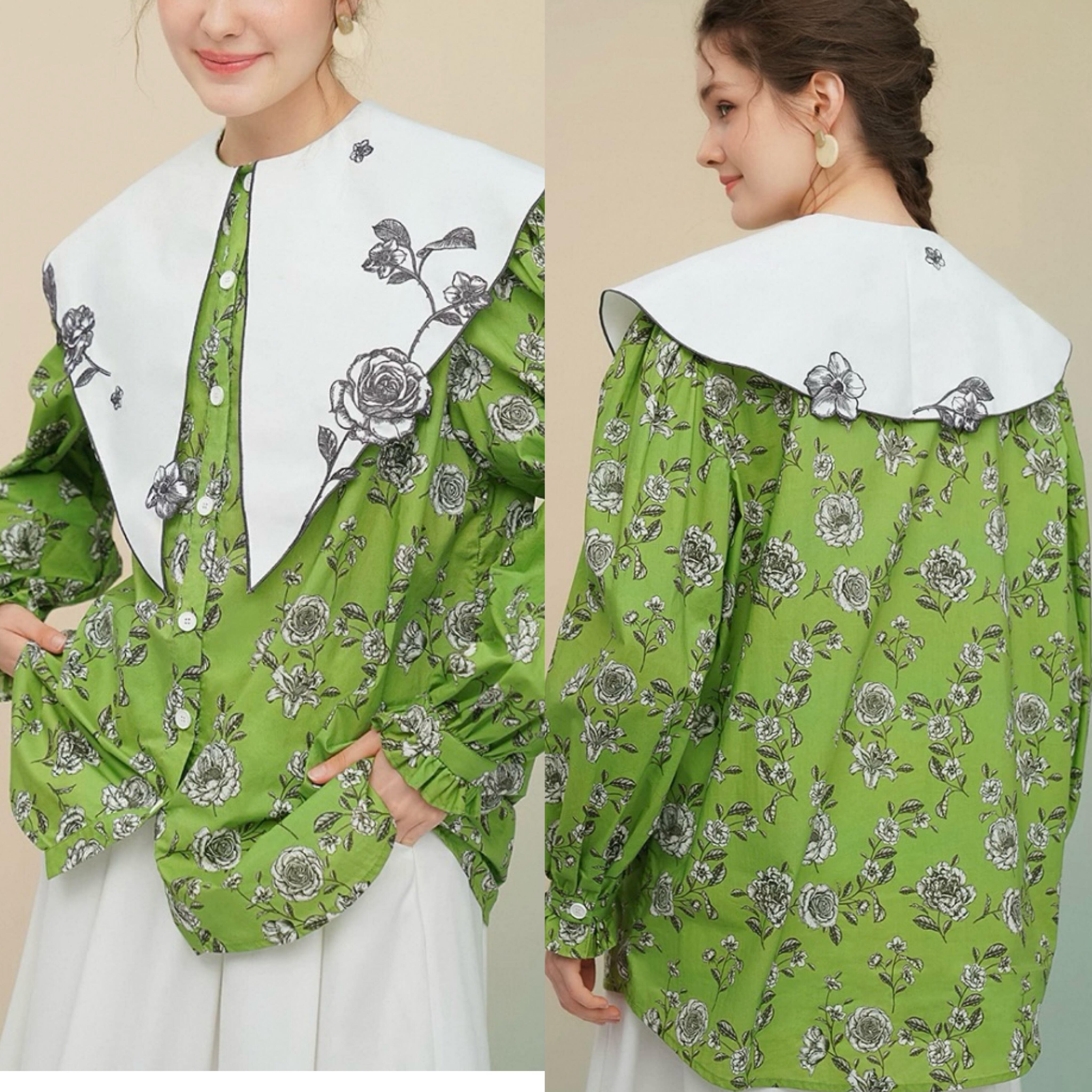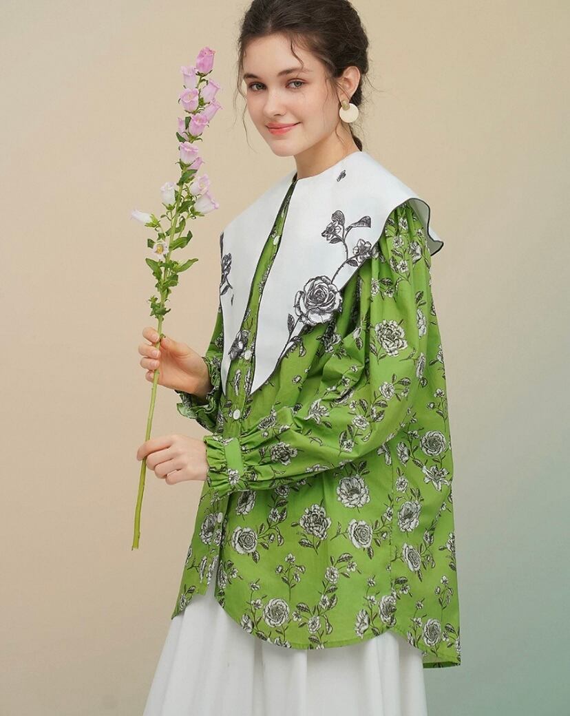 緑 デカエリ フラワー 草 花柄 ブラウス シャツ