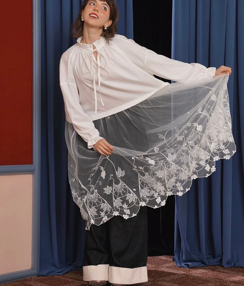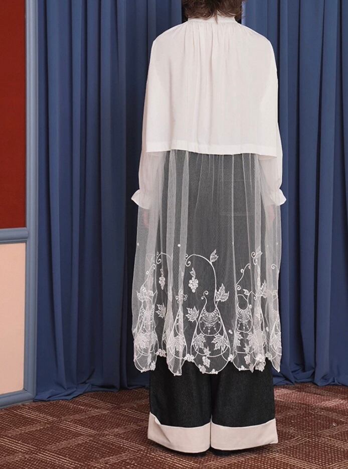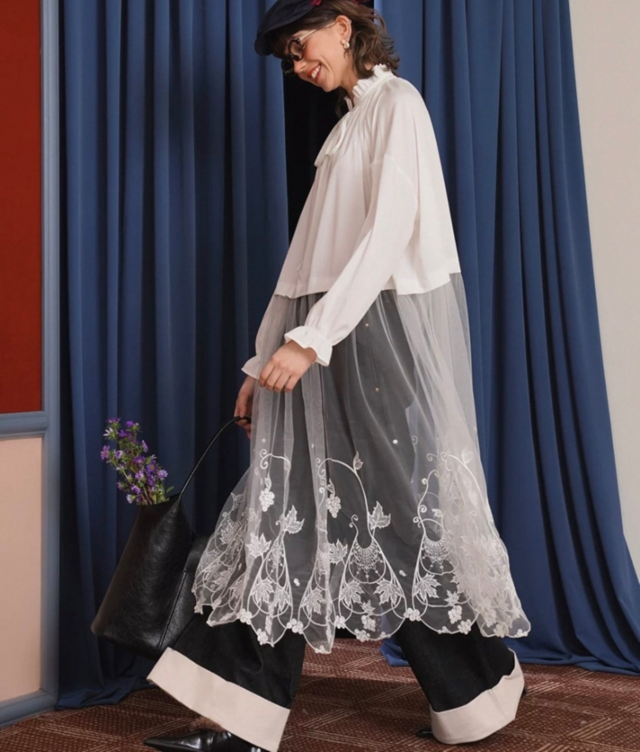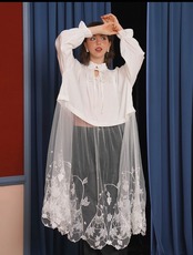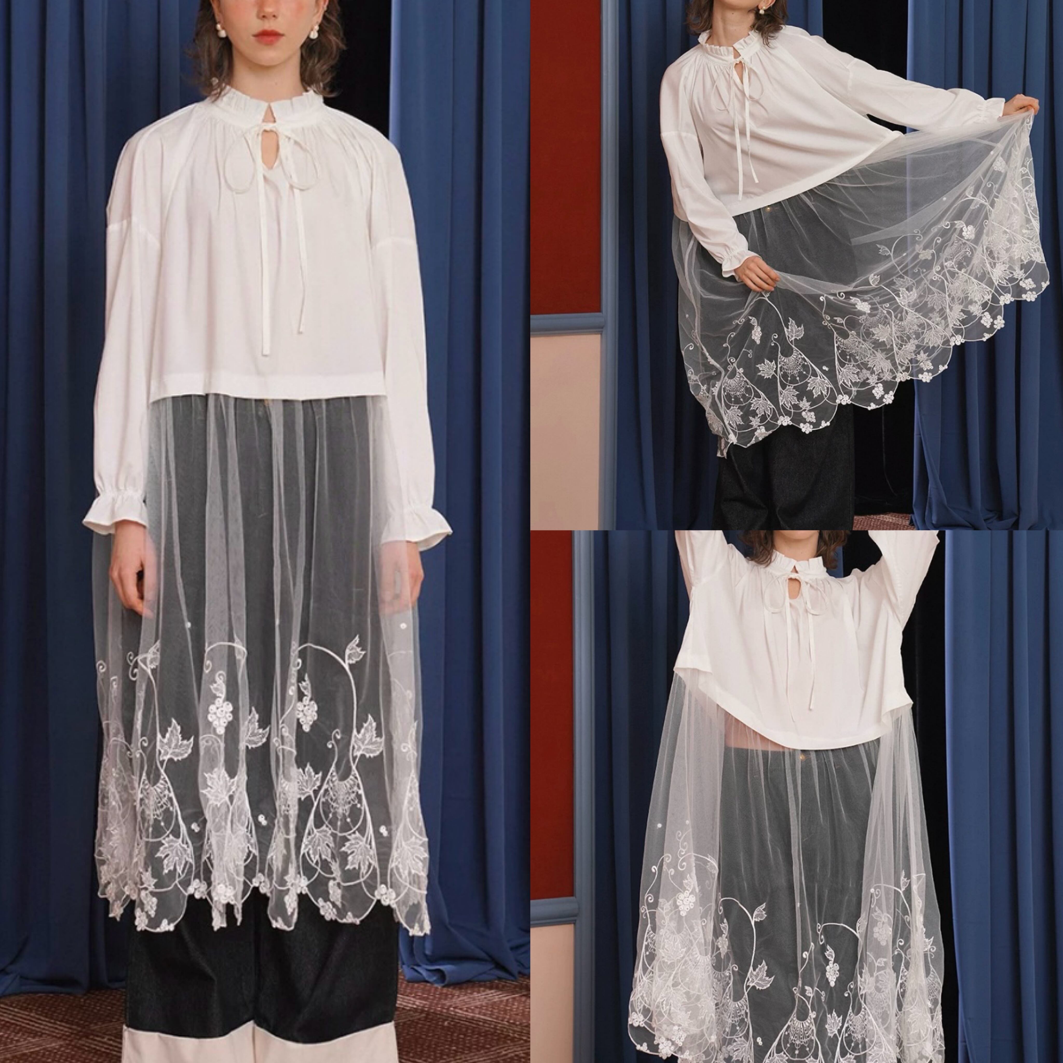 ロング ブラウス ワンピース、重ね着、レース、シースルー、白 爽やか、花柄