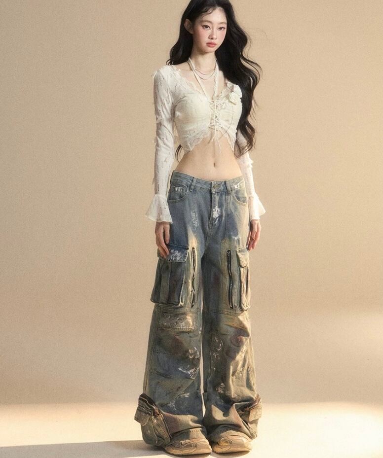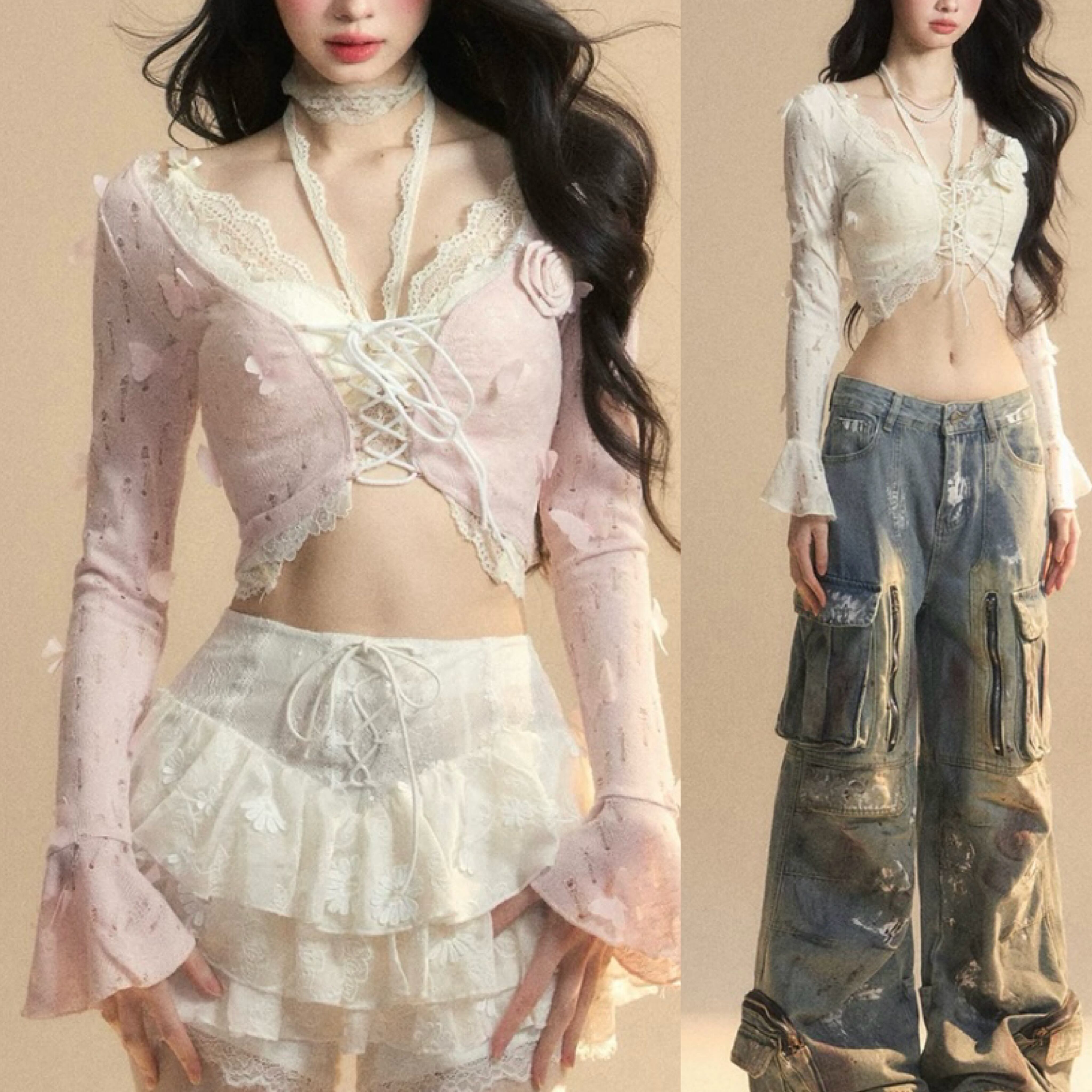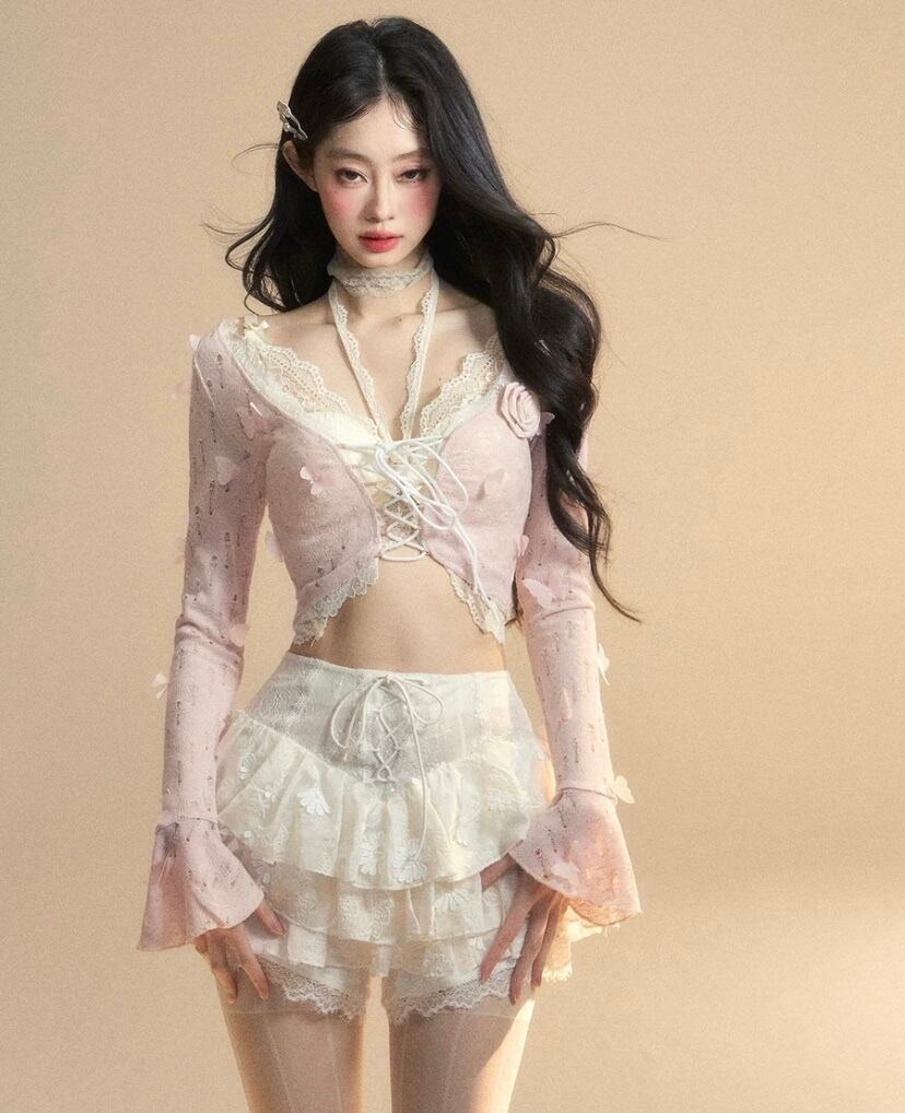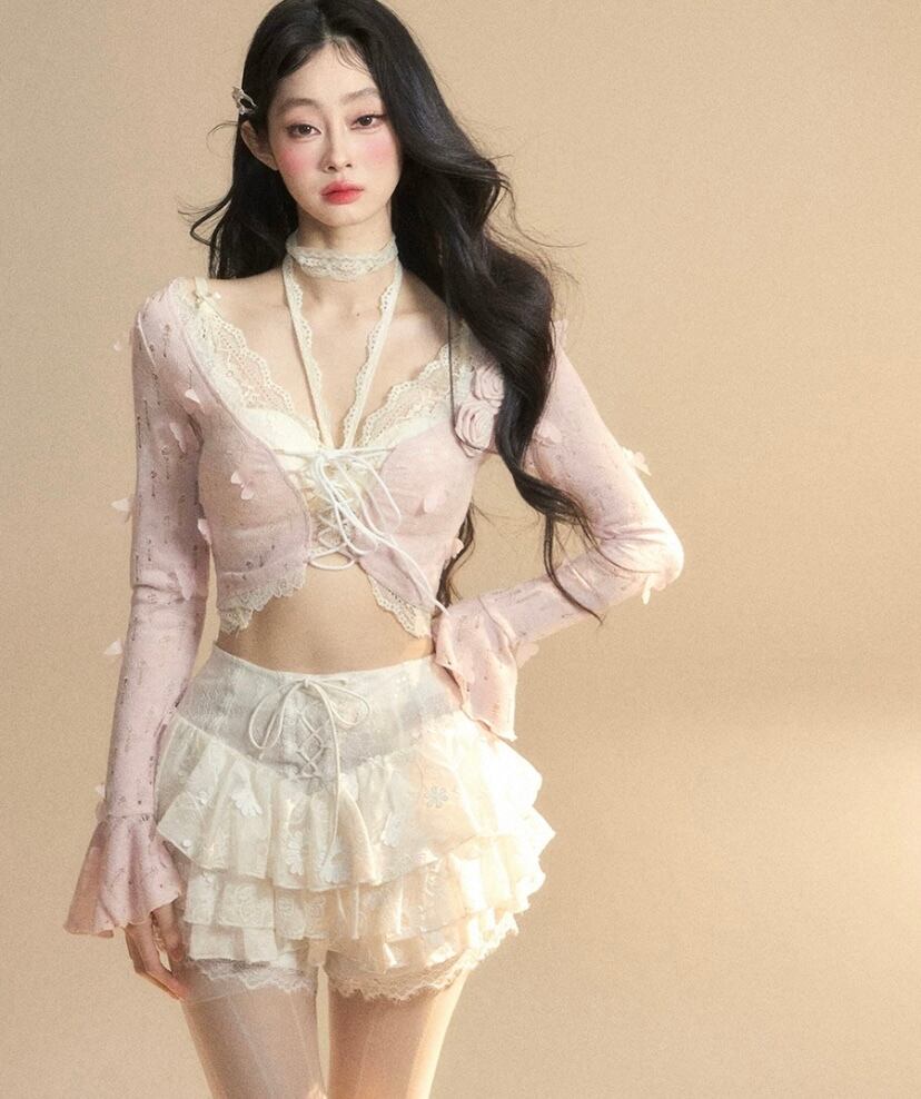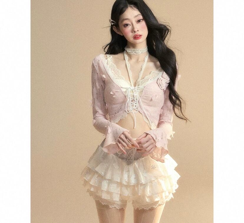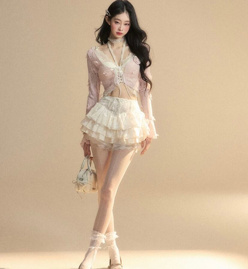 ピンク レース、白 トップス、ショート ブラウス
