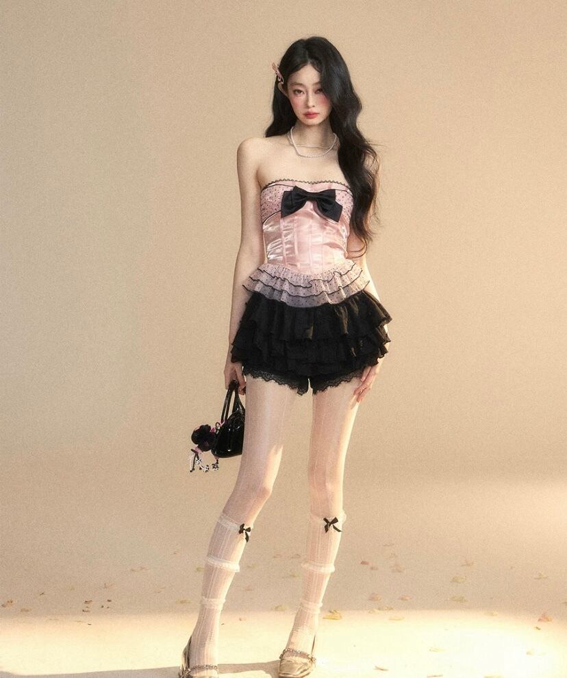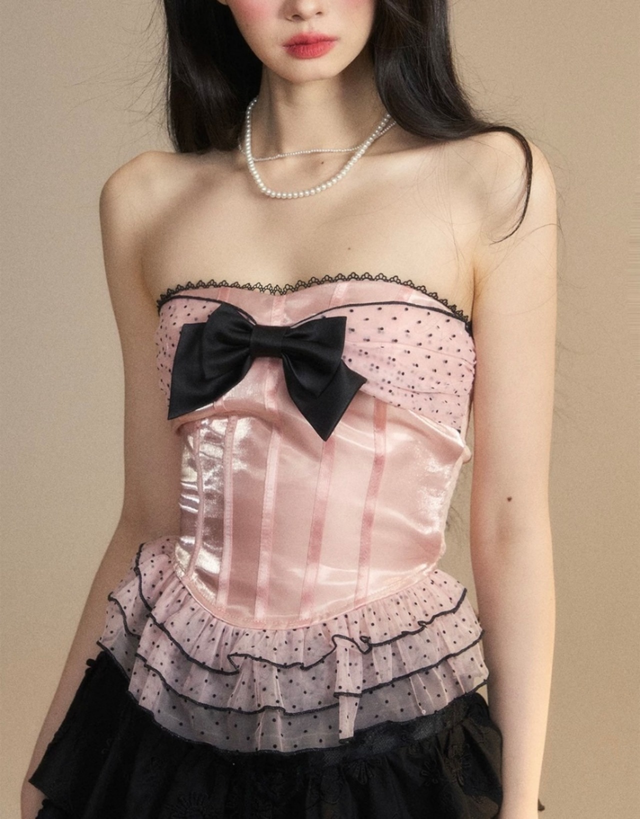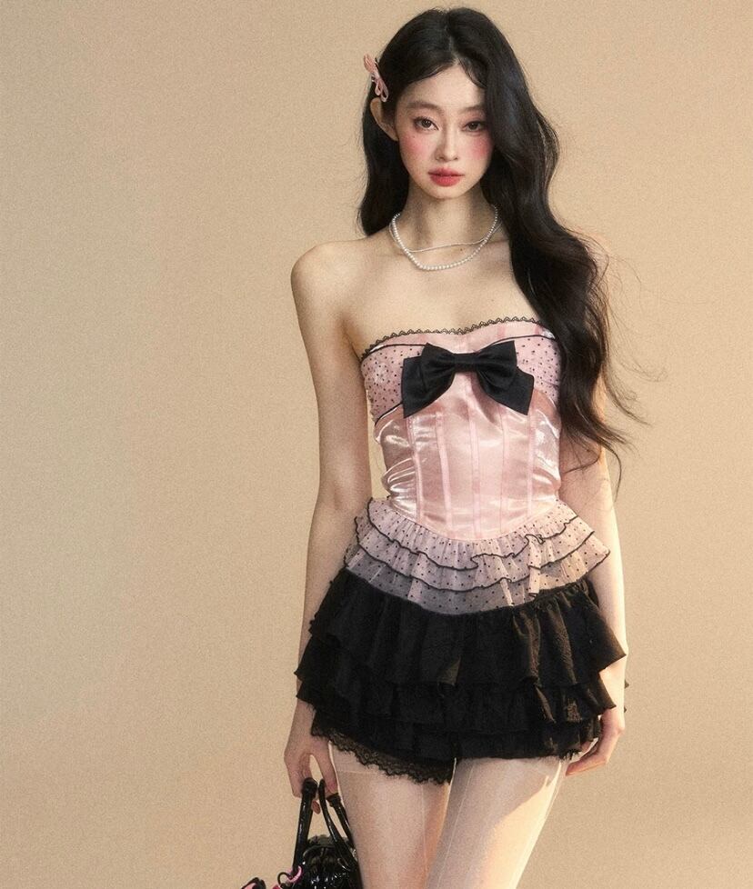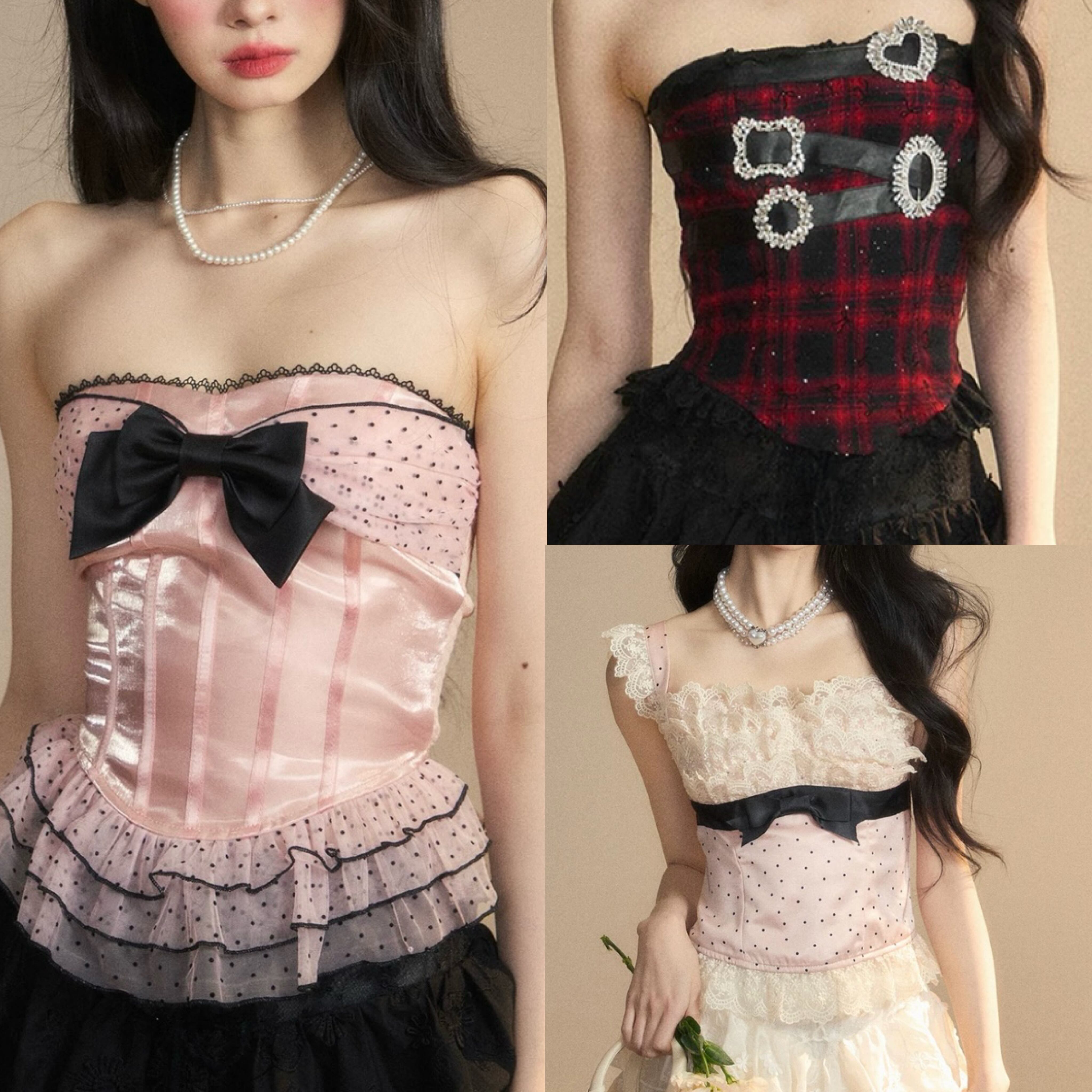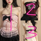 ベアトップ、ピンク 水玉、黒 リボン チューブトップ 赤 チェック