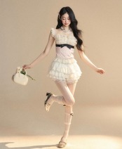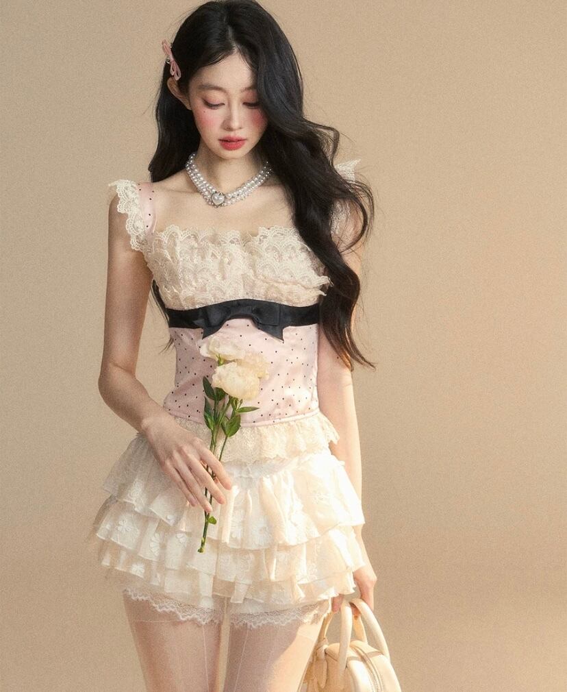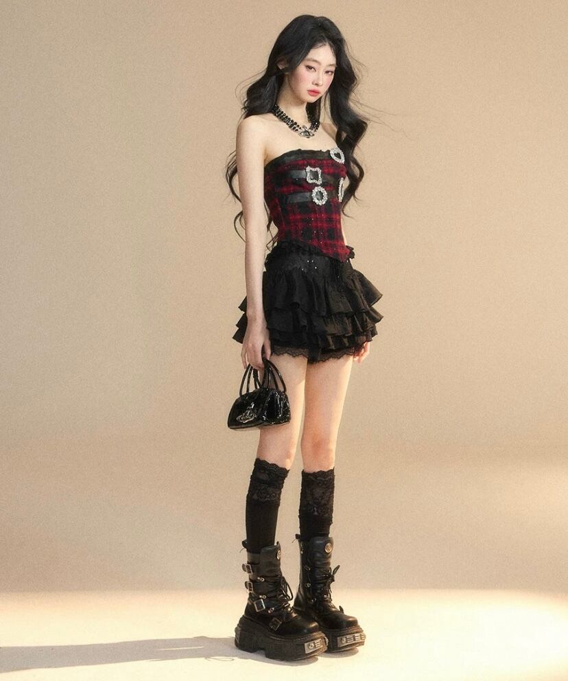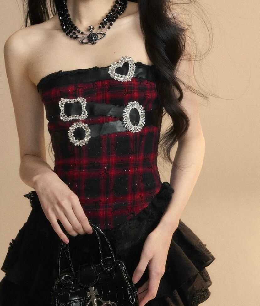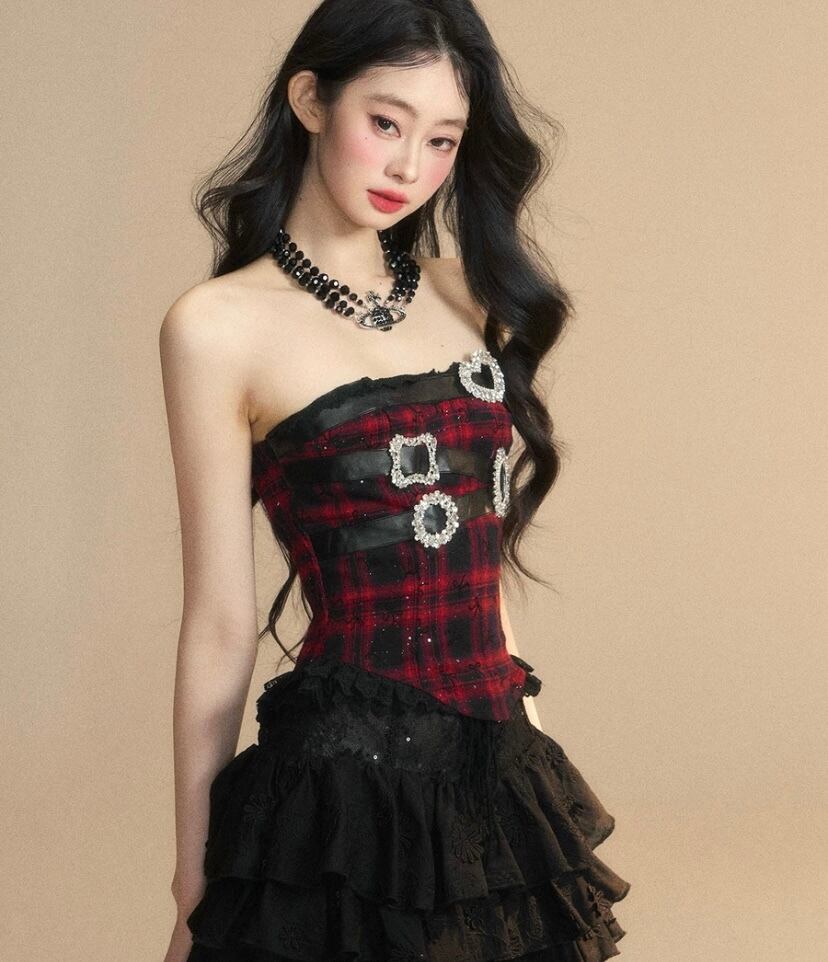 ベアトップ、ピンク 水玉、黒 リボン チューブトップ 赤 チェック