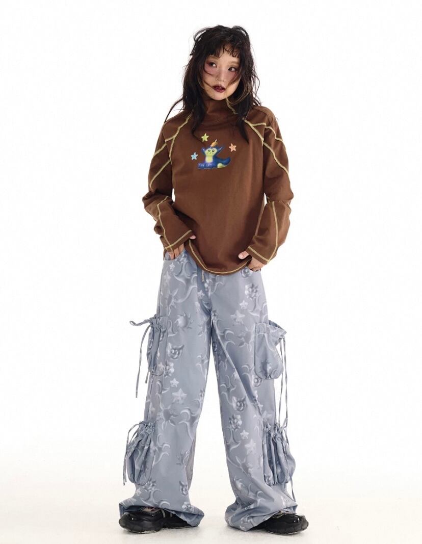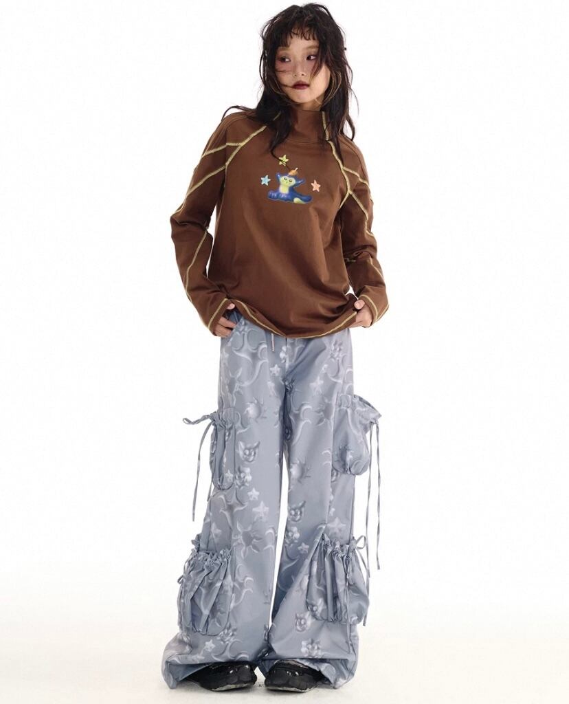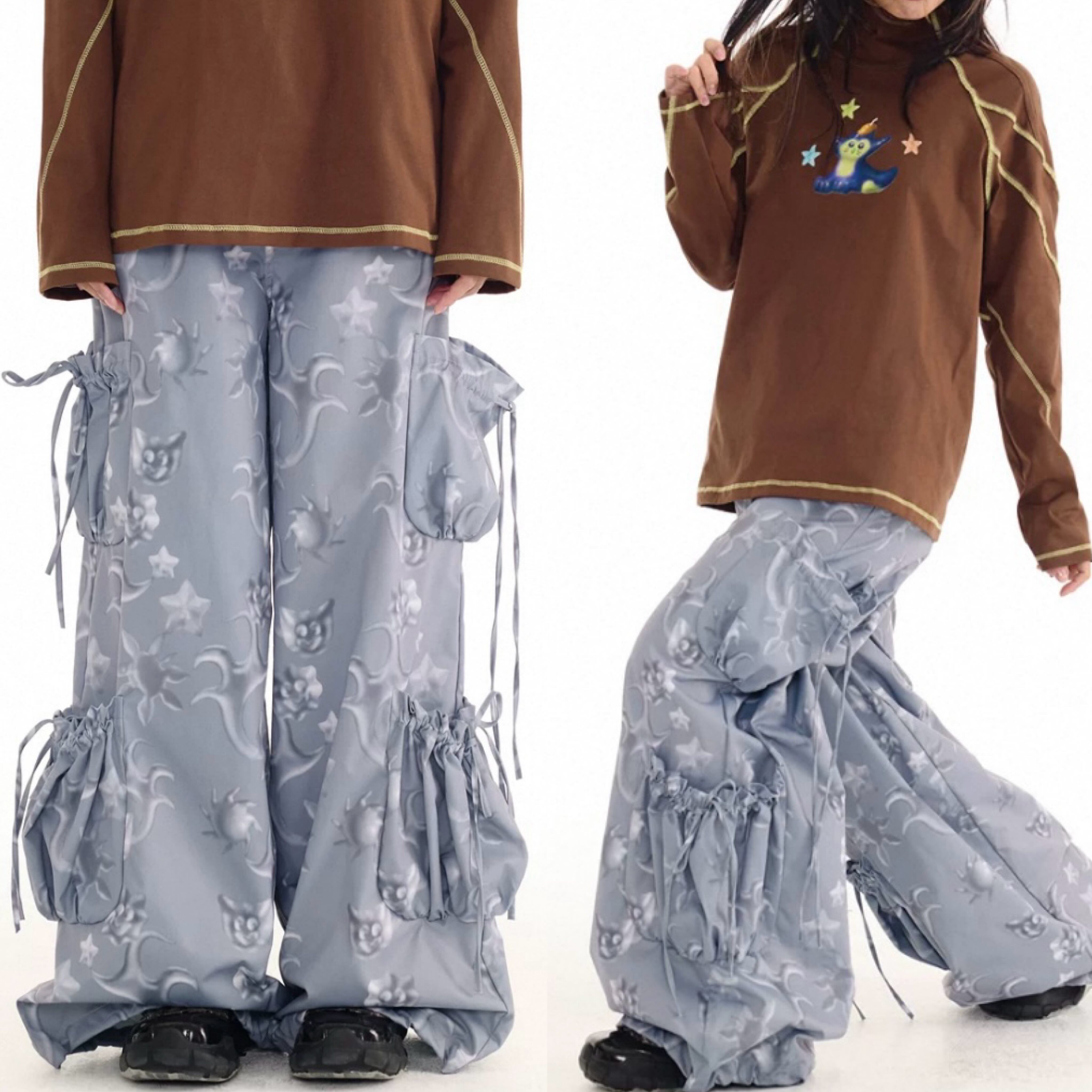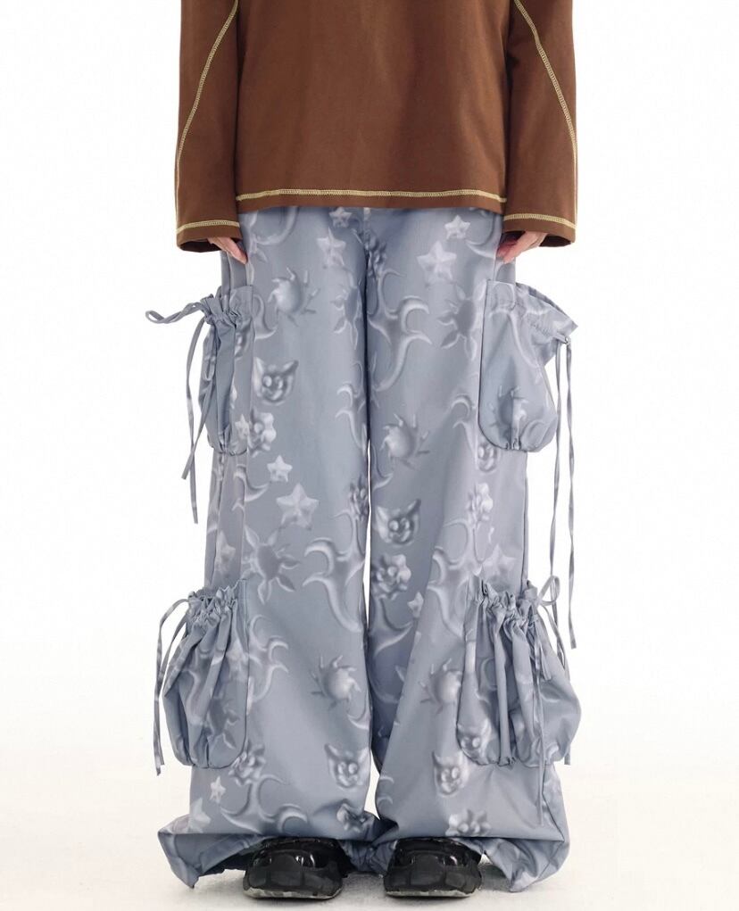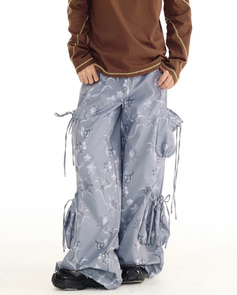 パンツ ボトムス ソフト 太め グレー、リボン ポケット