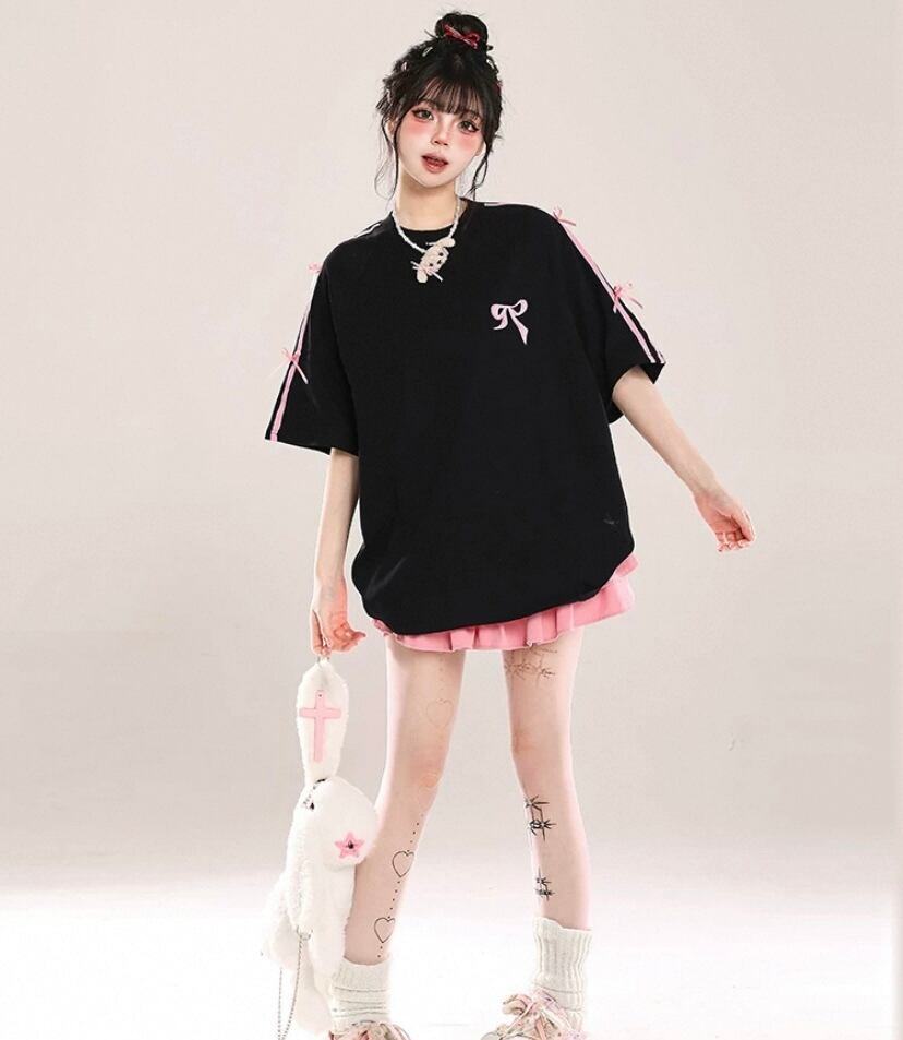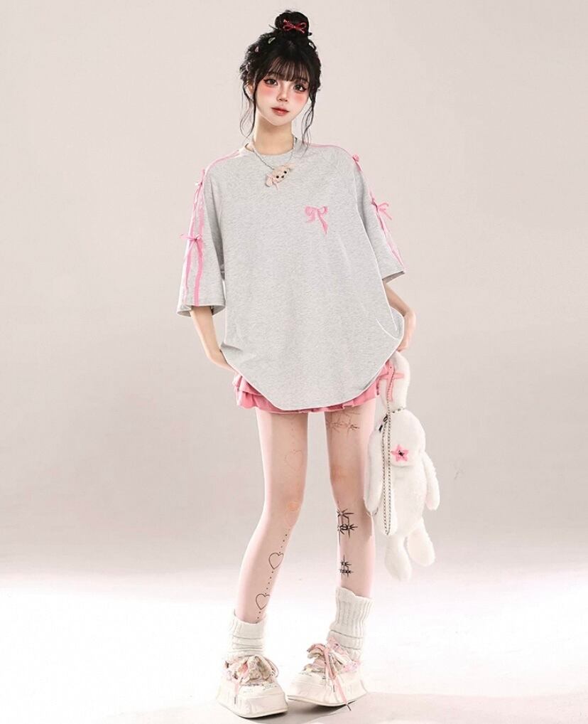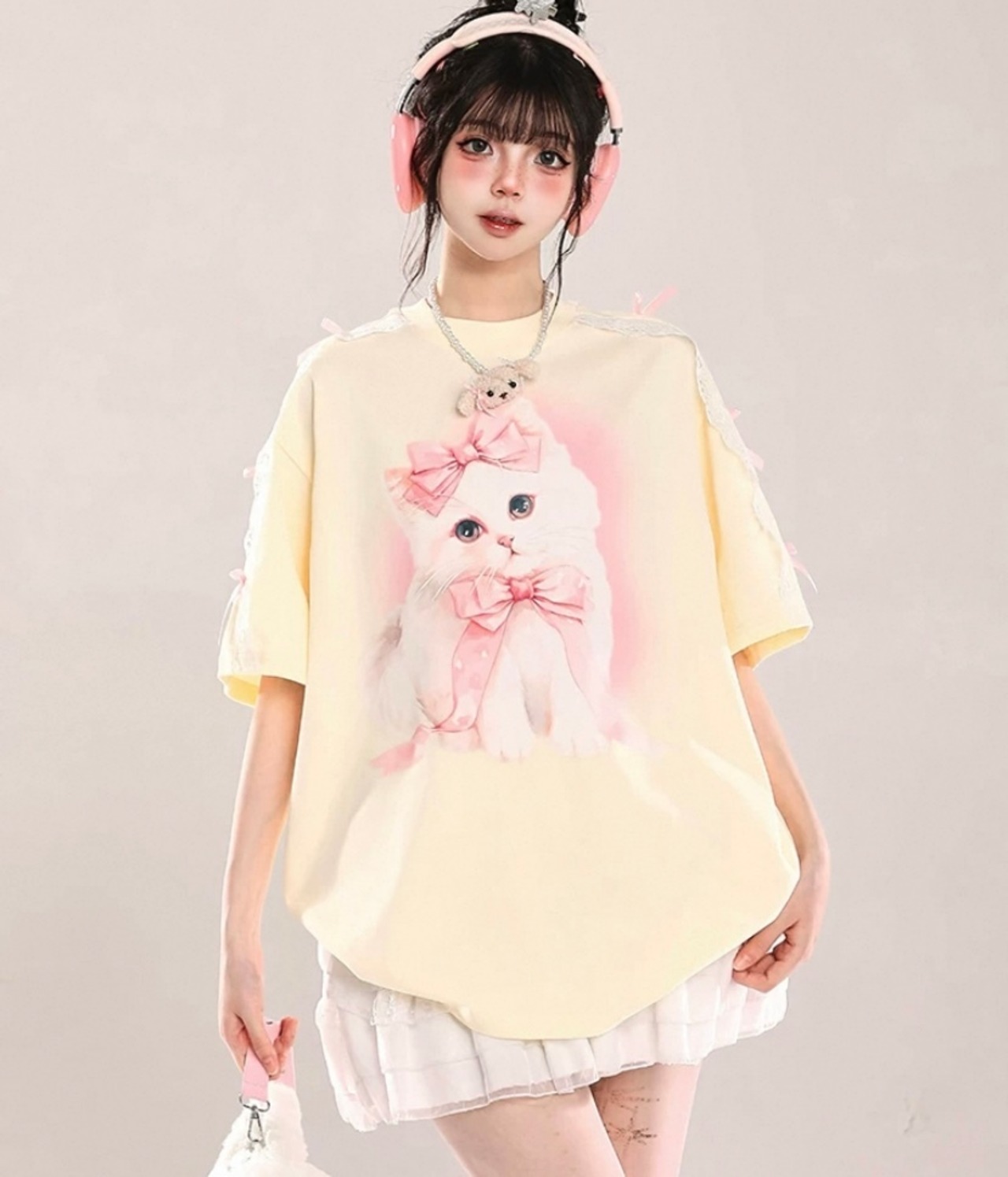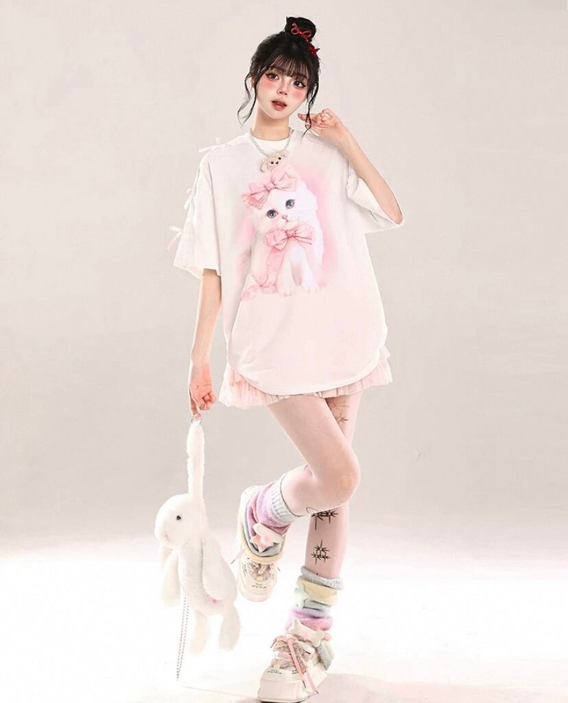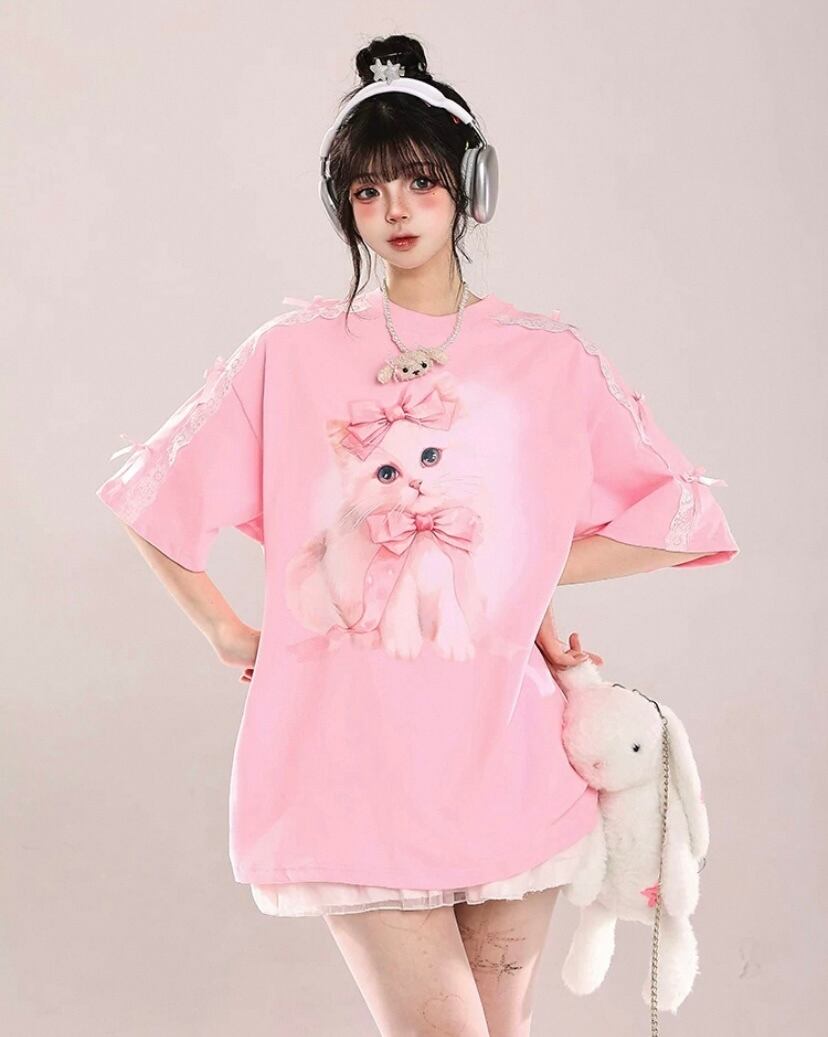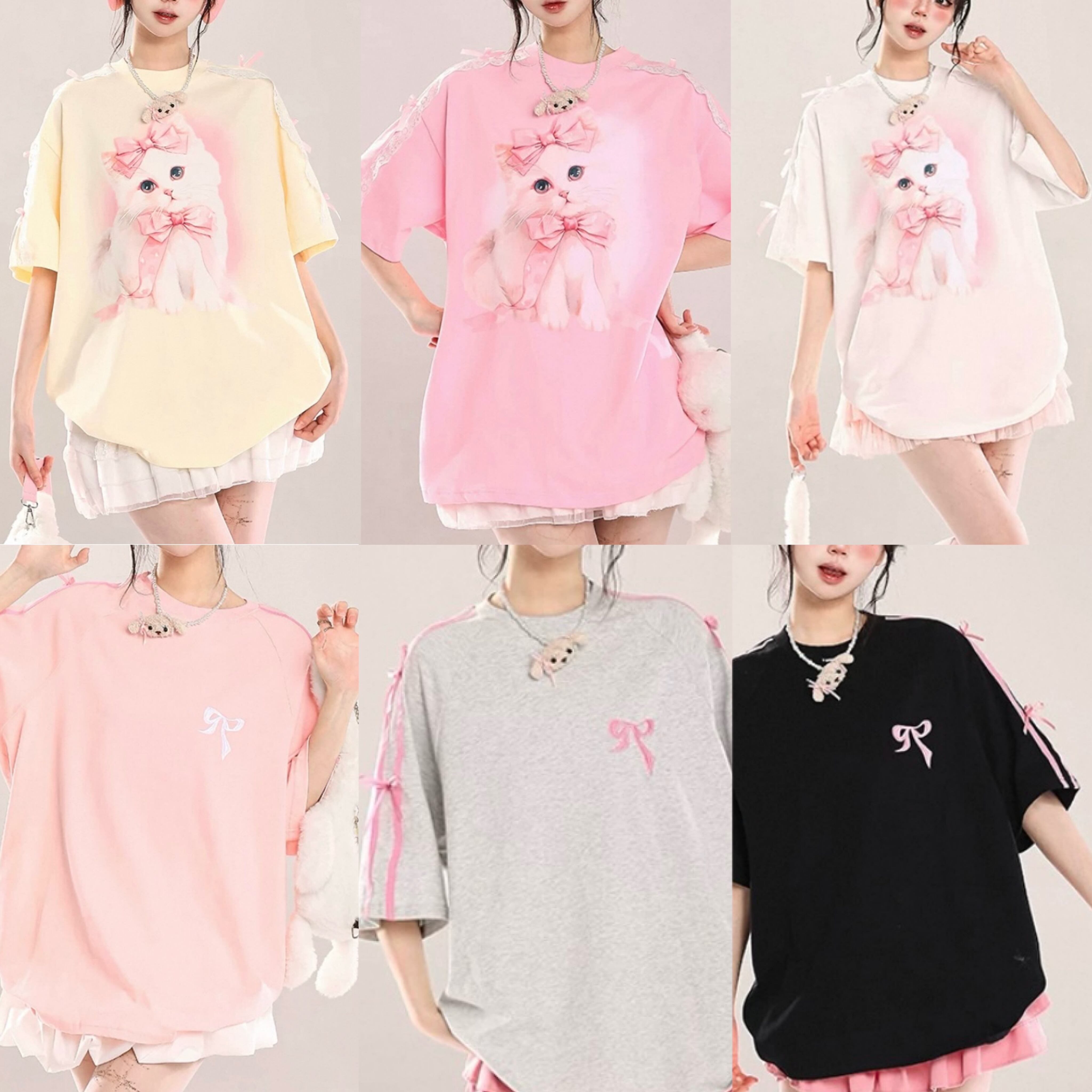XL白ピンク、黒 グレー リボン、ピンク 黄色 トップス Tシャツ 猫