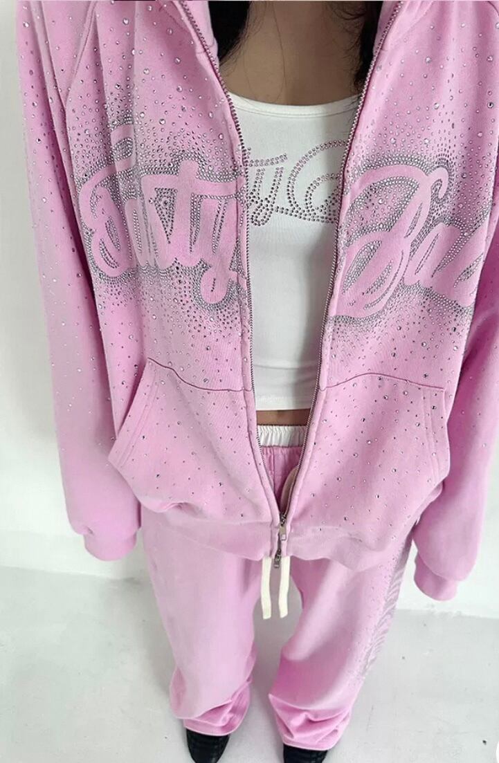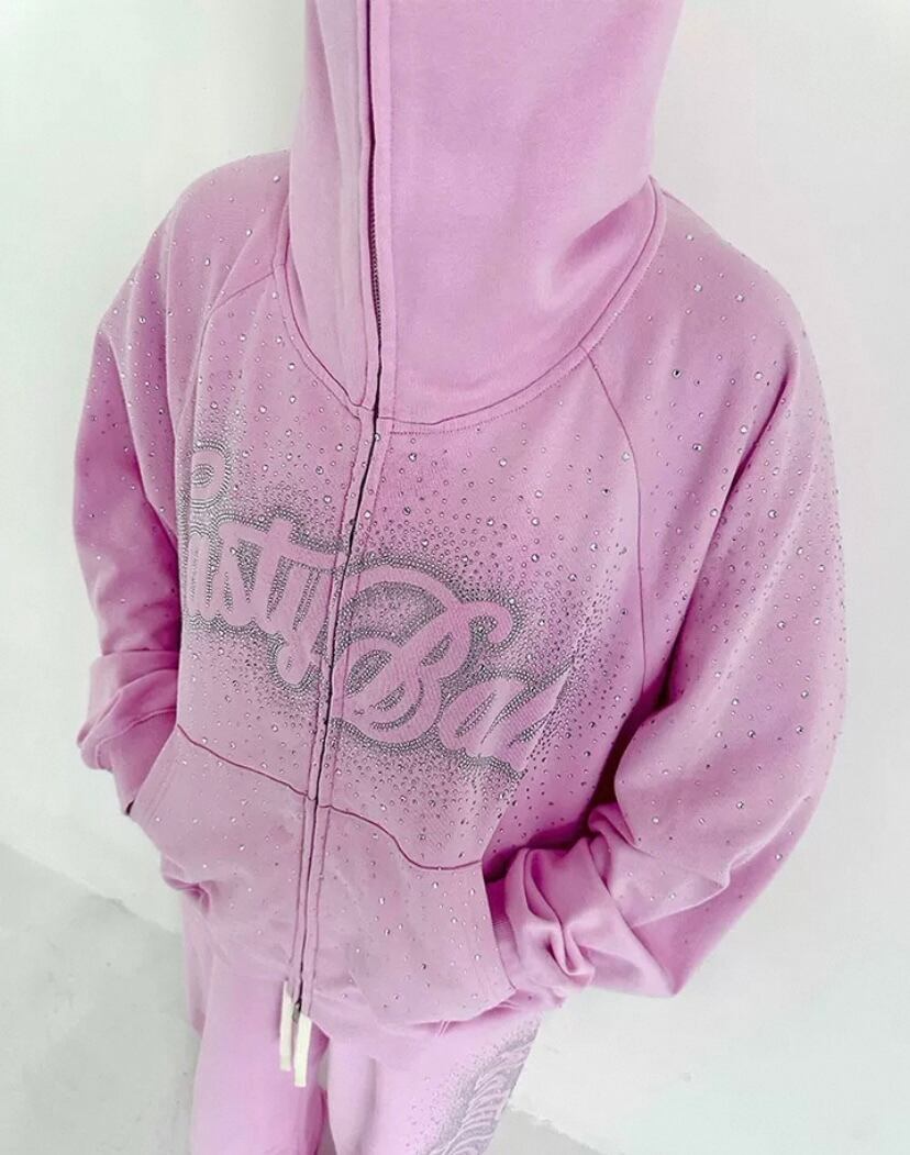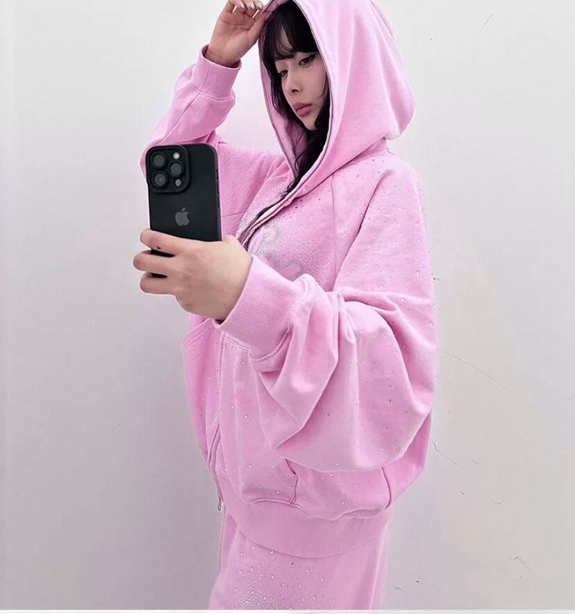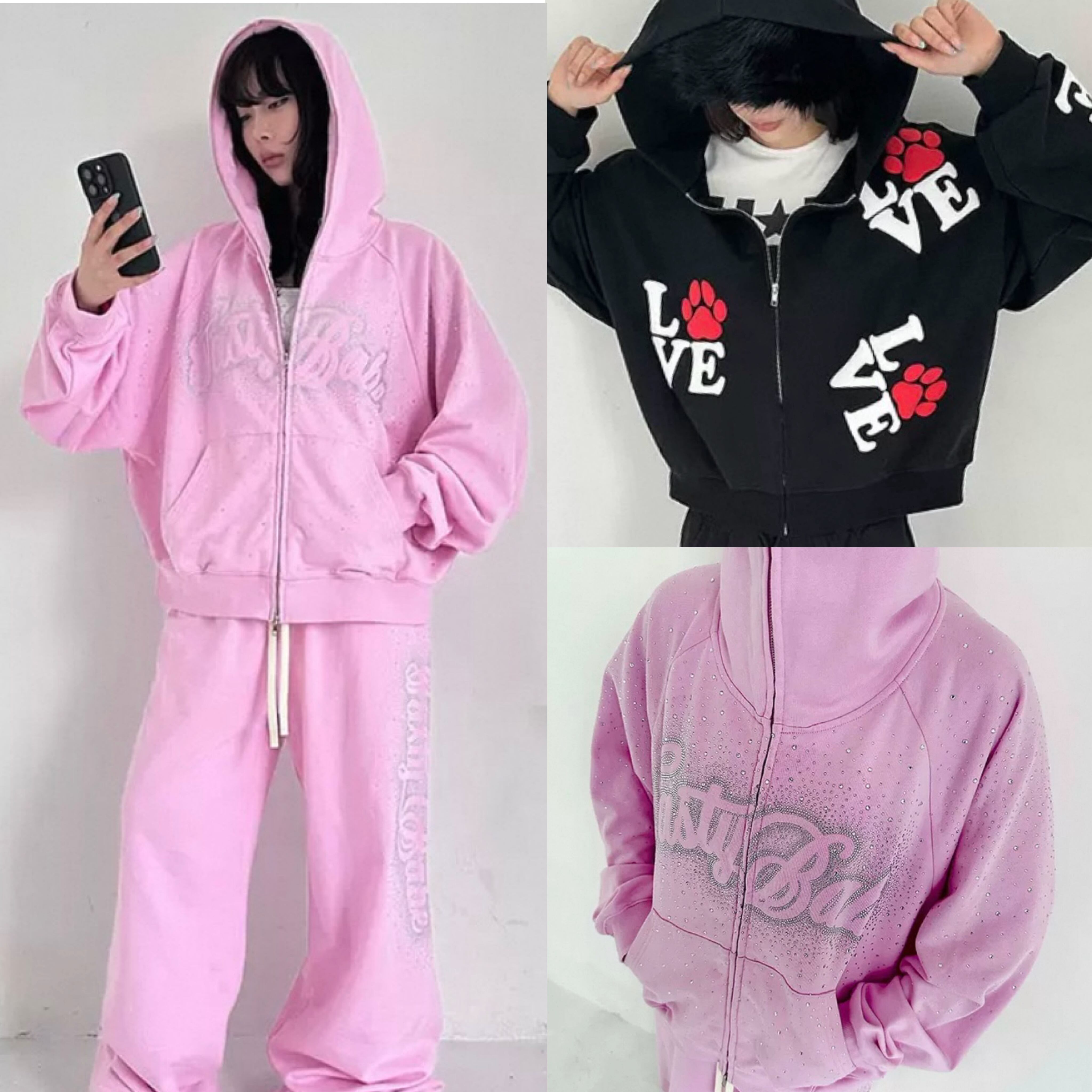 【パーカー】黒 ピンク スウェット パーカー トレーナー 犬 キラキラ ラインストーン
