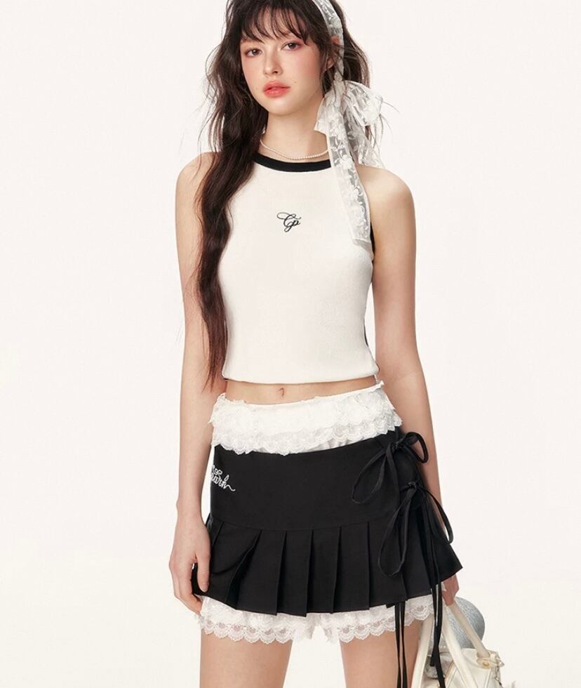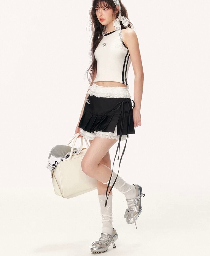 リボン スカート、黒 プリーツ ミニスカート レース 白