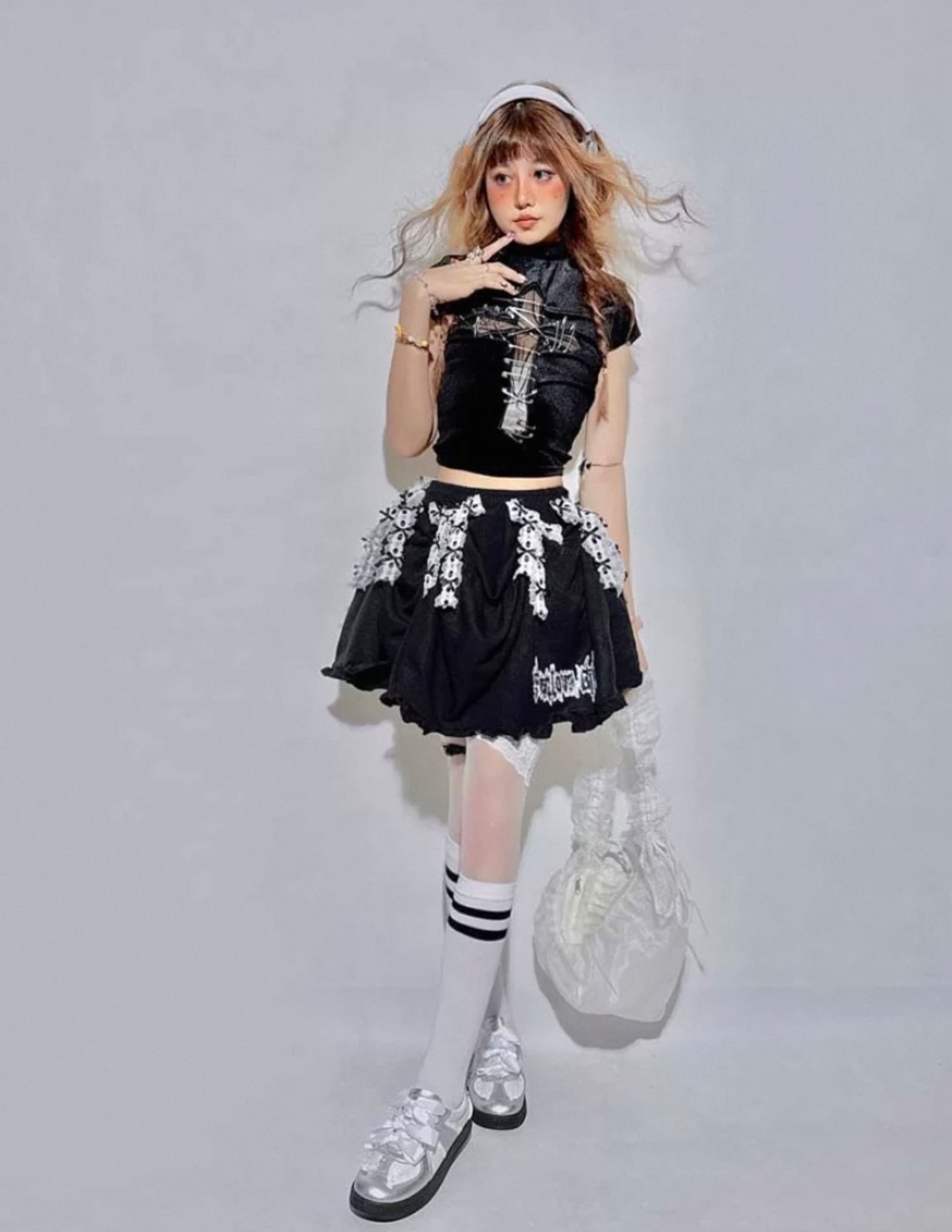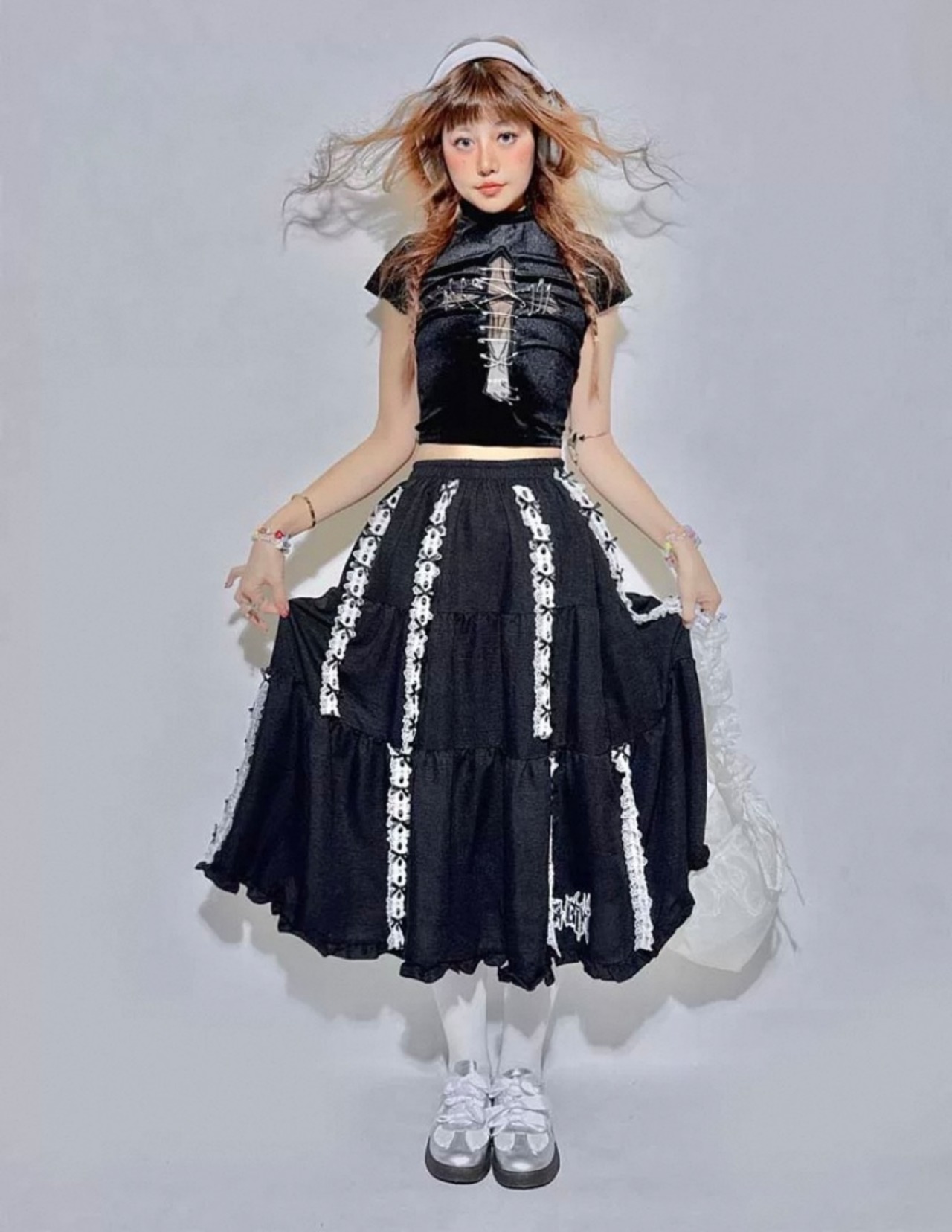 こちらのスカートは、リボンの結び方で斜めに結んだり長く結んだり短く結んだりしていろいろと使えます