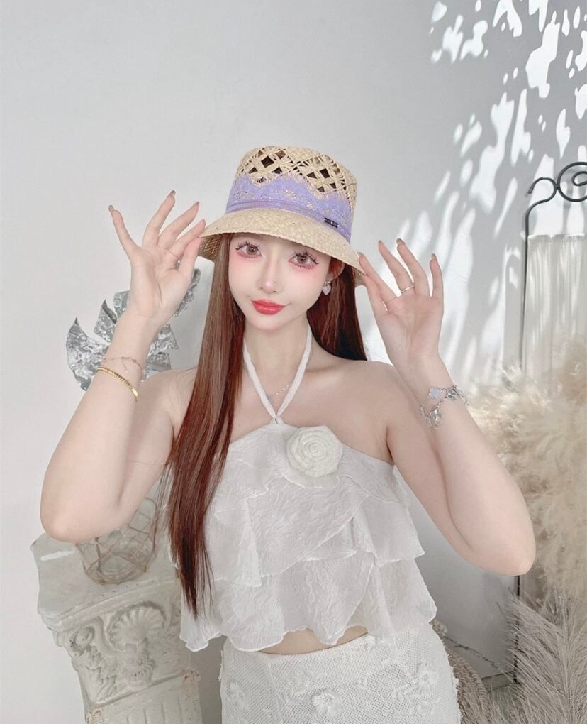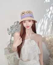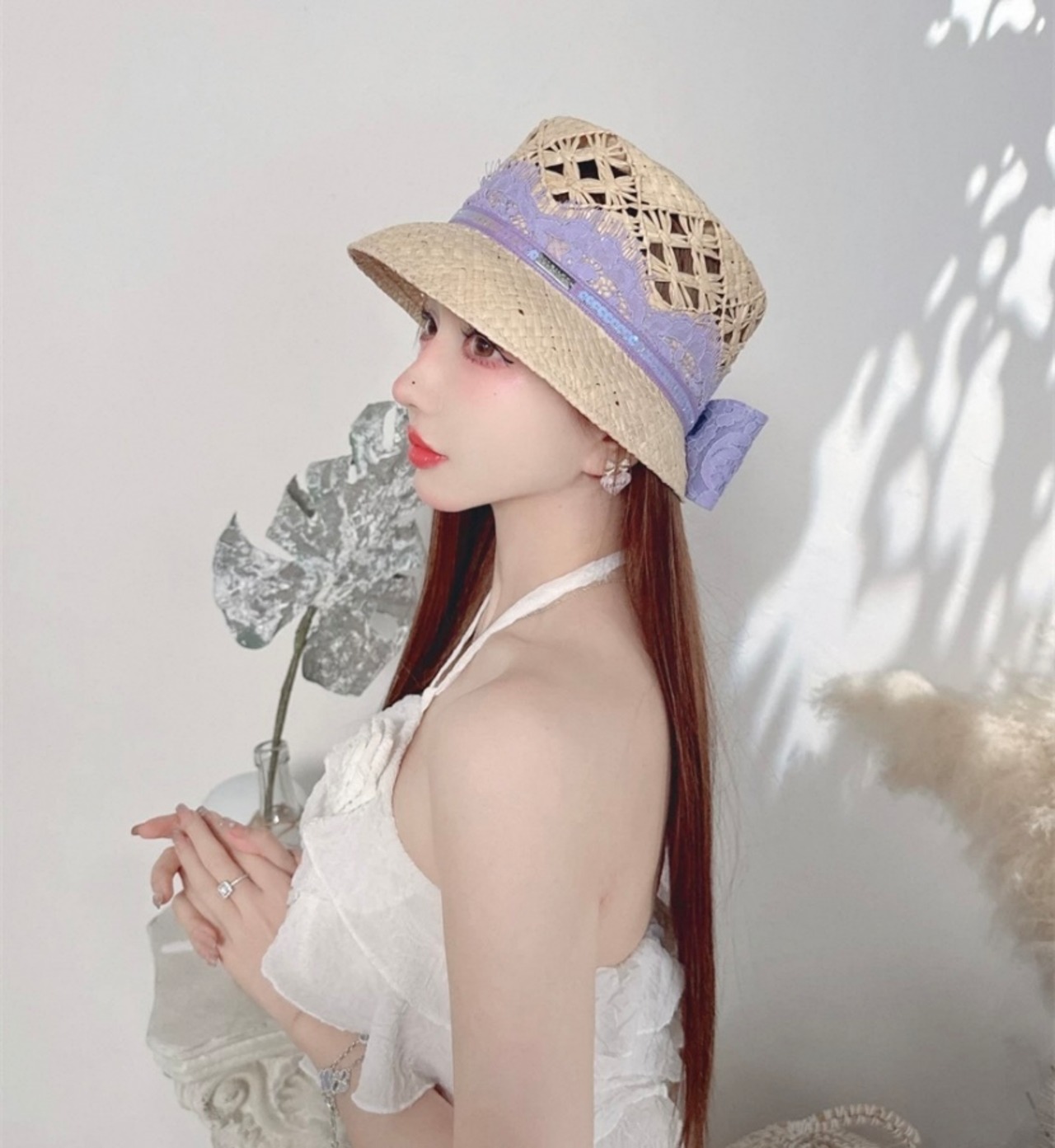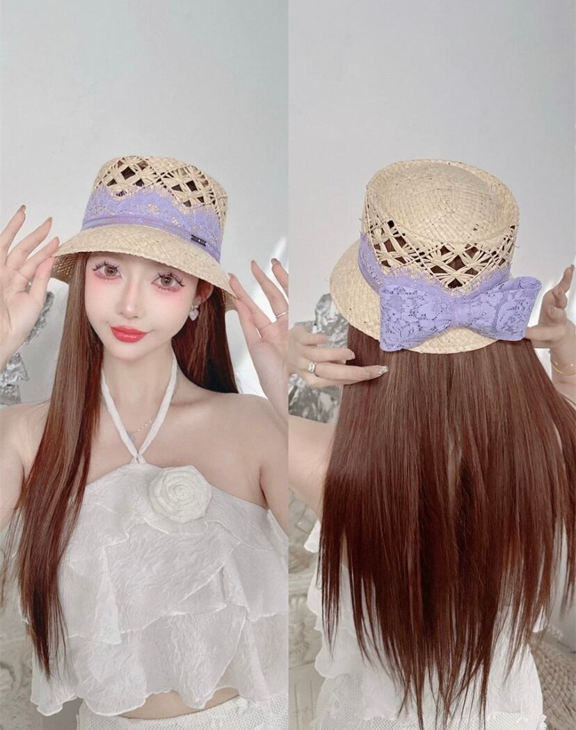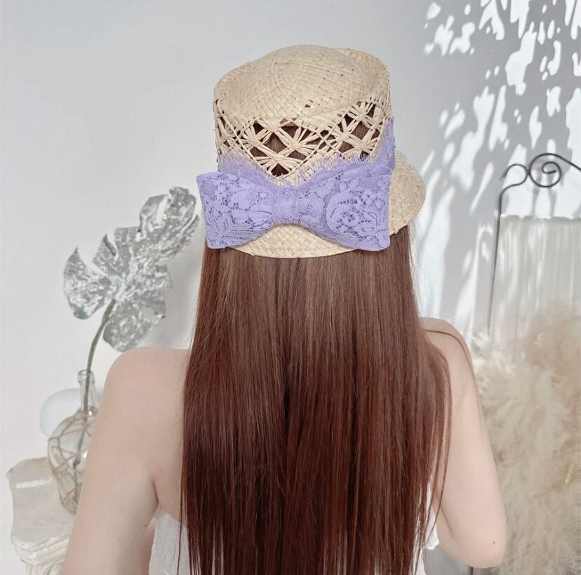紫 リボン、帽子、麦わら 帽子 エレガント