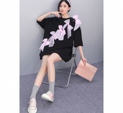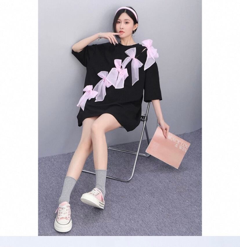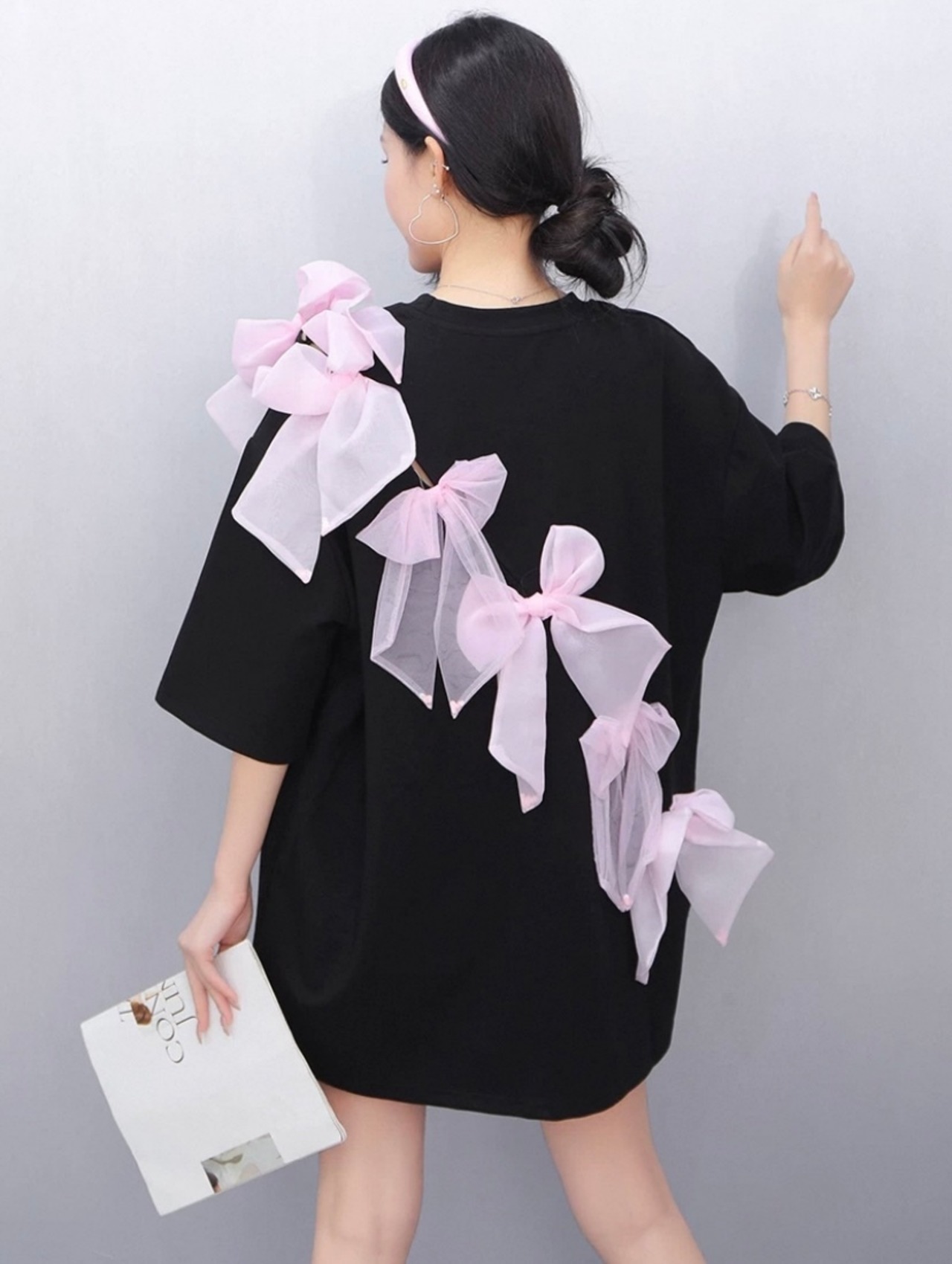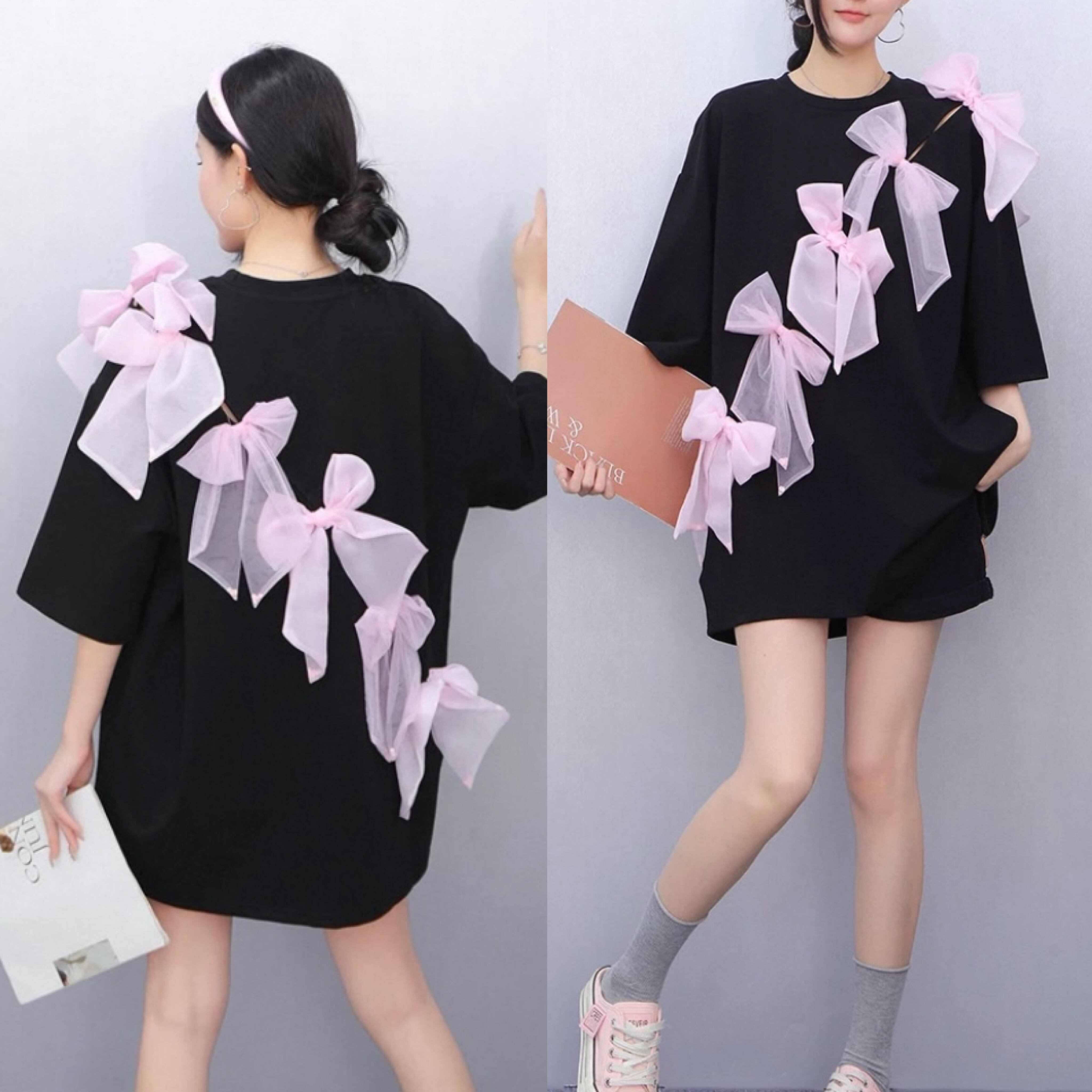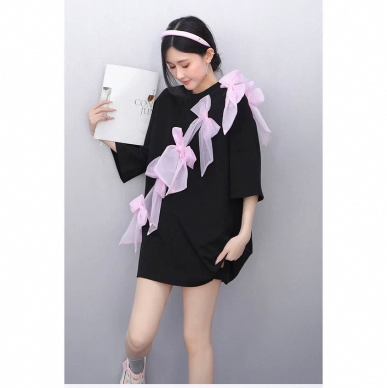 デコレーション リボン、ピンク、黒 Tシャツ トップス