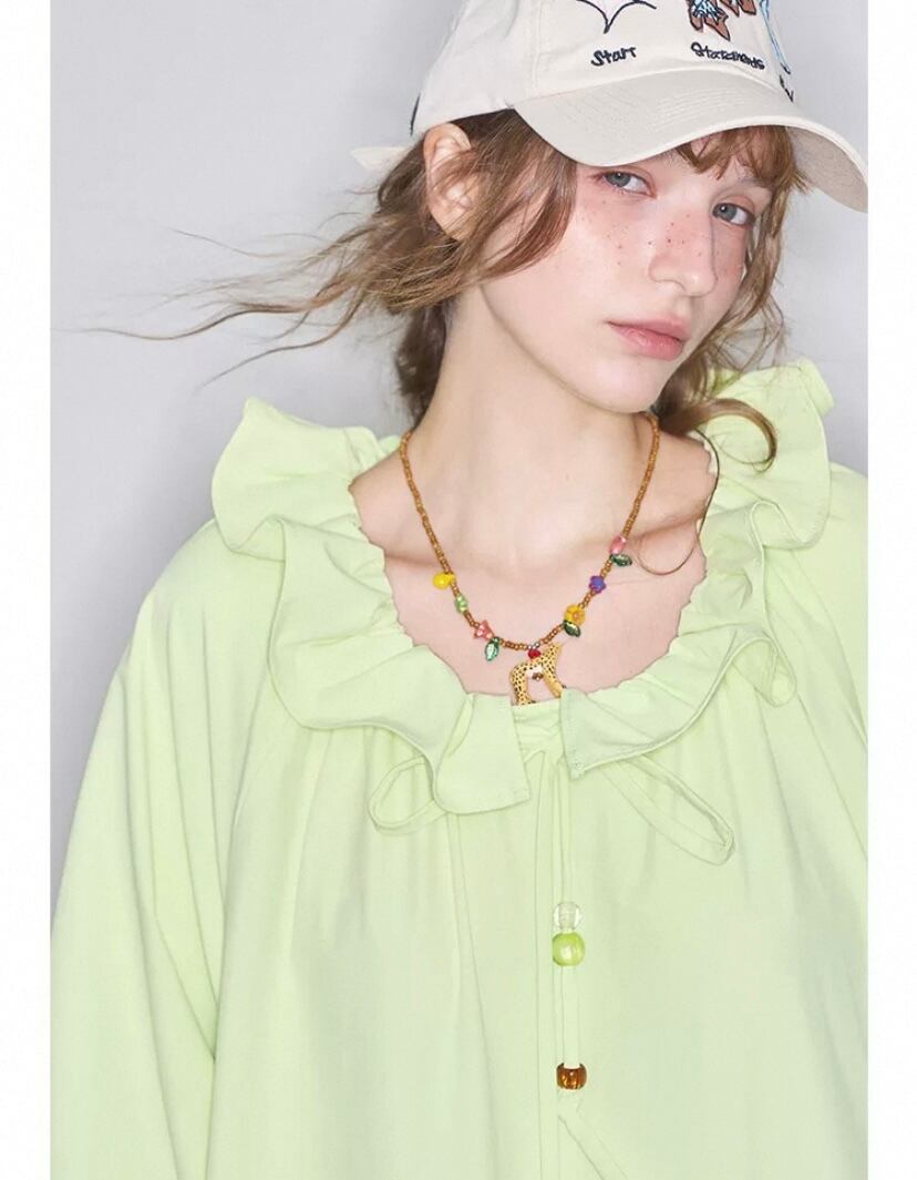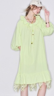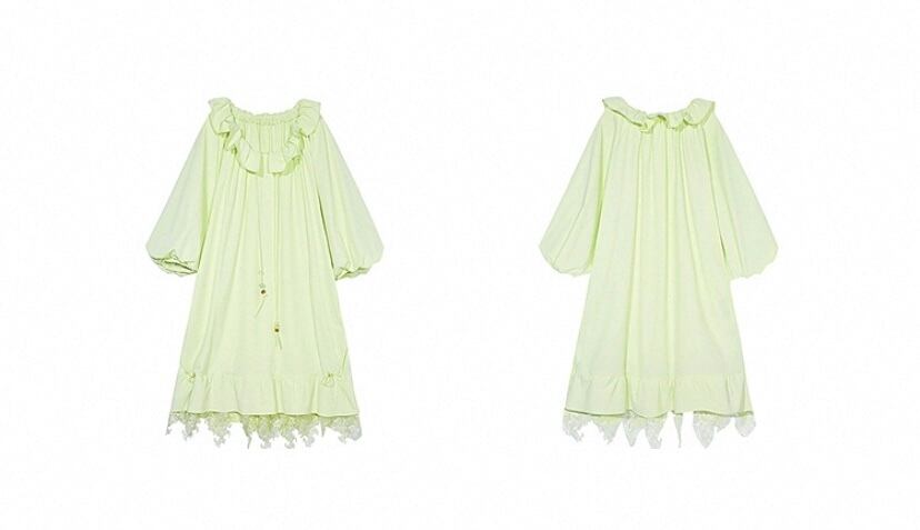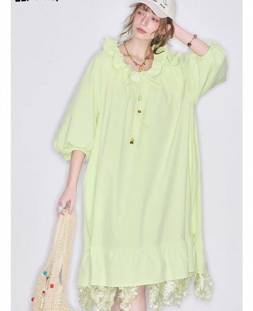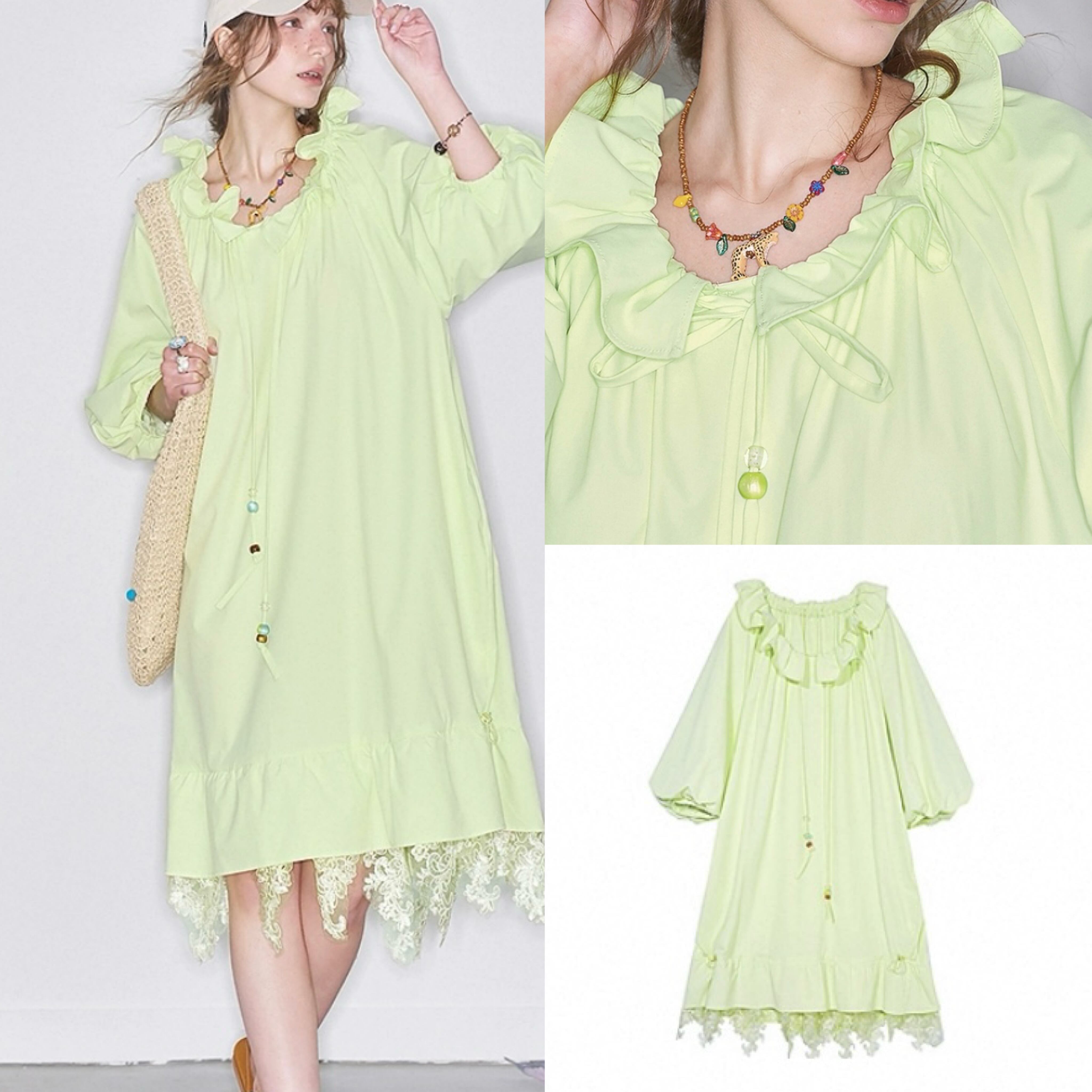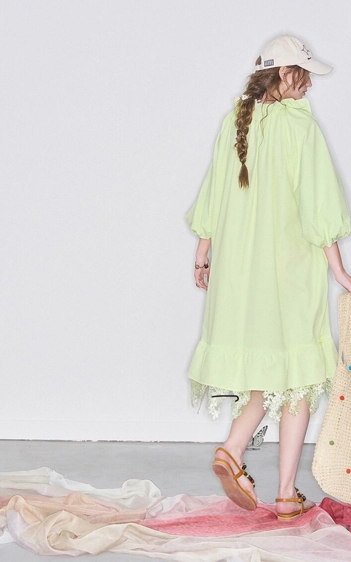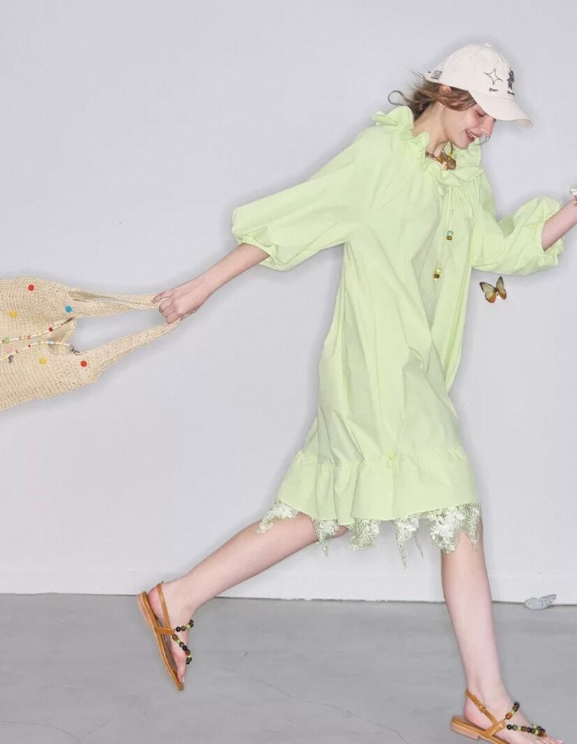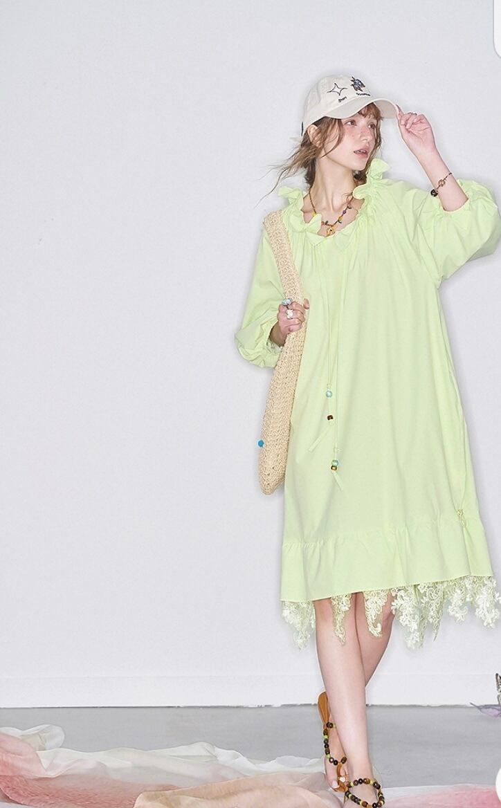 黄色 緑、フリル リボン ワンピース