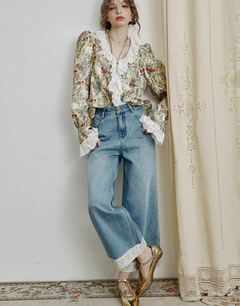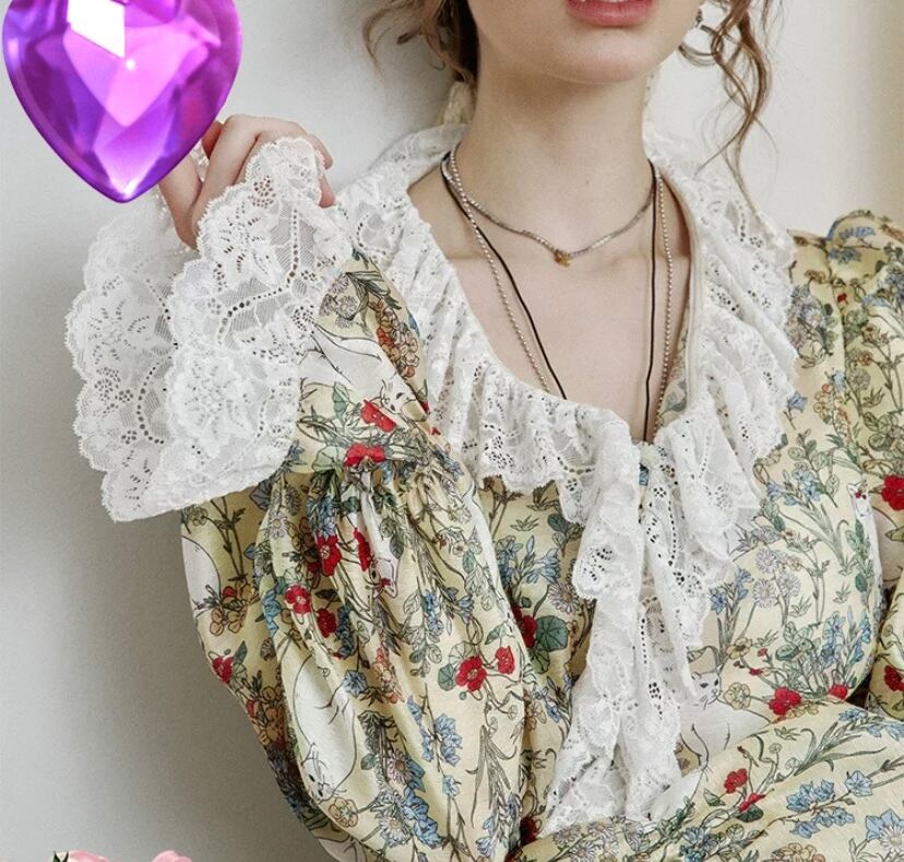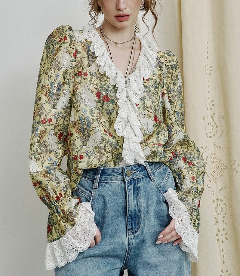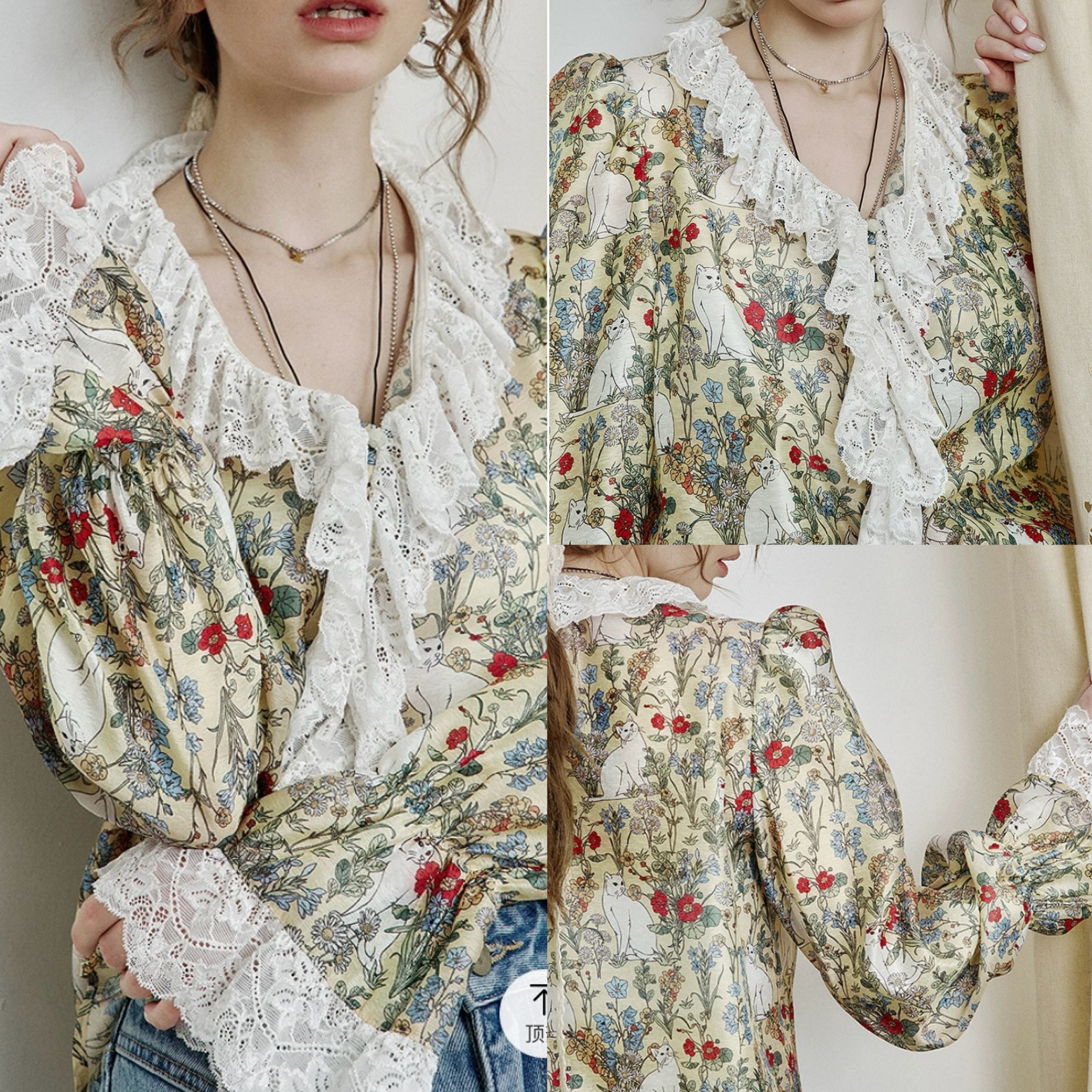 花柄、フラワー ブラウス、トップス フリル ねこ アニマル
