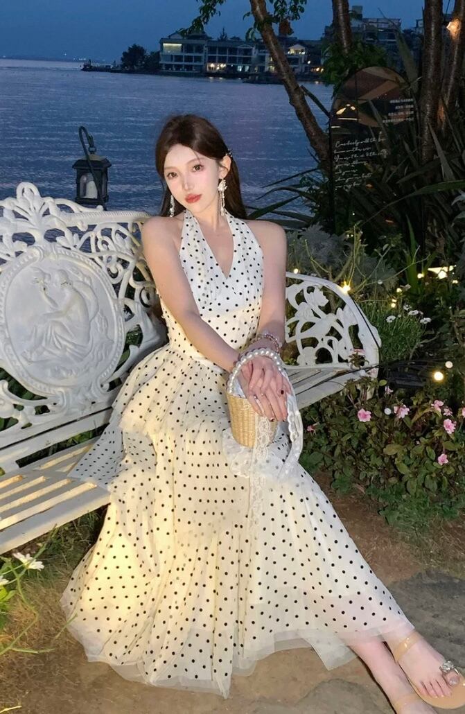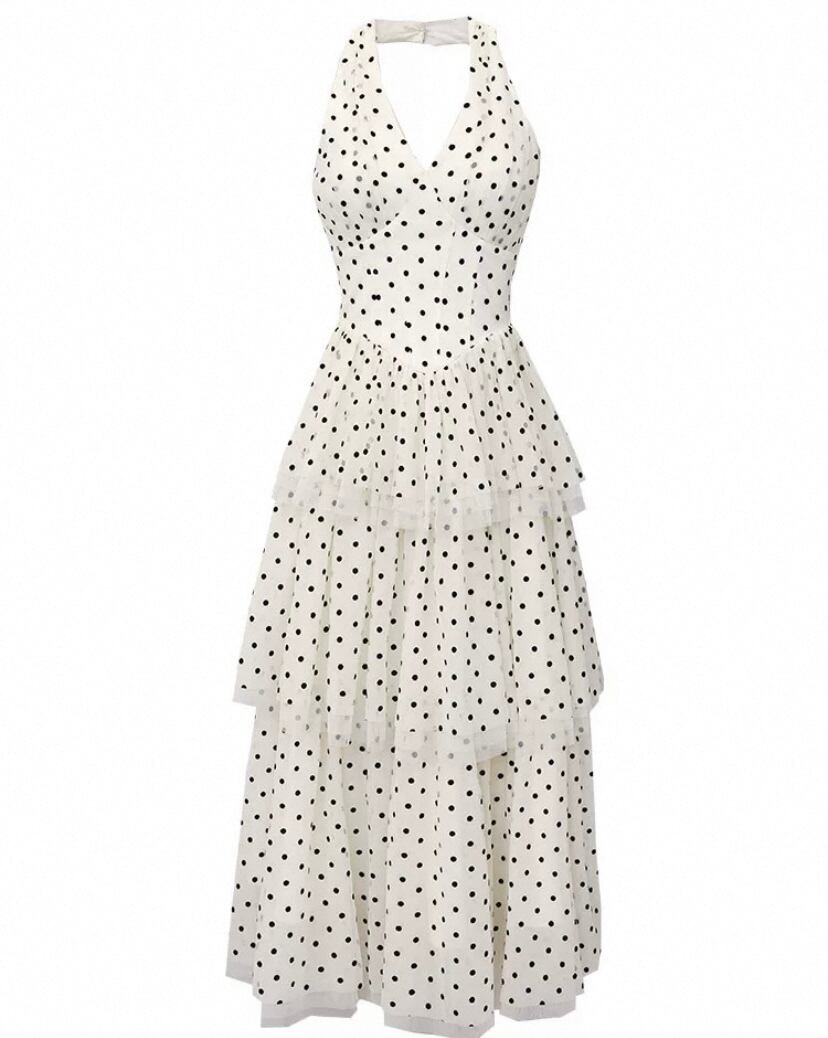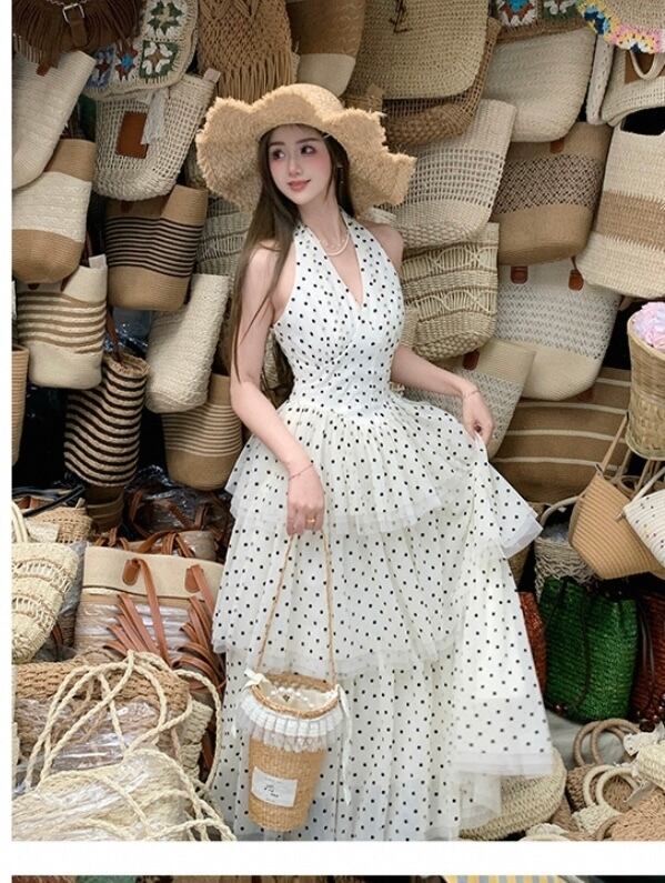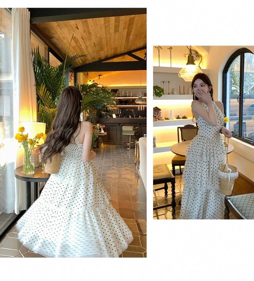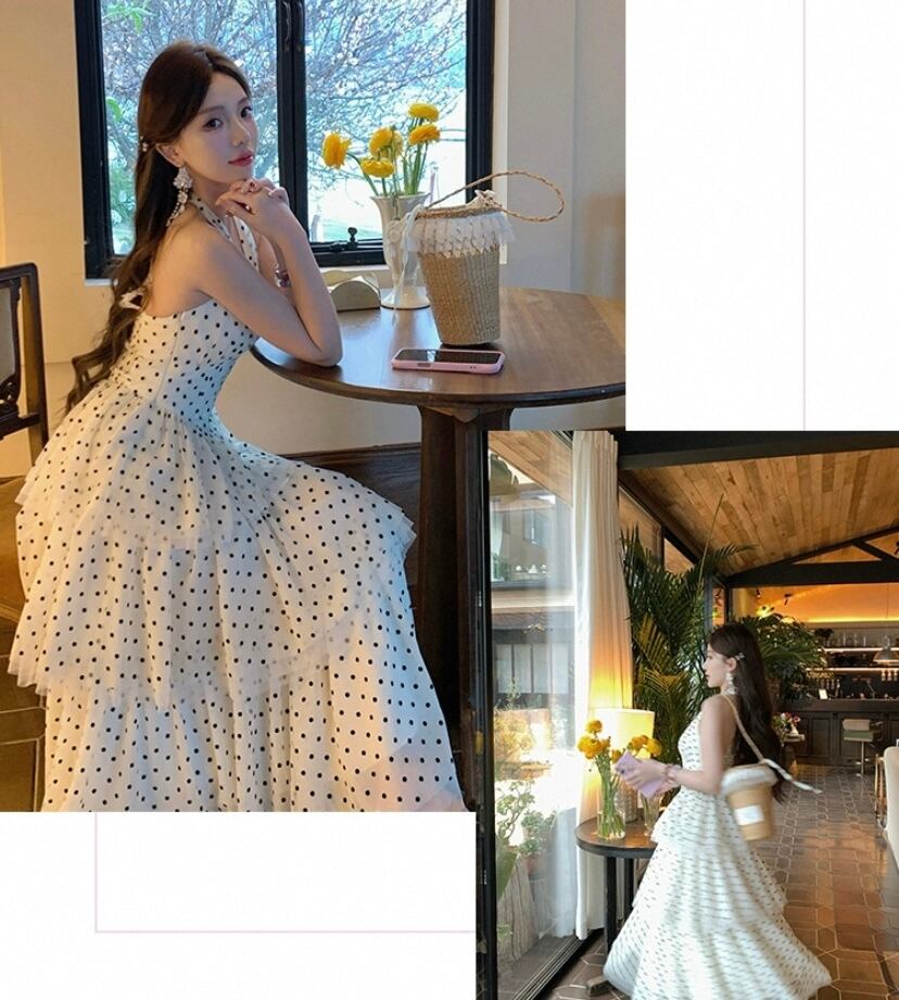 白 水色 水玉 ドット ワンピース ホルターネック ドレス