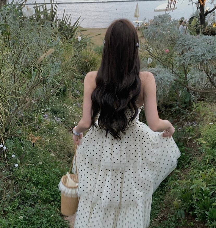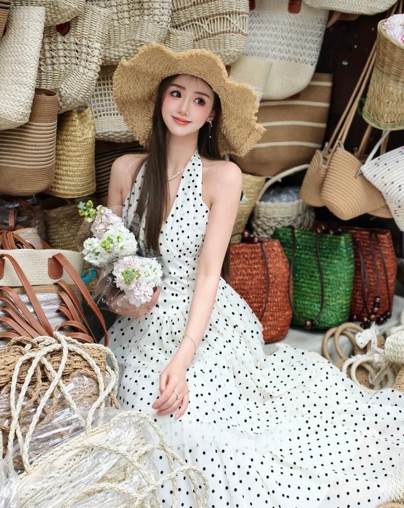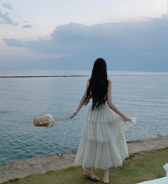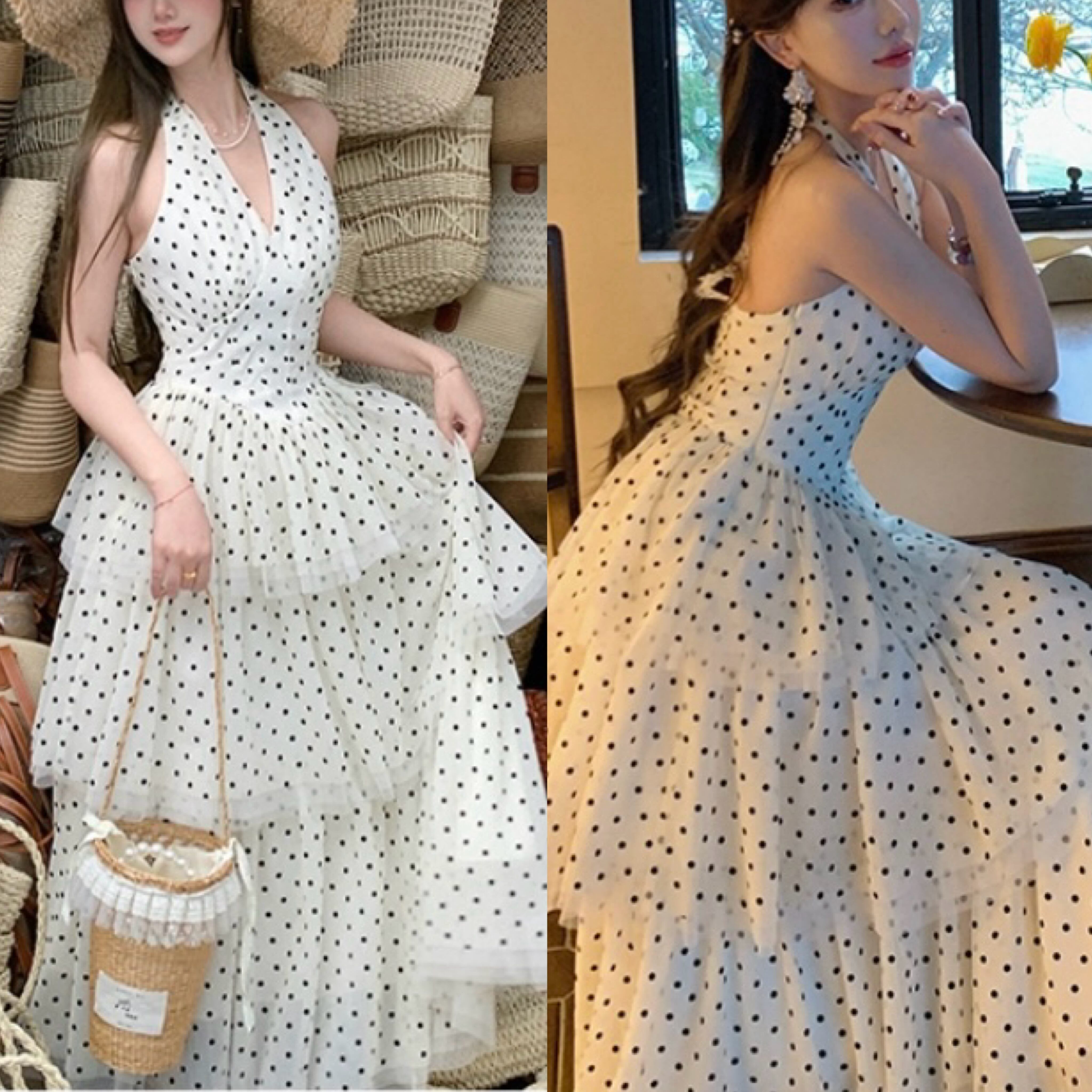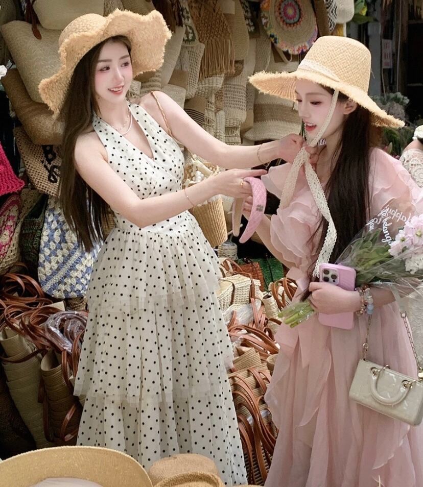 白 水色 水玉 ドット ワンピース ホルターネック ドレス