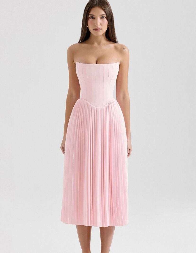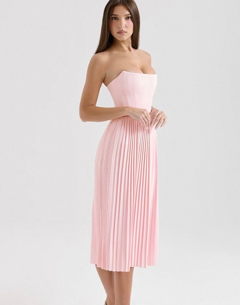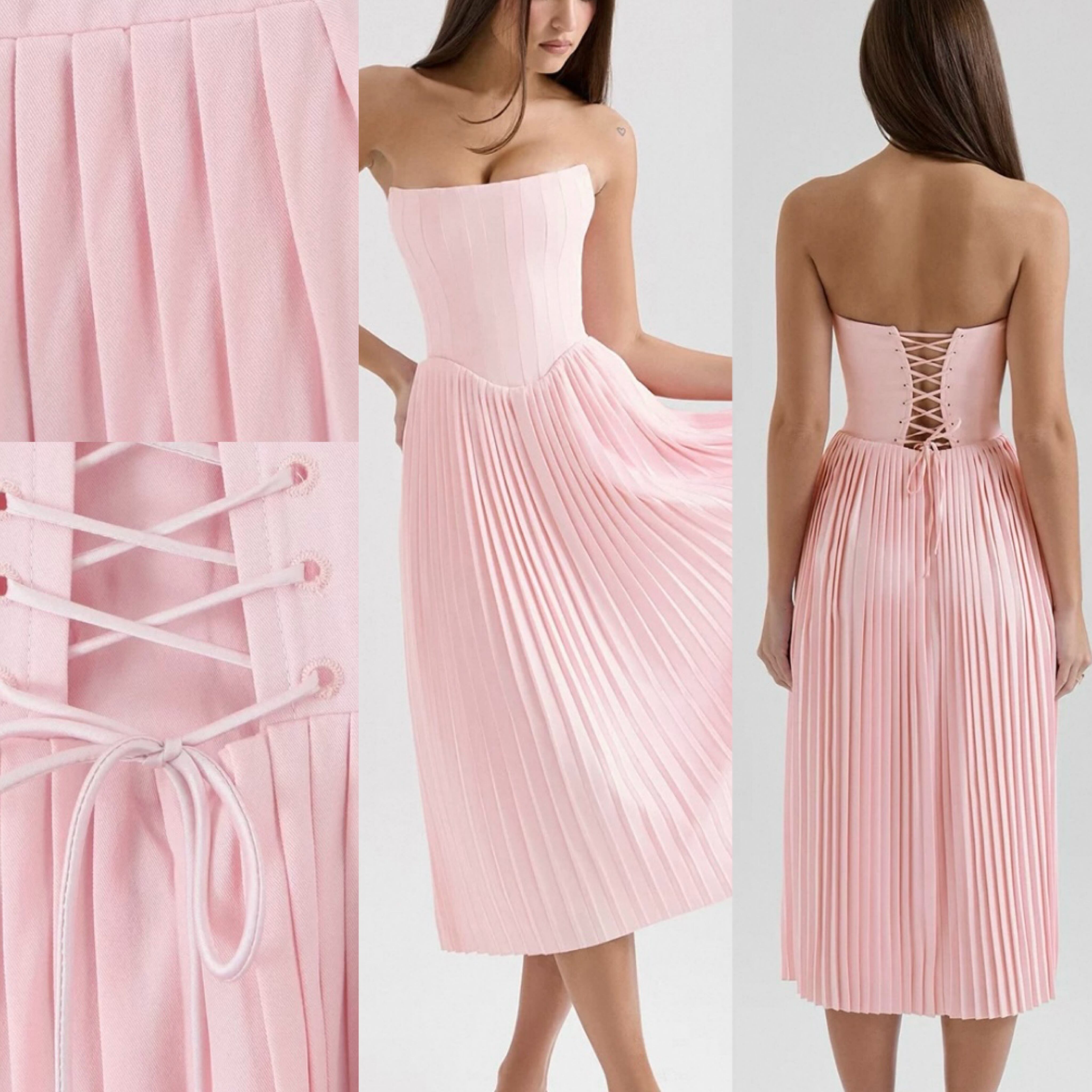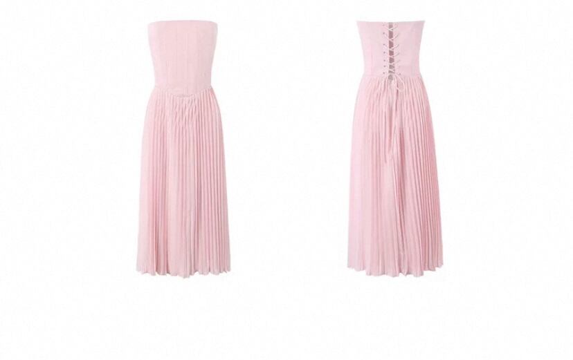 ベアトップ ピンク あみあげ ワンピース プリーツ