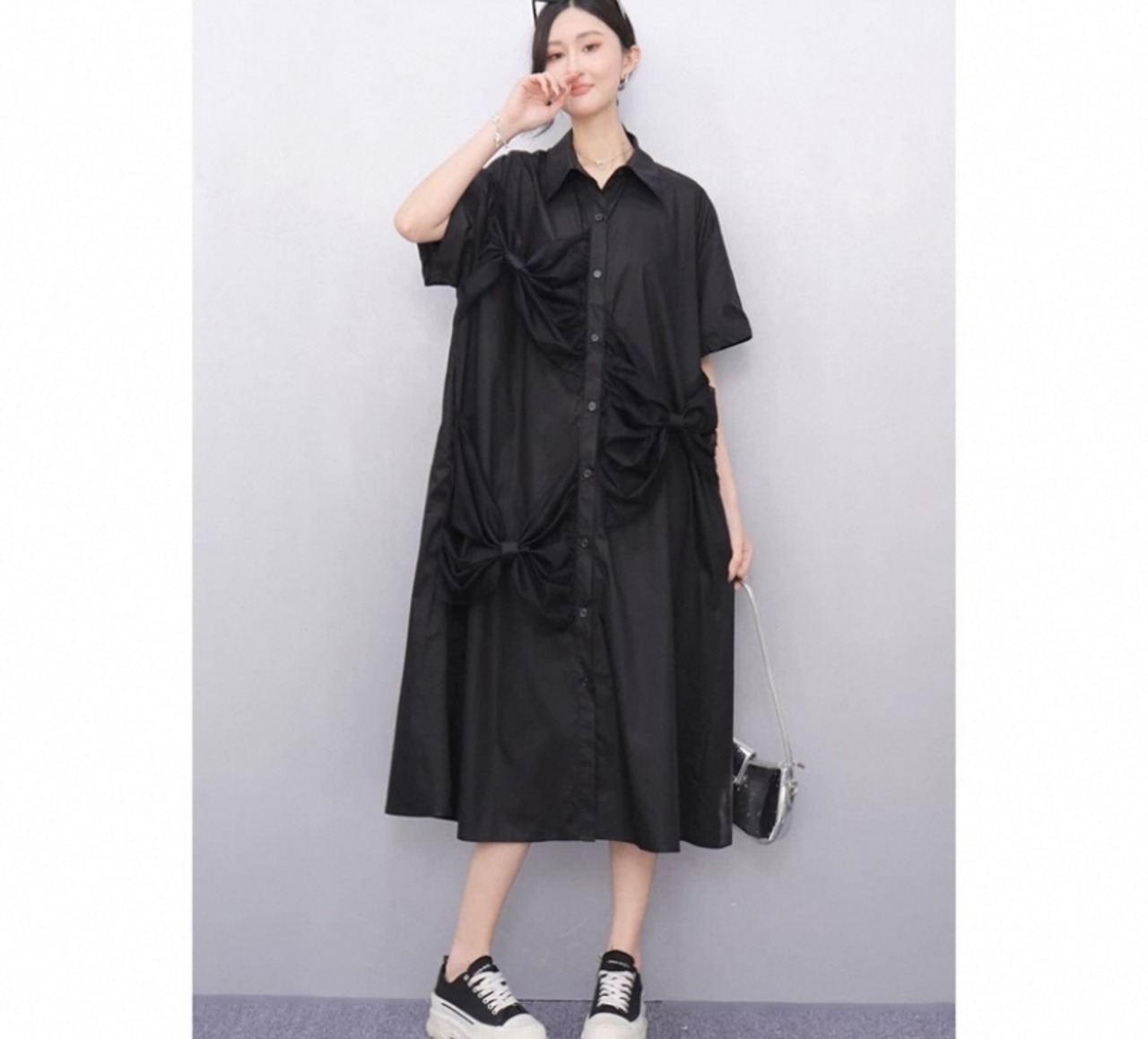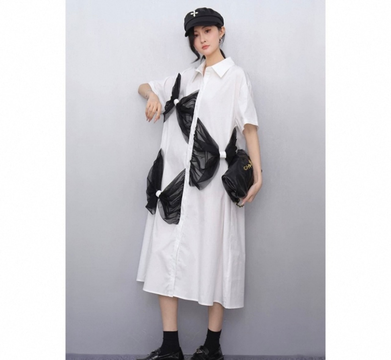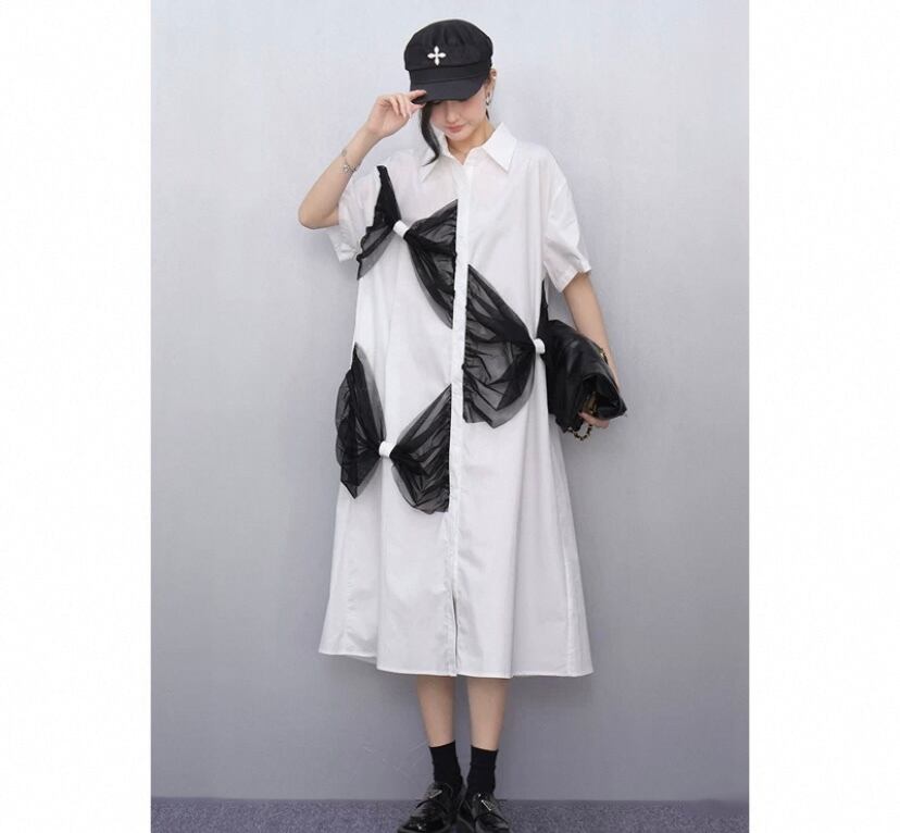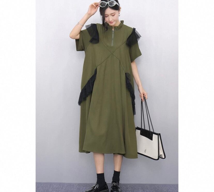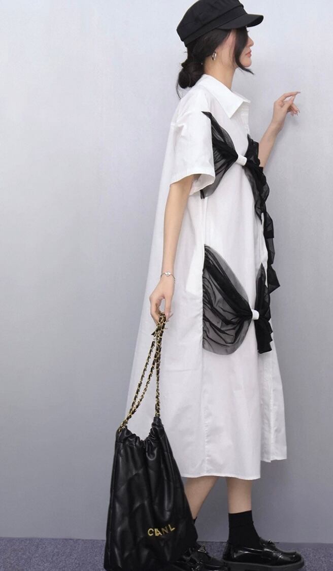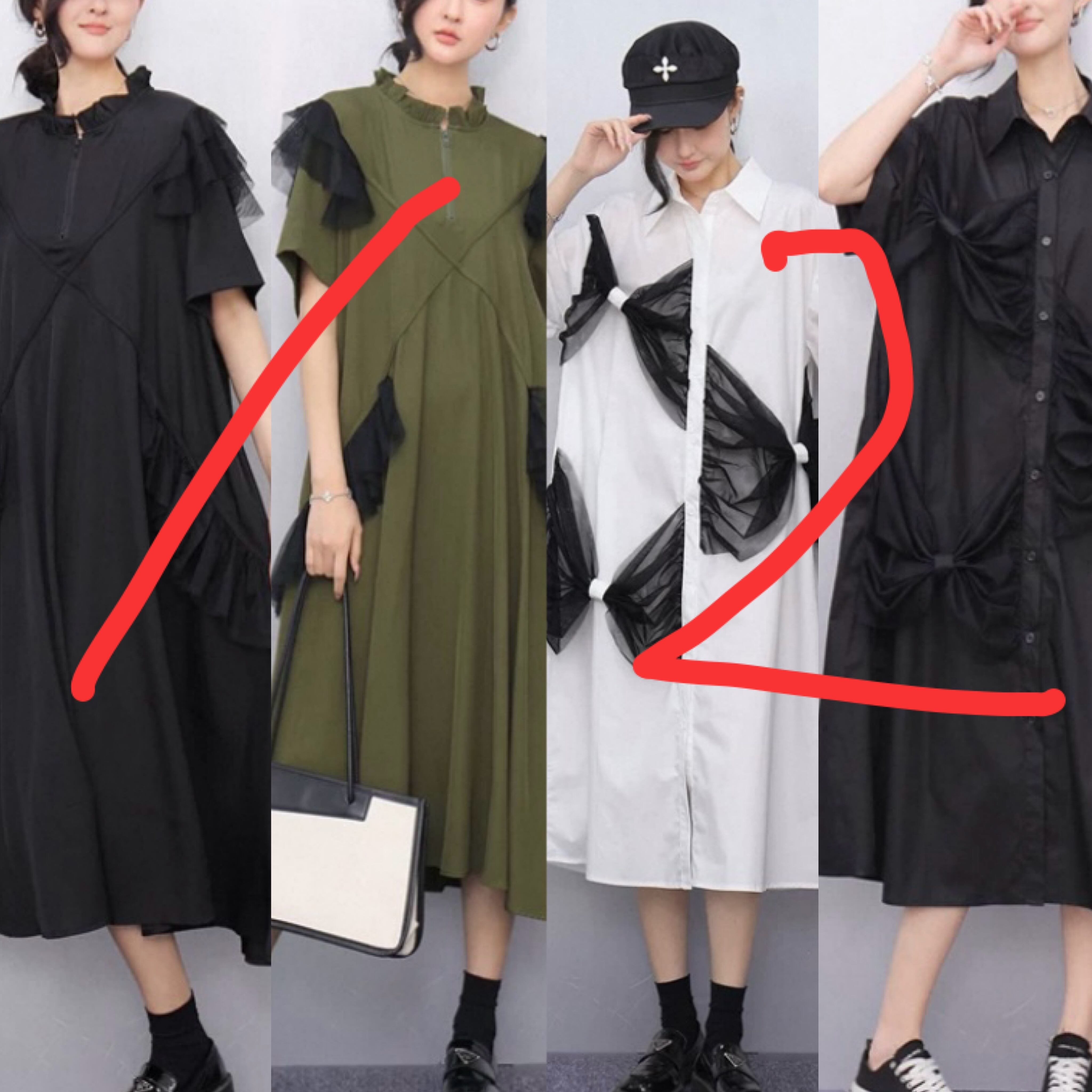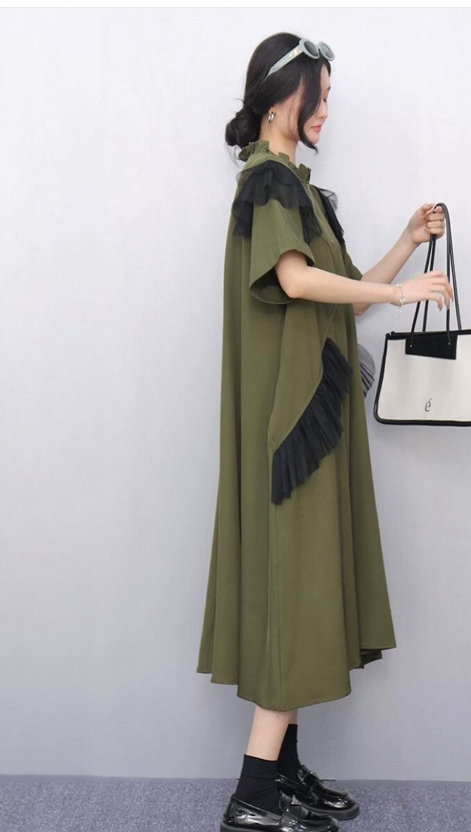 カジュアル、シンプル、緑、黒 リボン、白シャツ、ブラウスワンピース、ゆったり