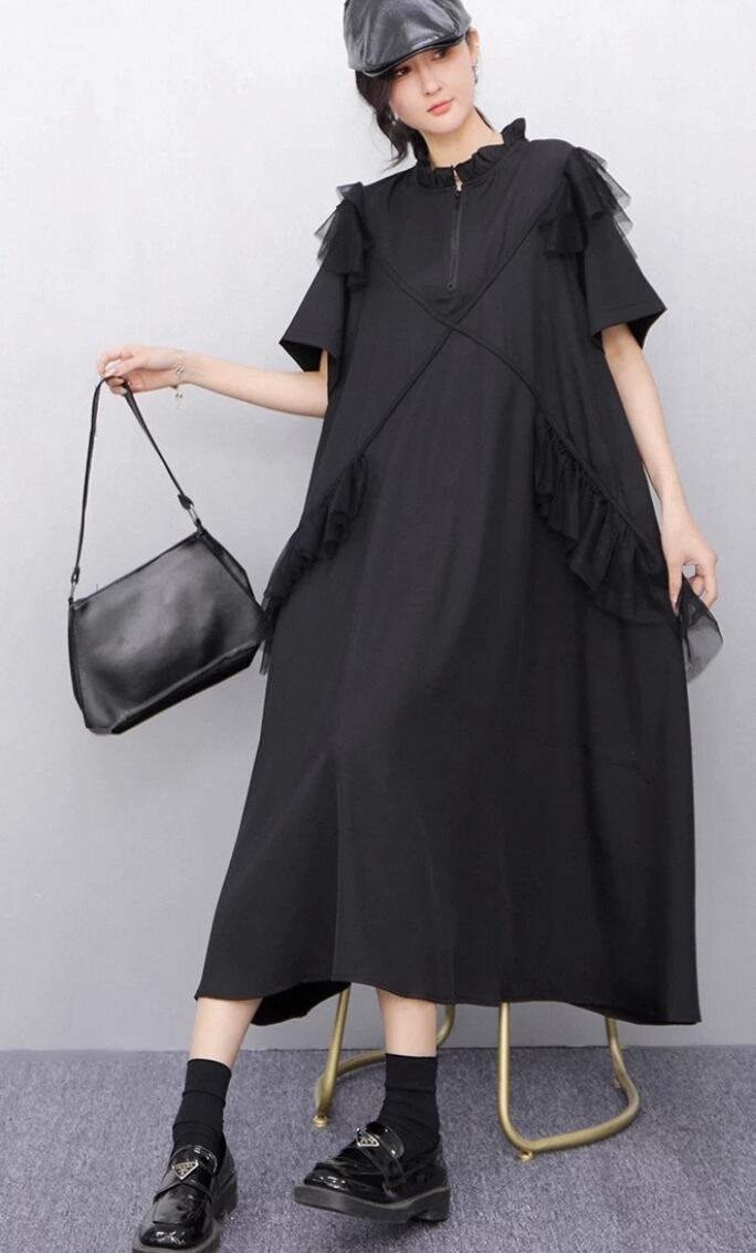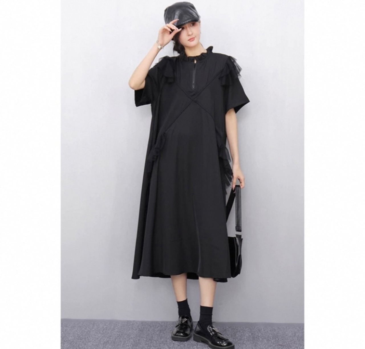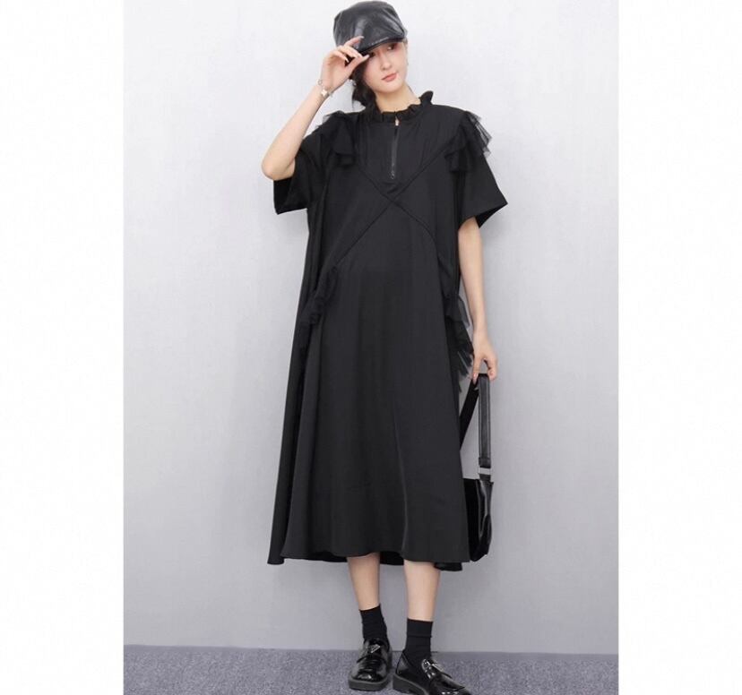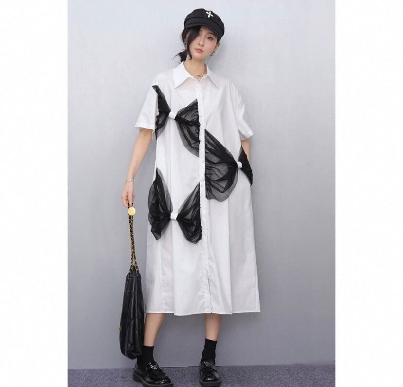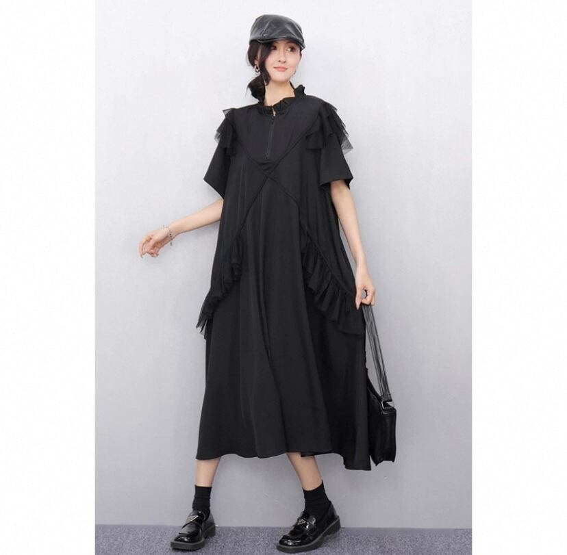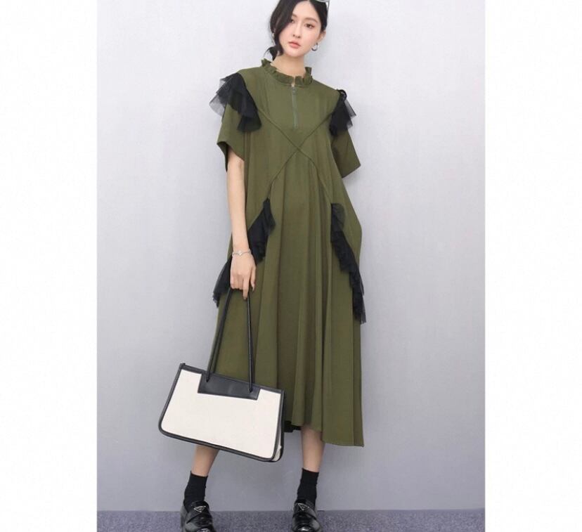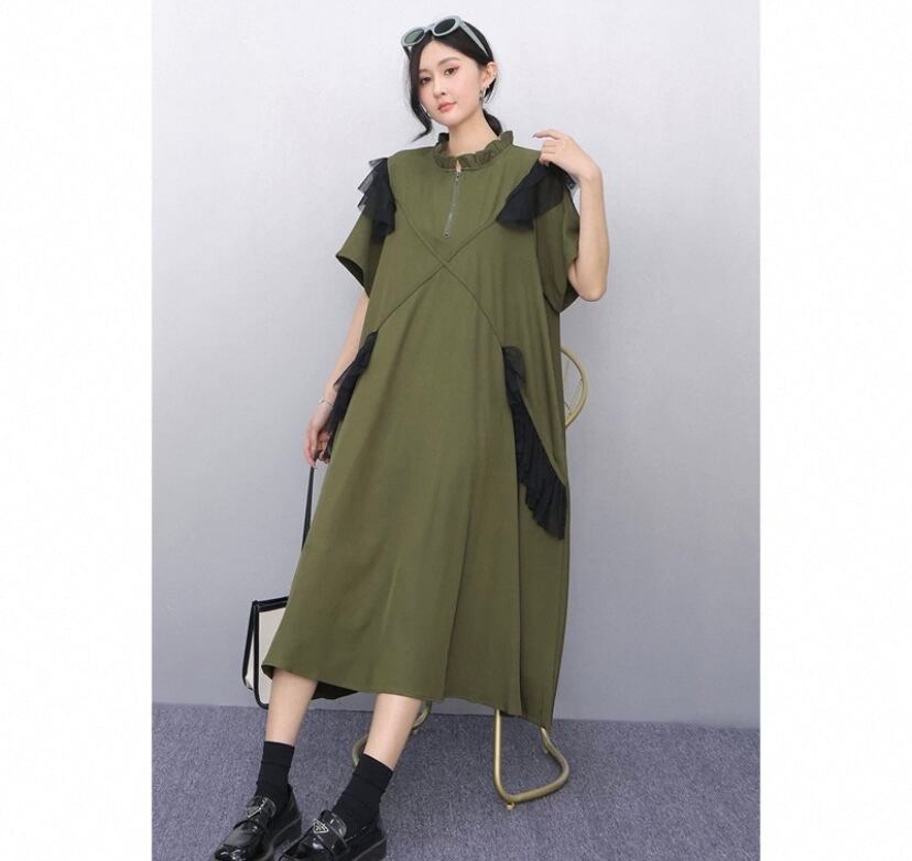 カジュアル、シンプル、緑、黒 リボン、白シャツ、ブラウスワンピース、ゆったり