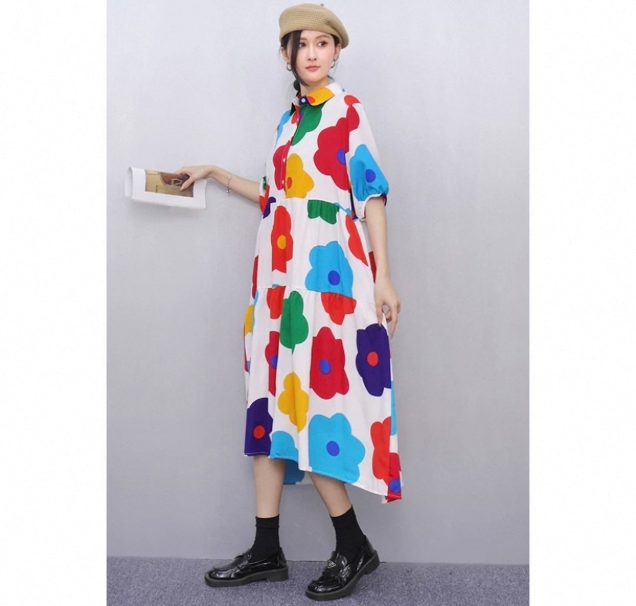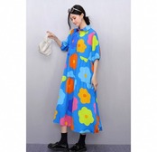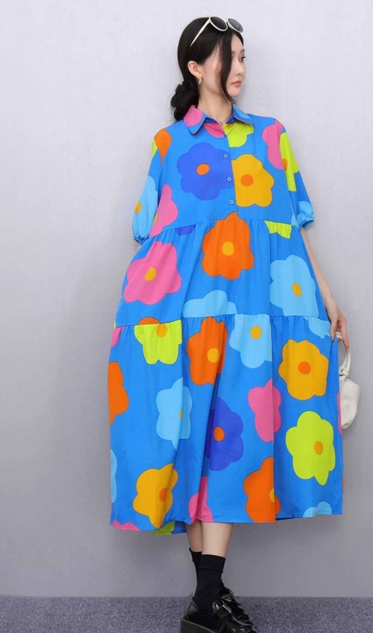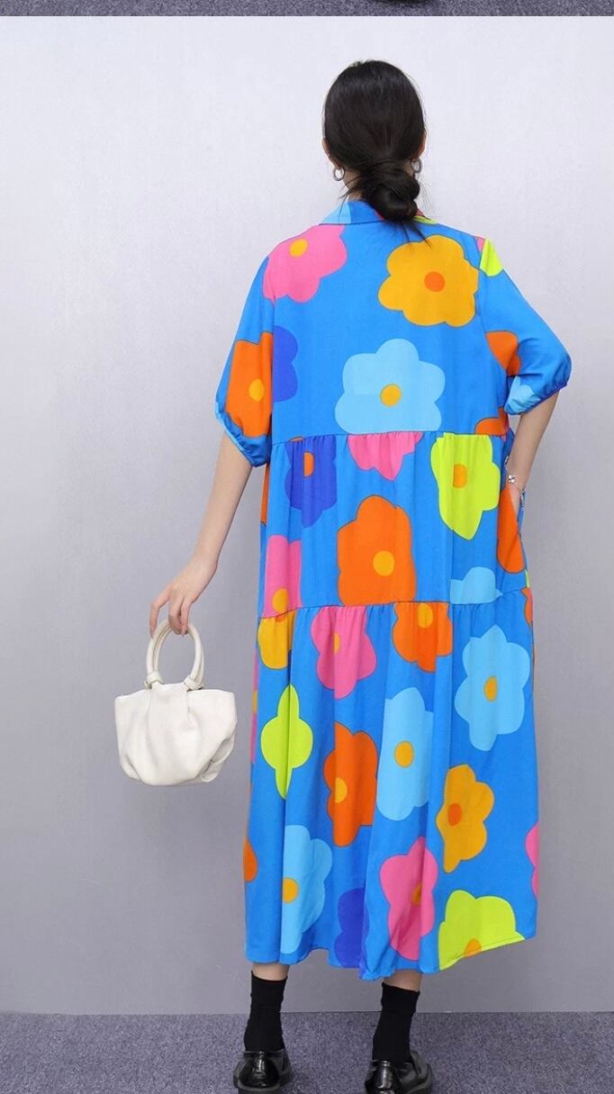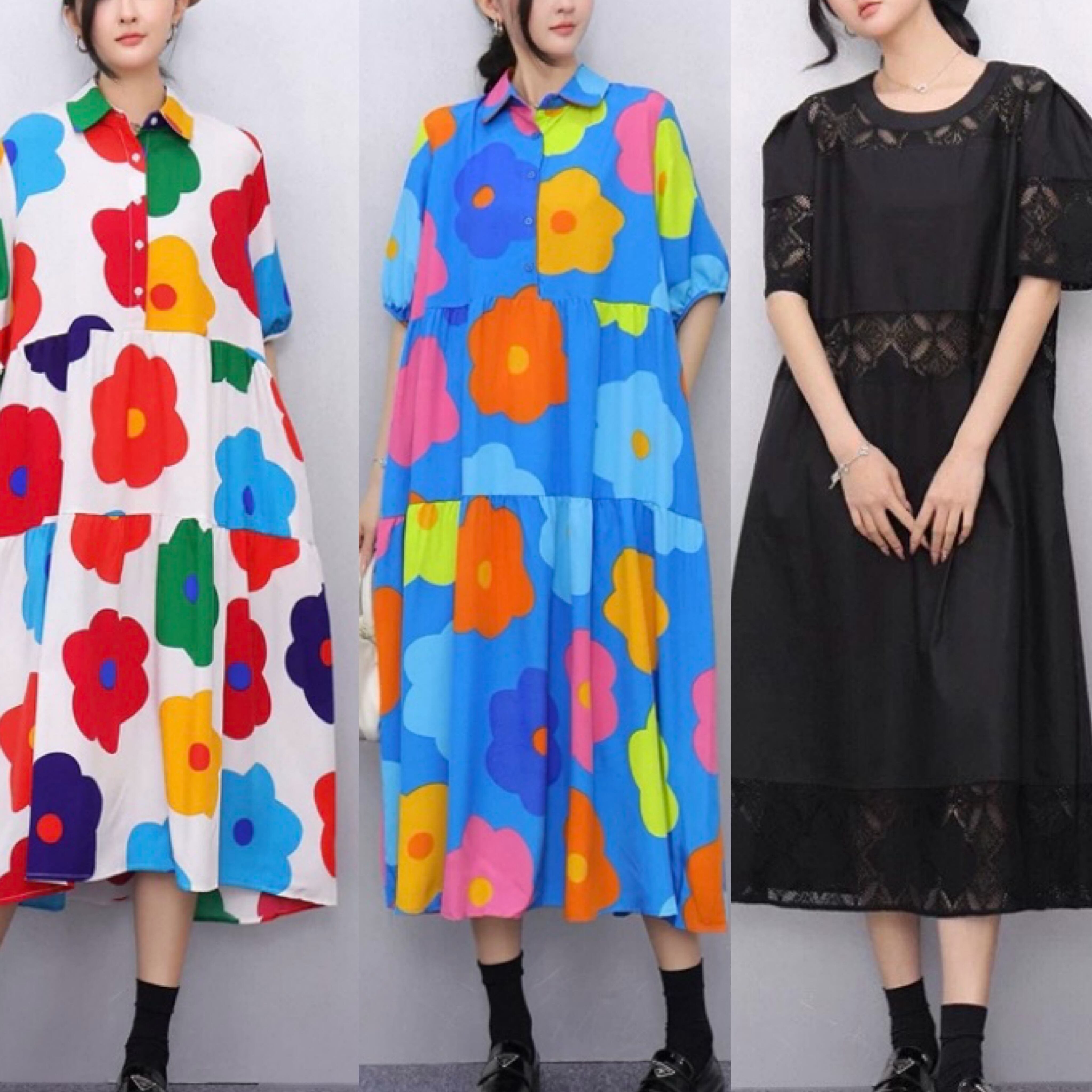 カラフル 白 水色、黒 ワンピース、ゆったり シャツ ブラウス