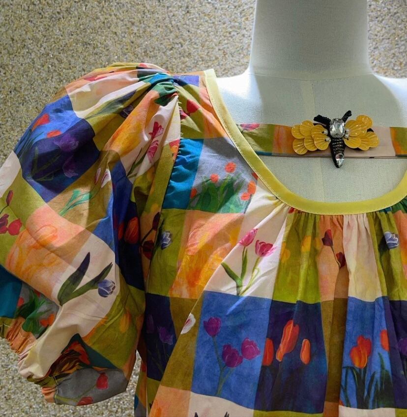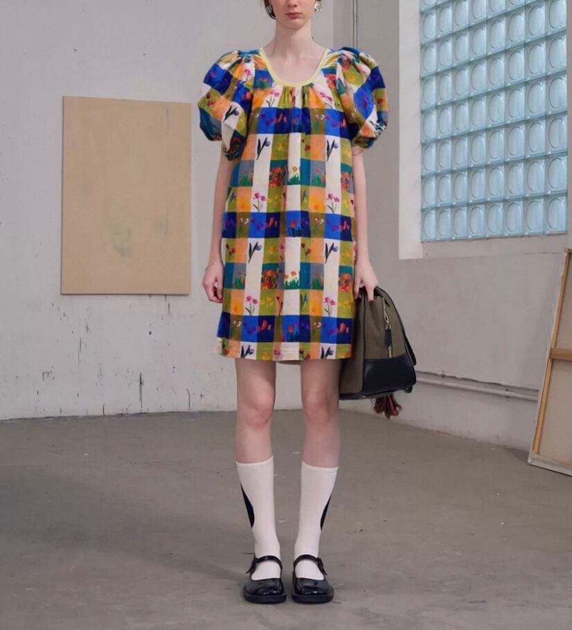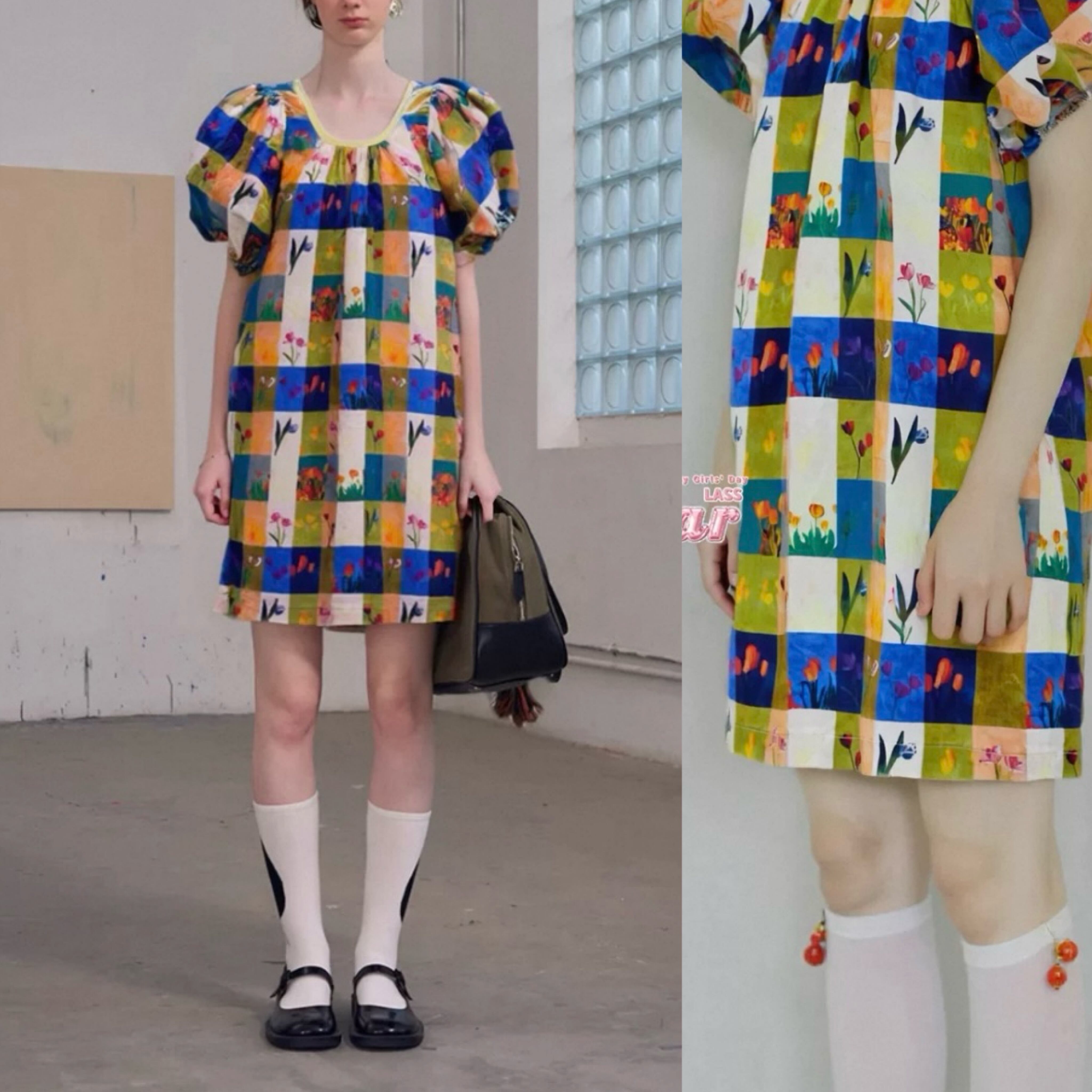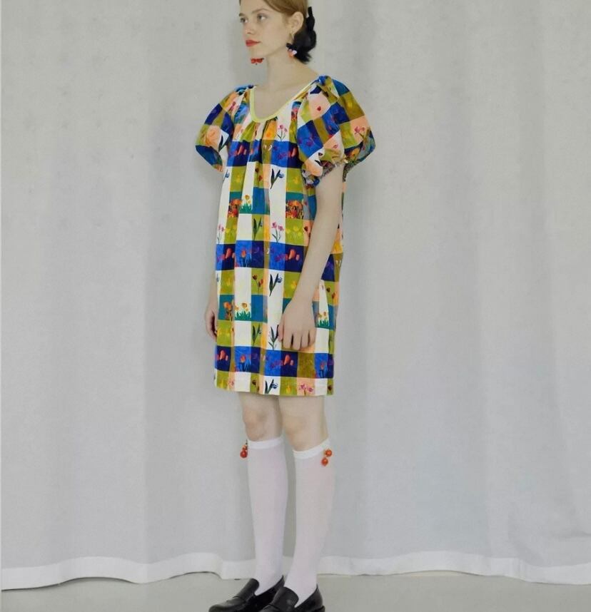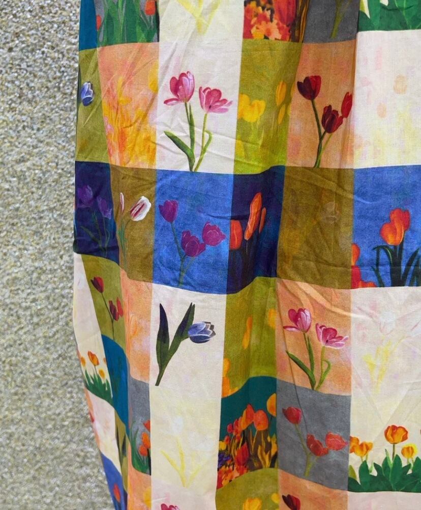 チェック、ネイビー、花柄、黄色 チューリップ フラワー チュニック ブラウス