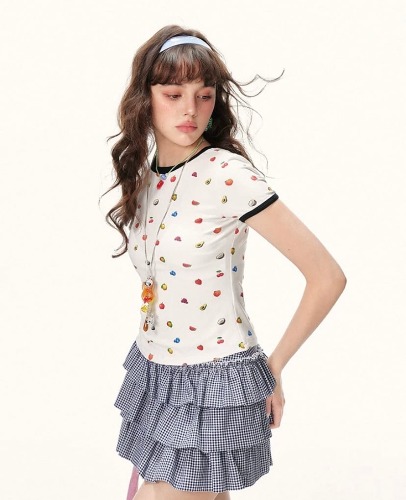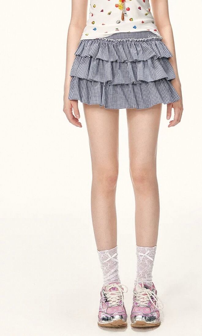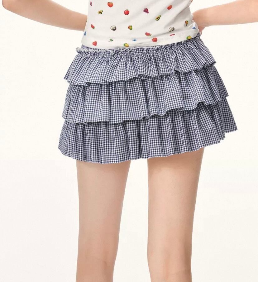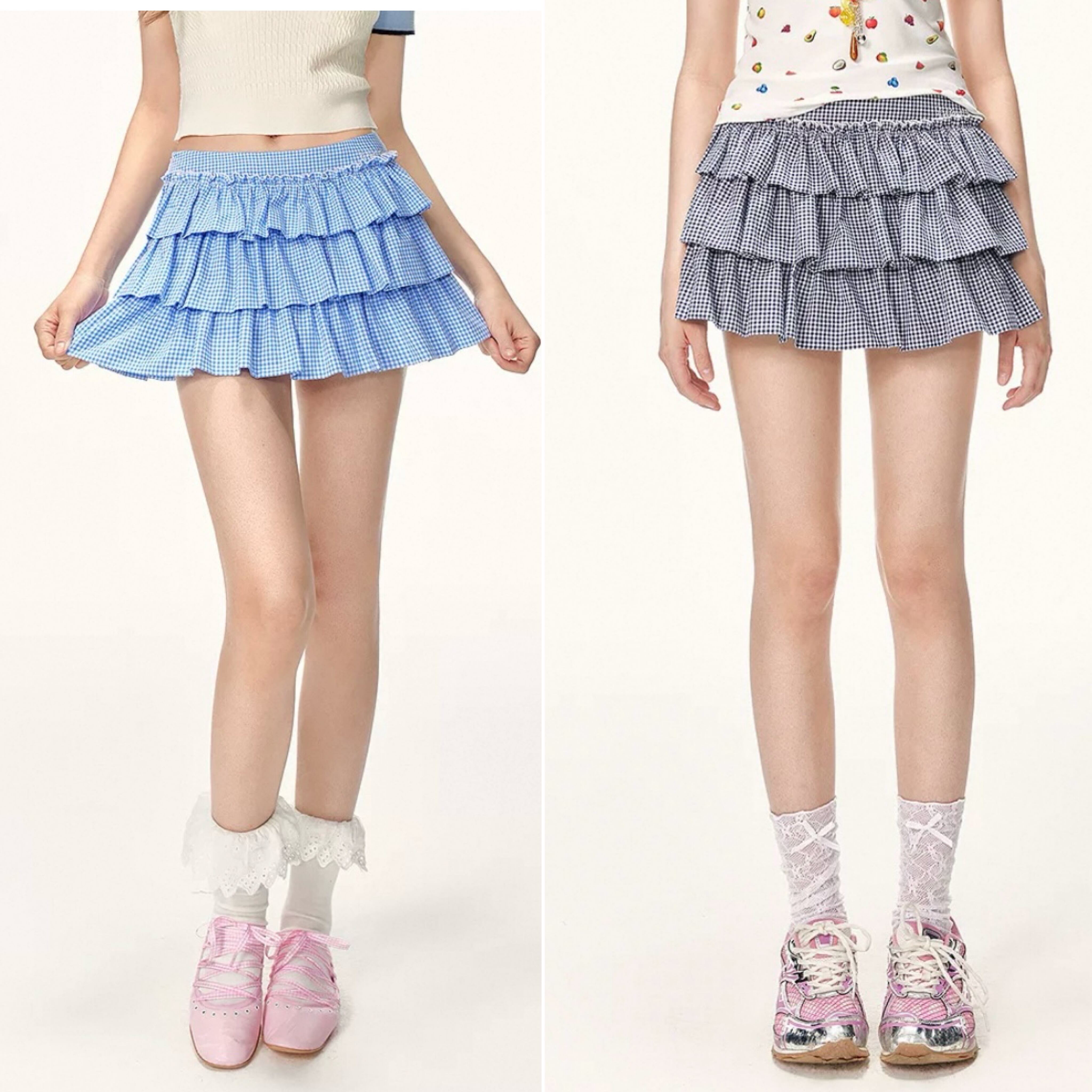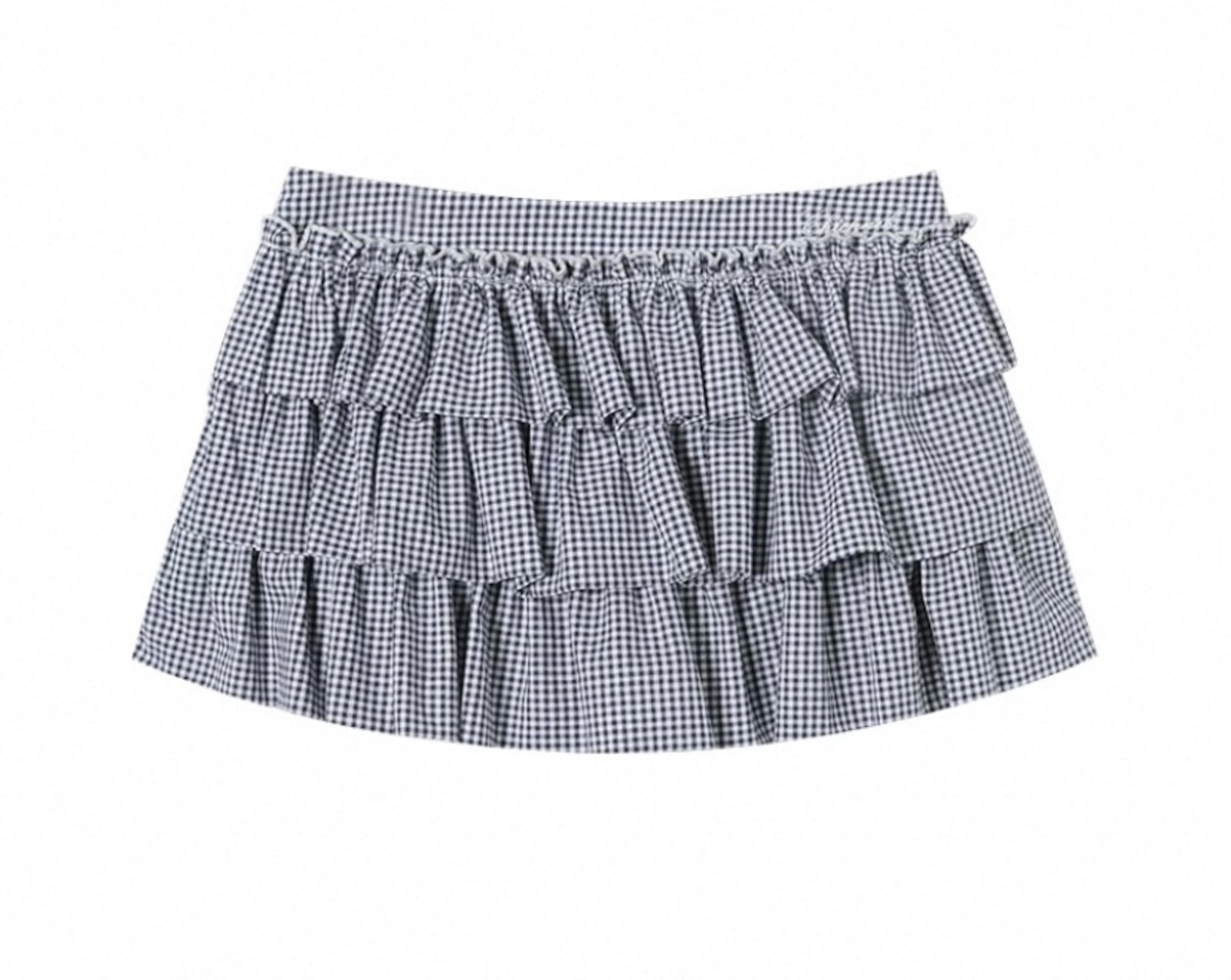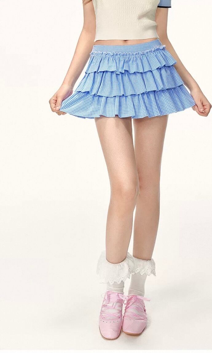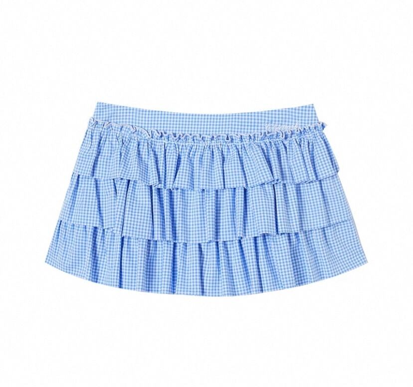 ミニスカート チェック、水色、黒 ボトムス フリル