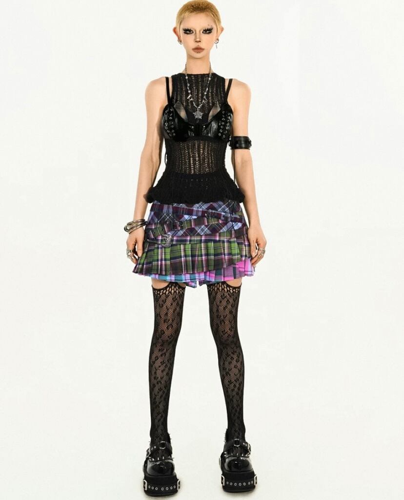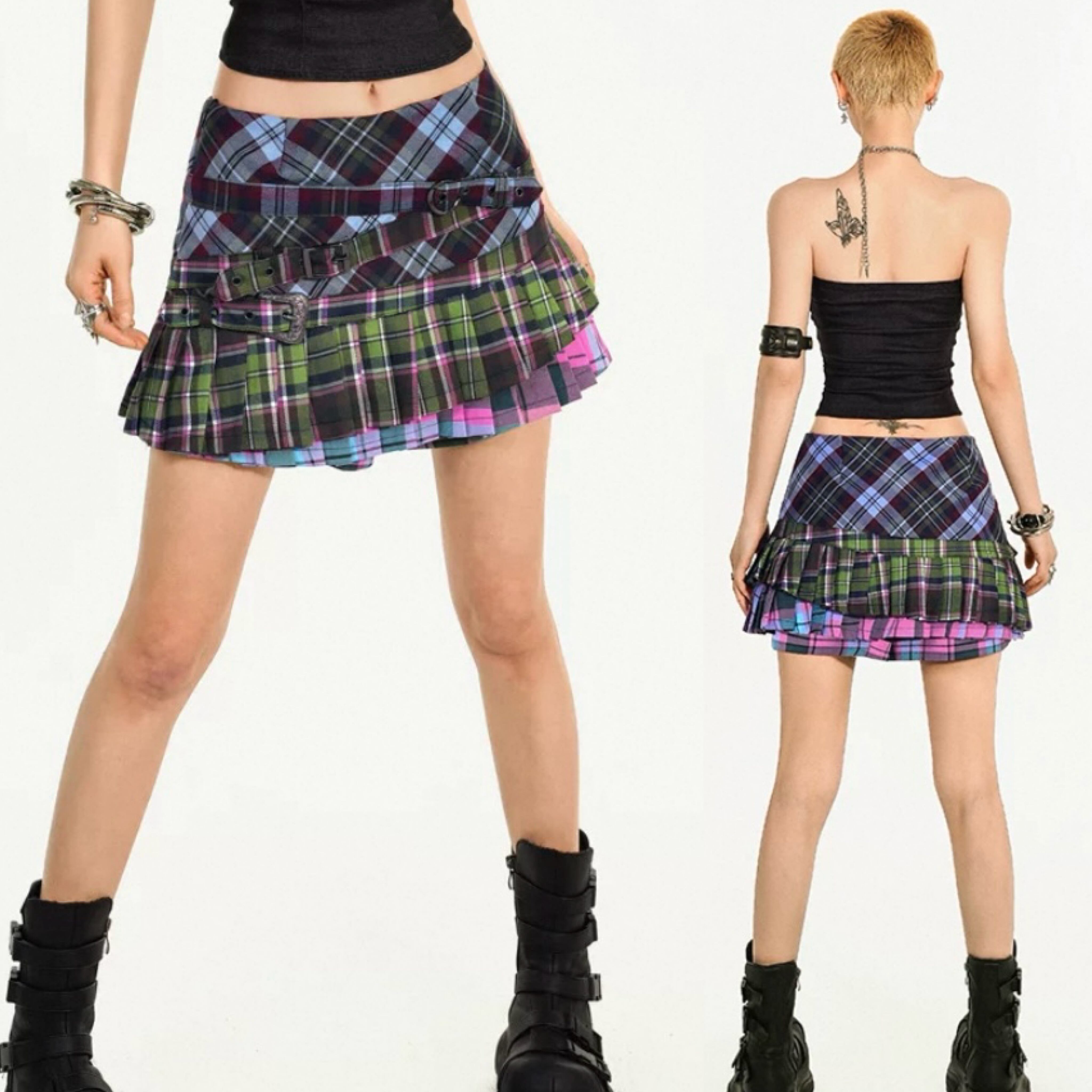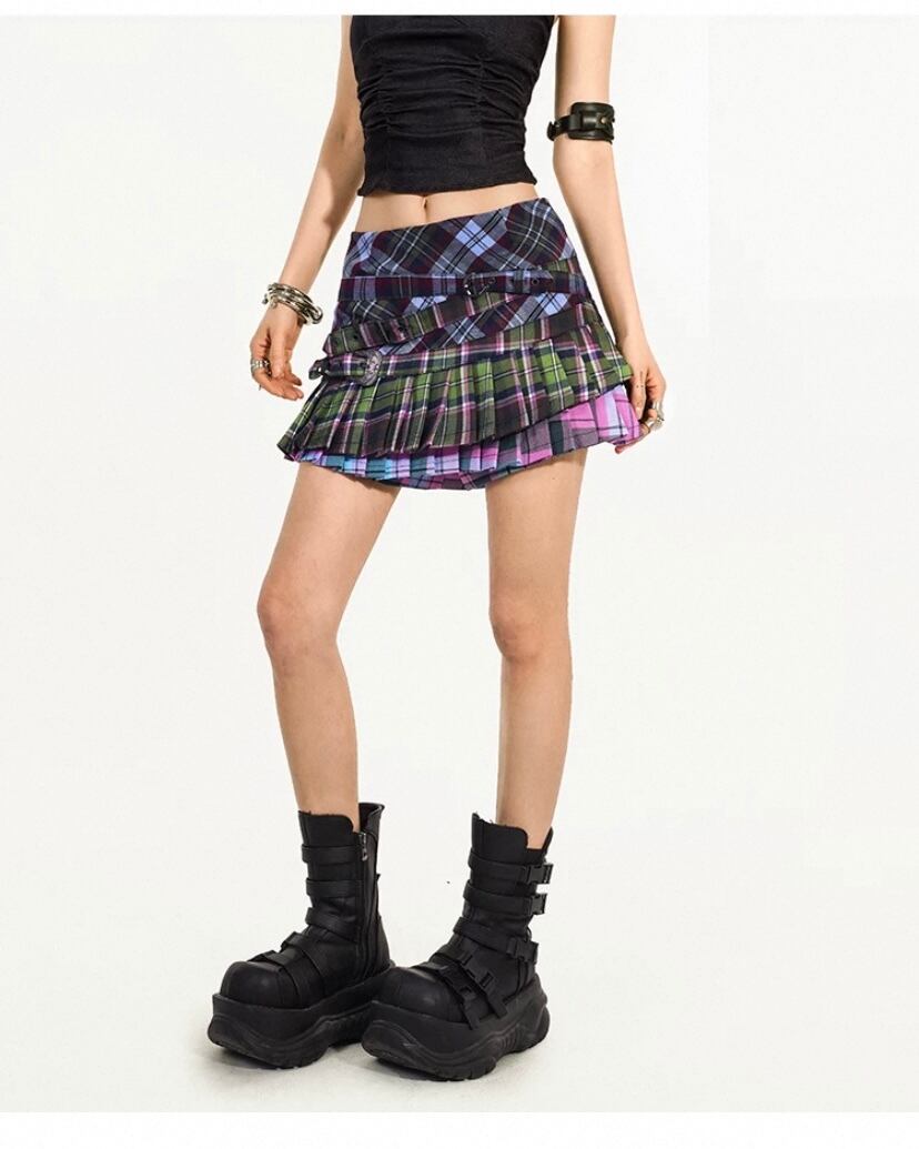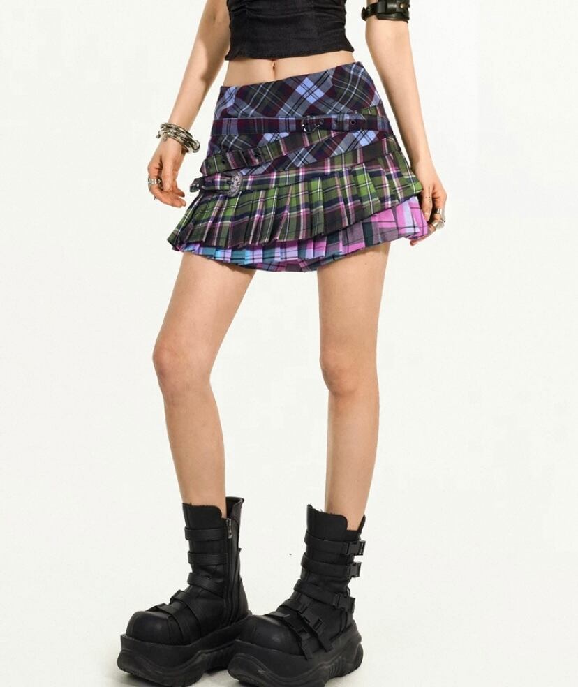 ミニスカート ボトムス、プリーツスカート、紫 緑 黒 チェック