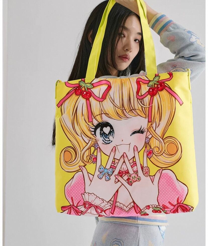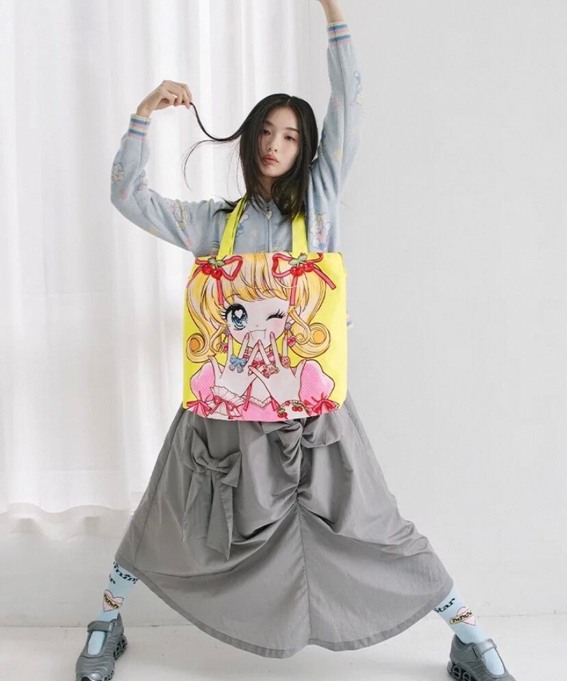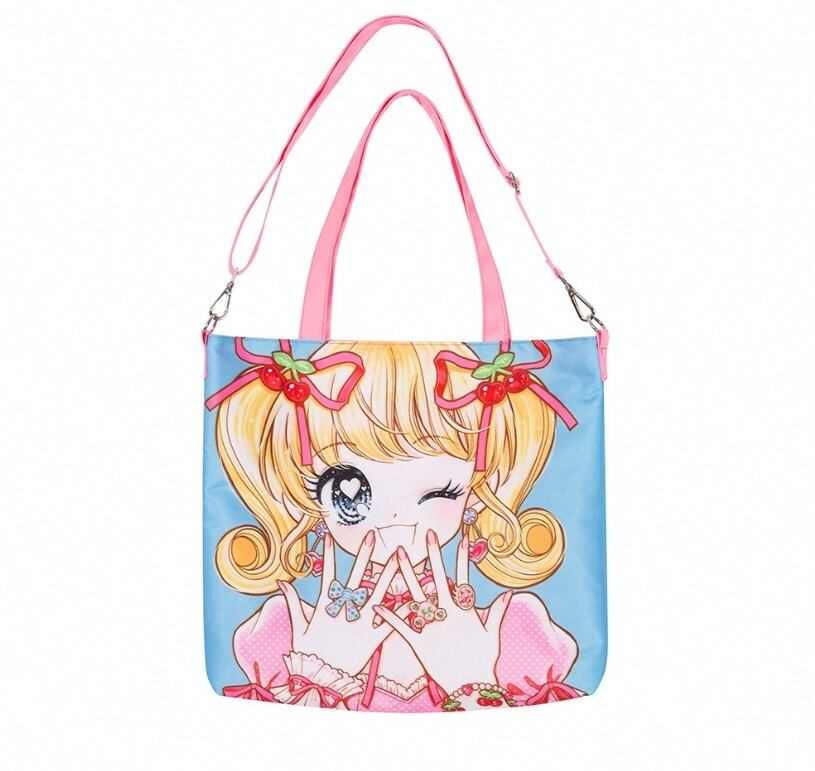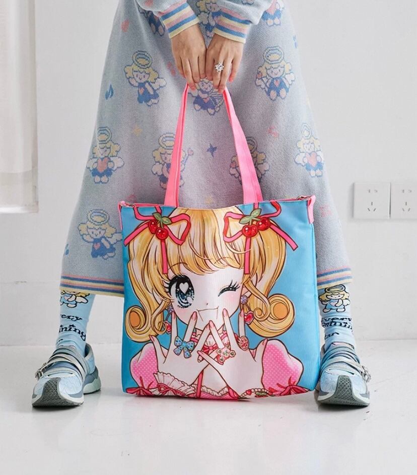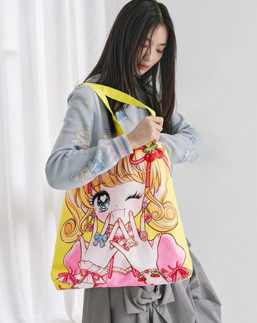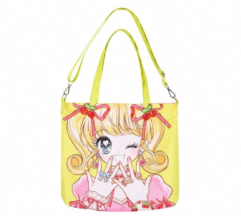 黄色 ピンク 水色 顔 女の子、漫画 リボン かわいい トートバック カバン