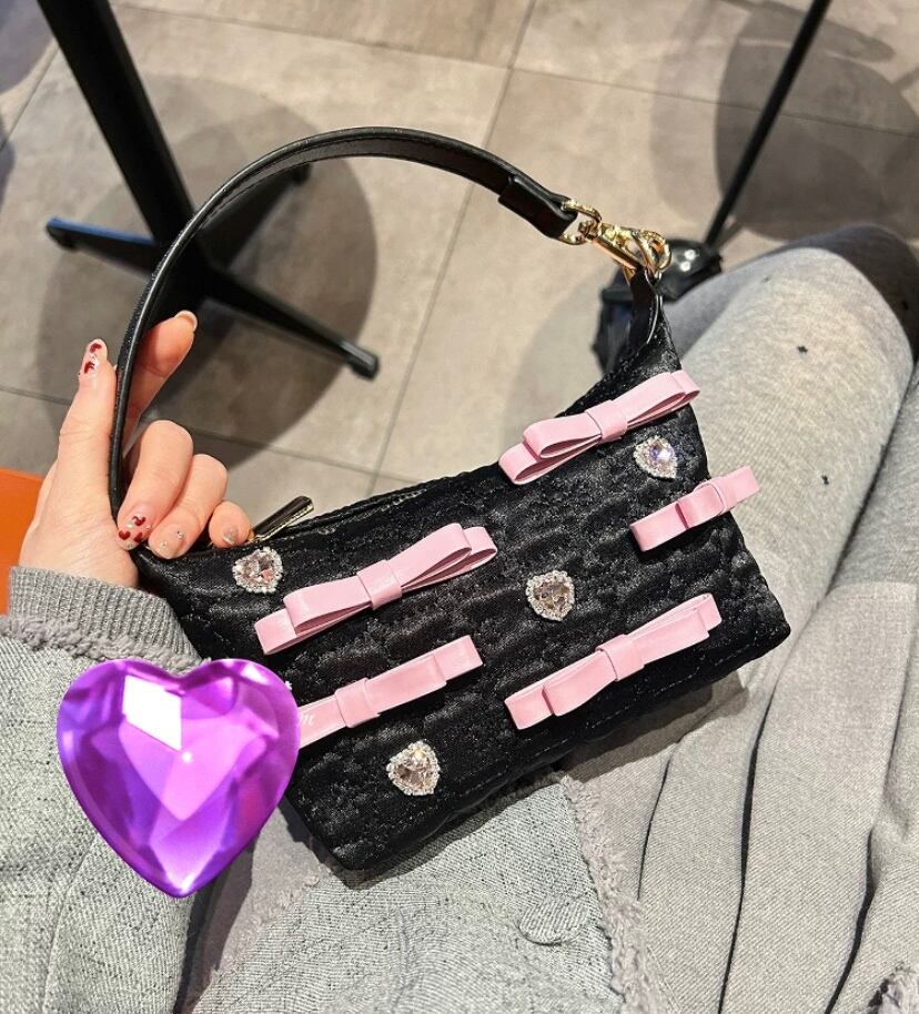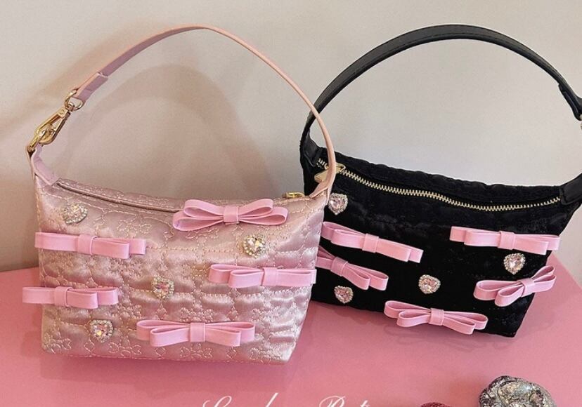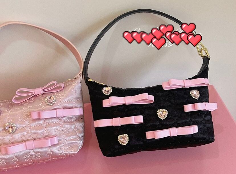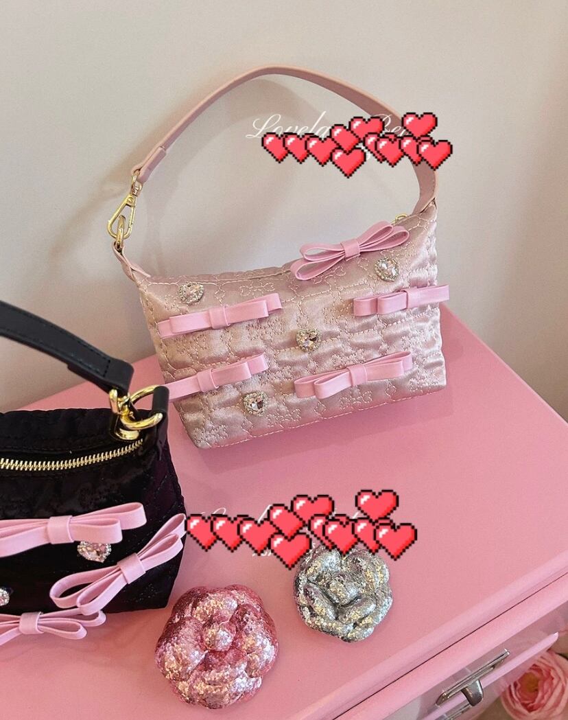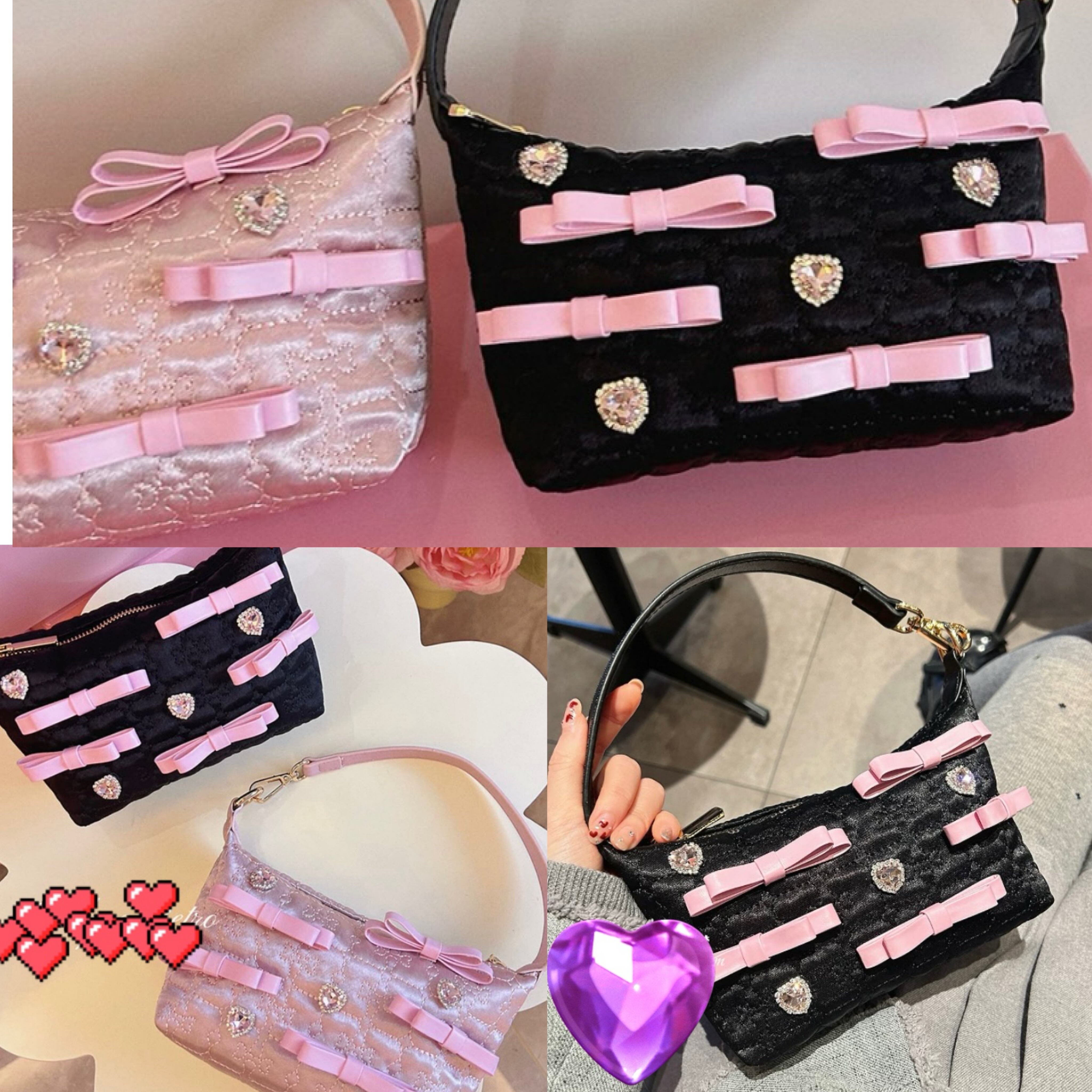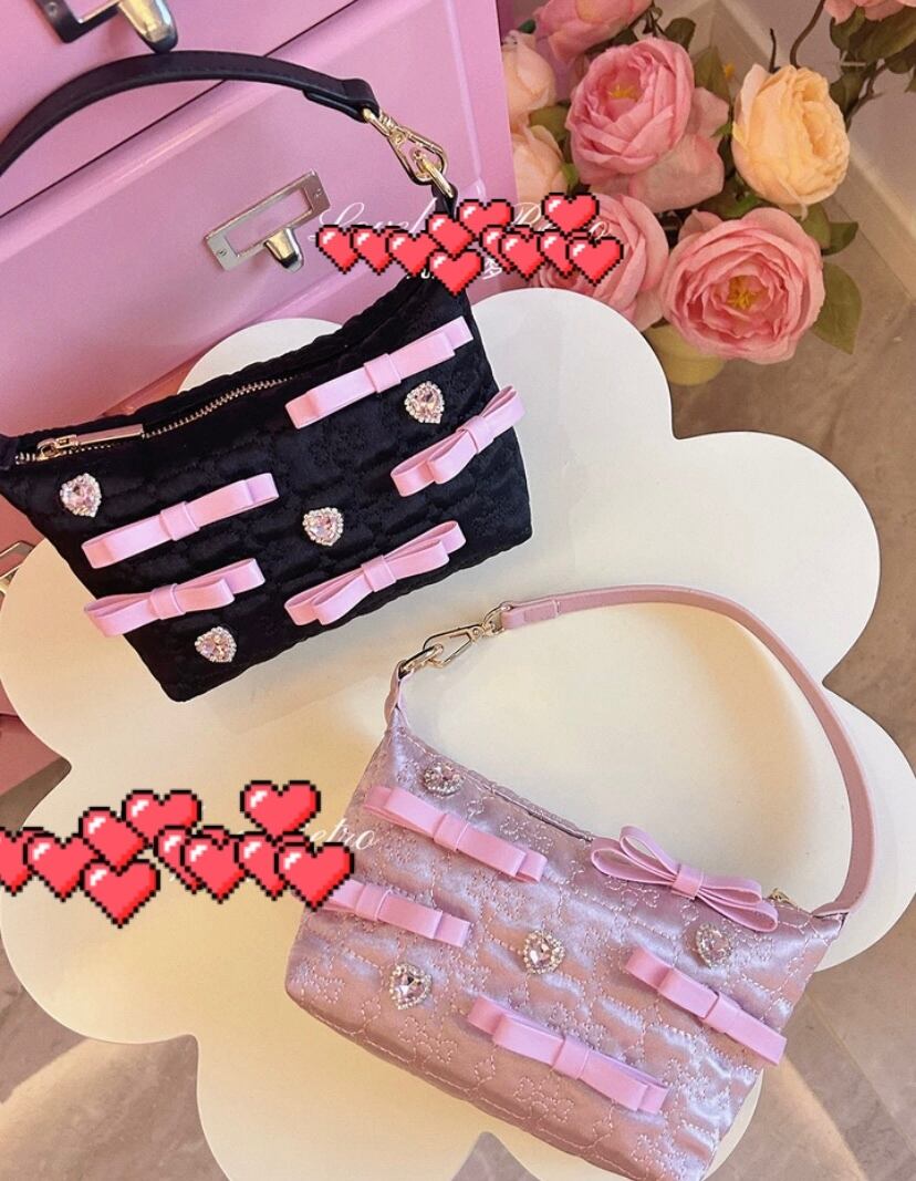 ミニバック、カバン、黒 ピンク リボン、キラキラ ラインストーンスパンコールハンドバッグ