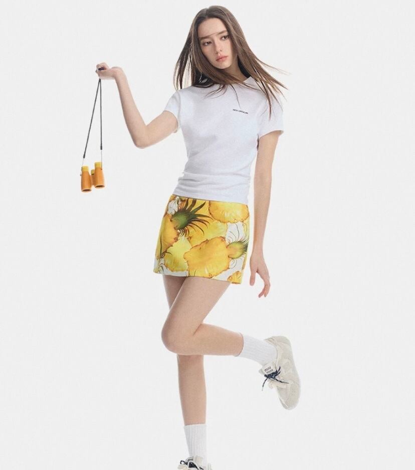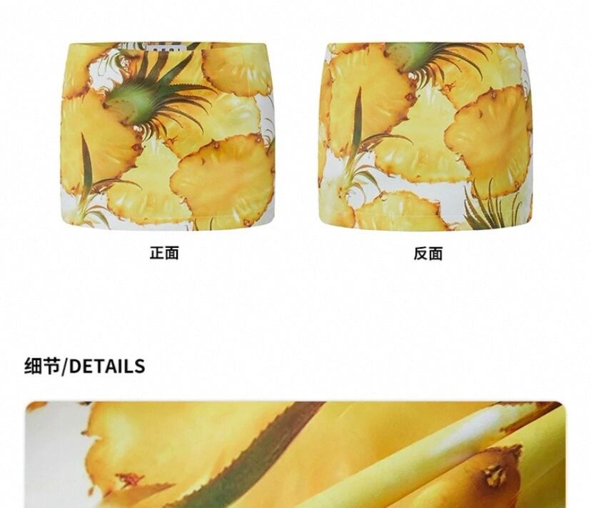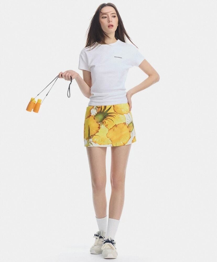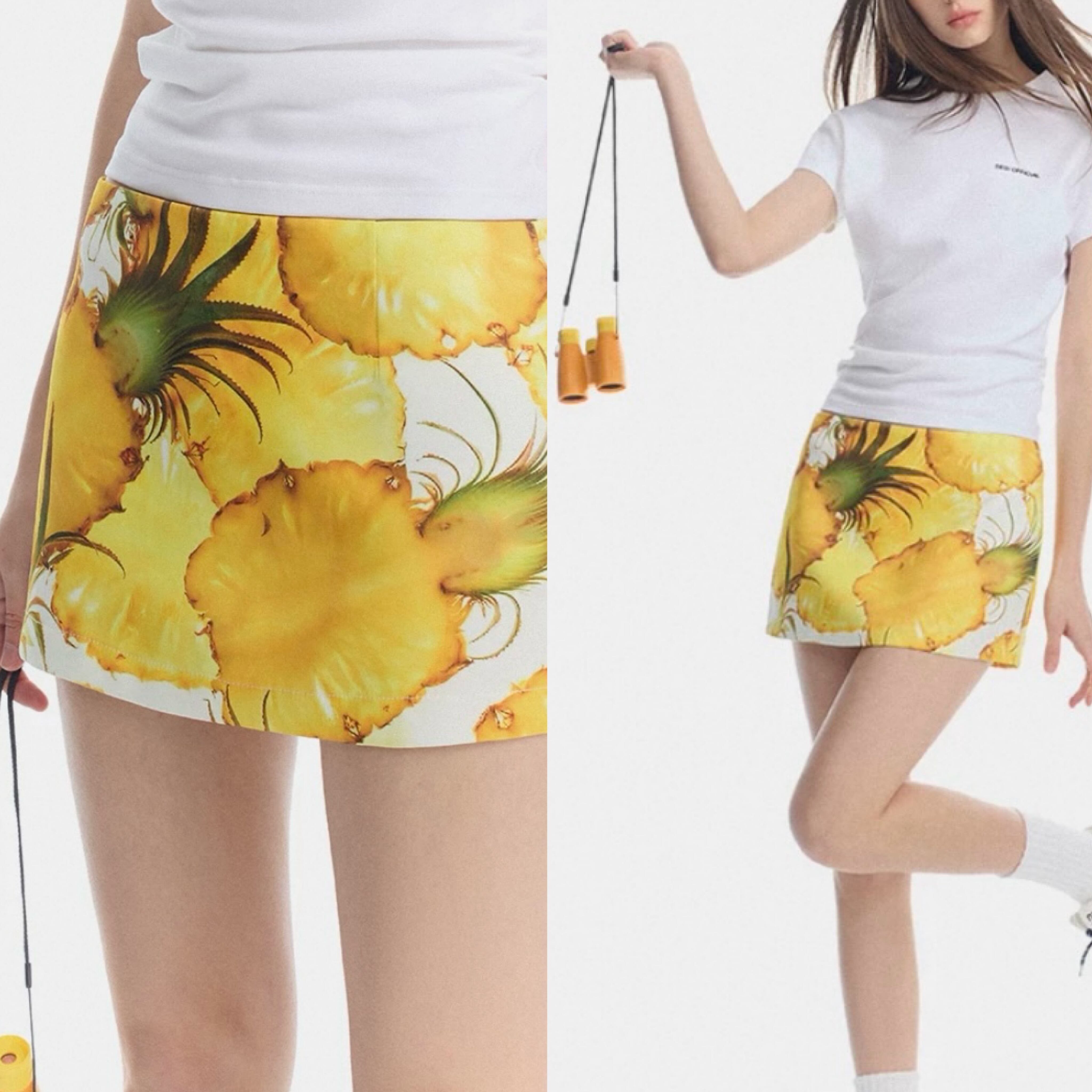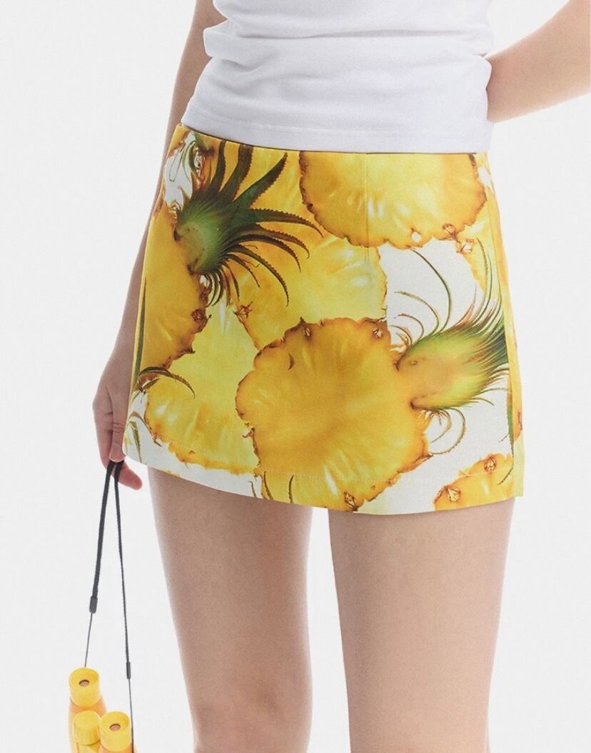 白 ボトムス ミニスカート 黄色 パイナップル、フルーツ 花柄