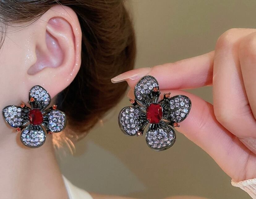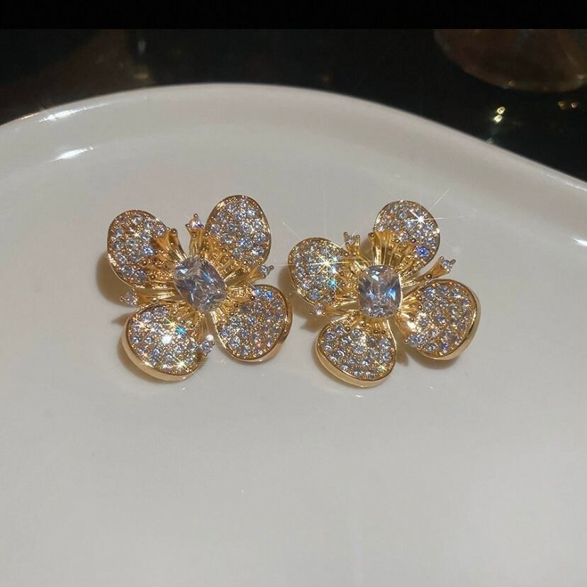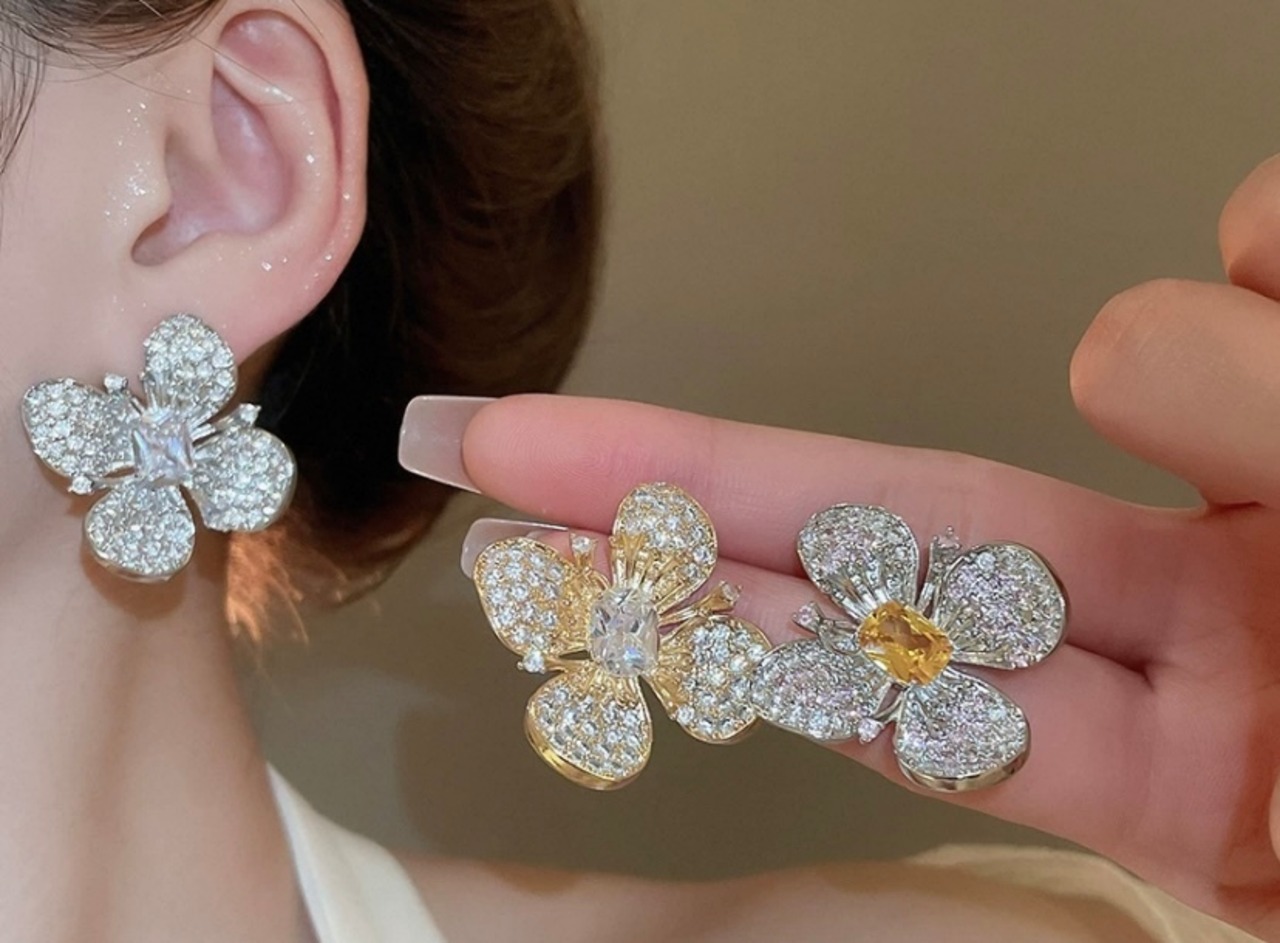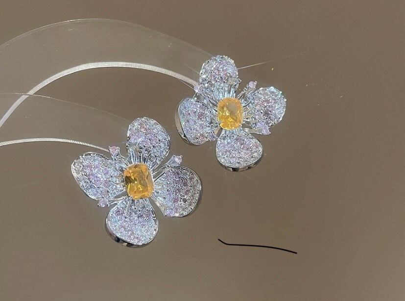 花 黄色、黒 ラインストーン、ビジュー キラキラ ピアス フラワー