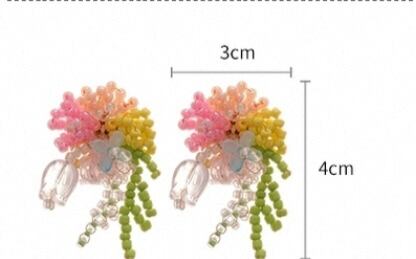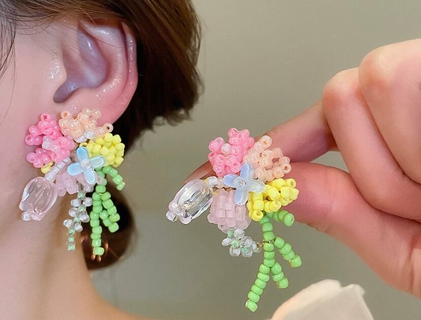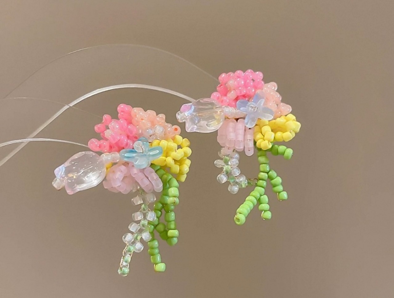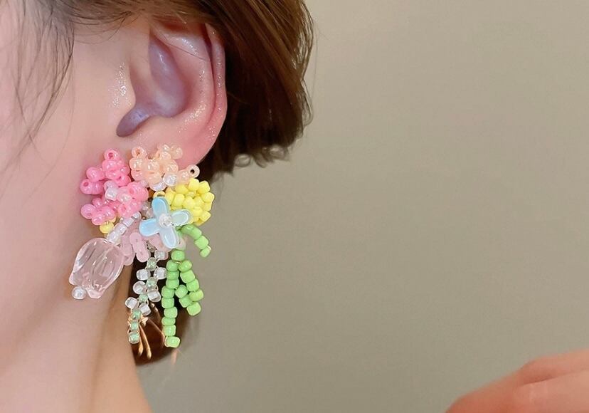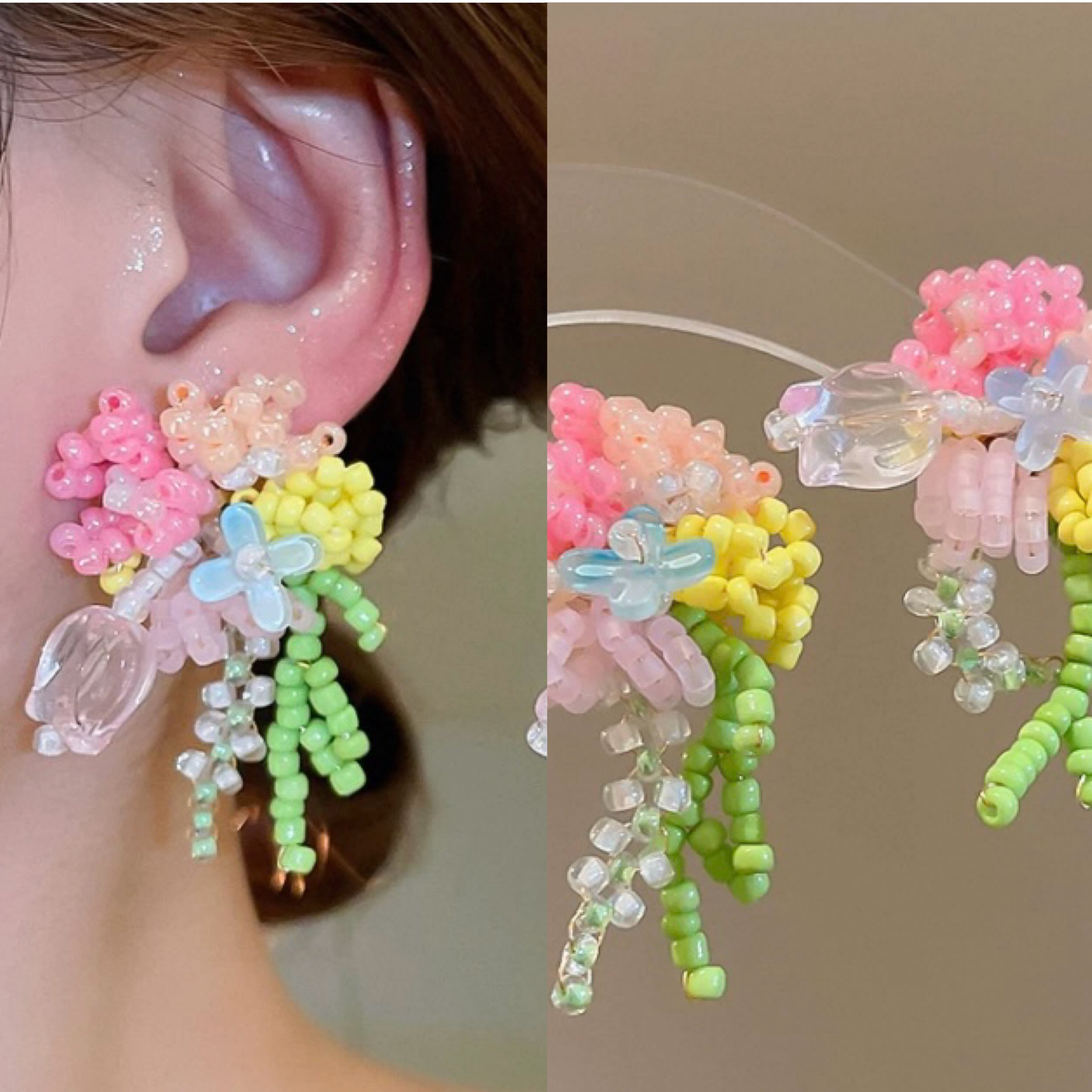 ピンク 黄色 ビーズ フラワー 花柄 ピアス