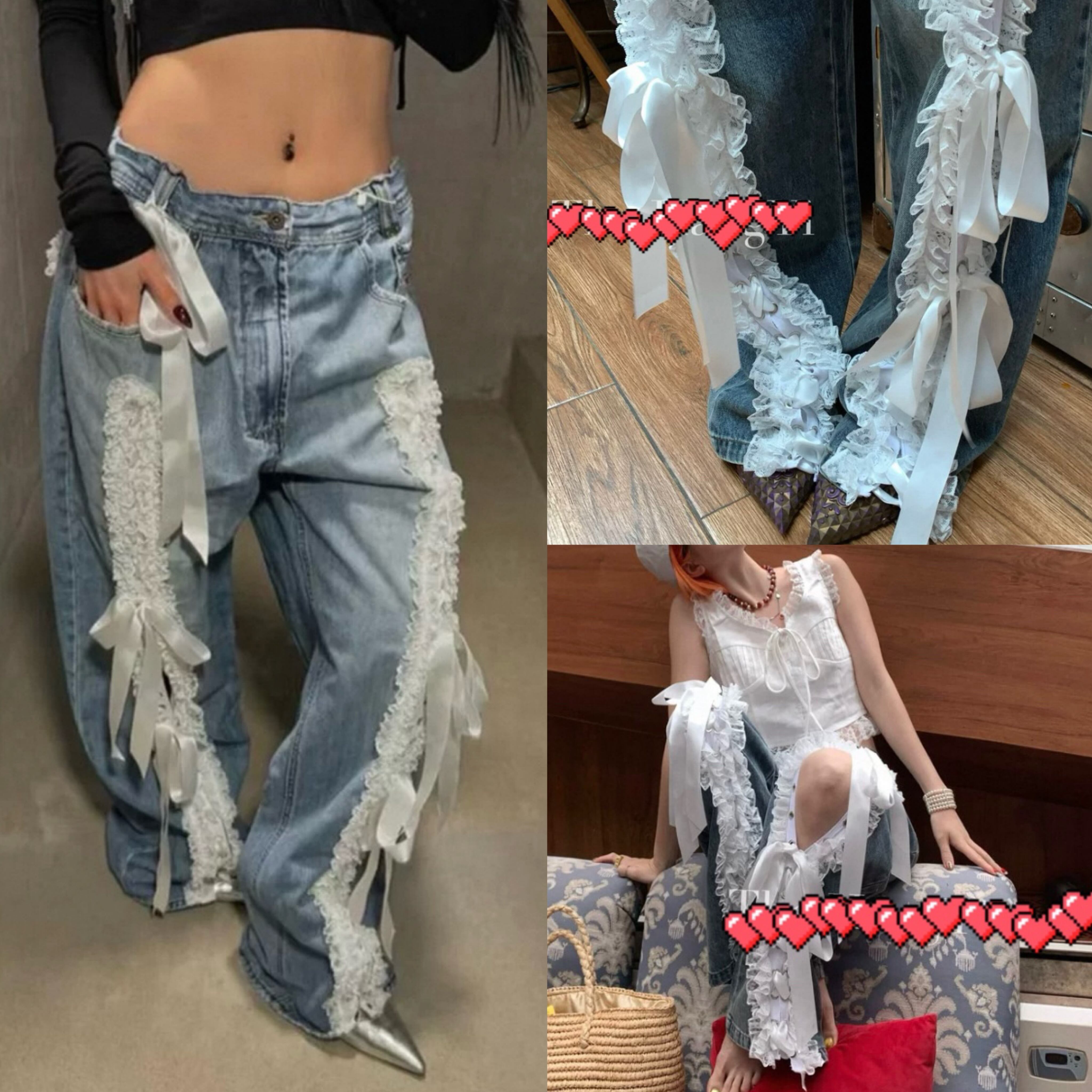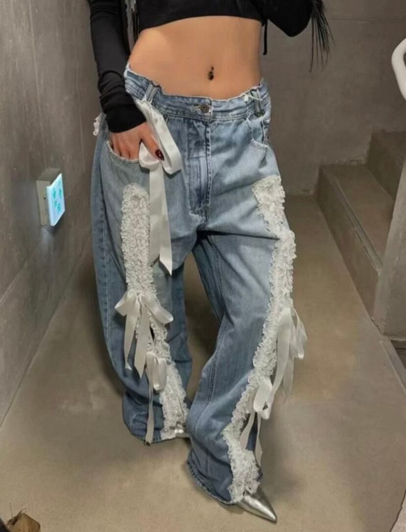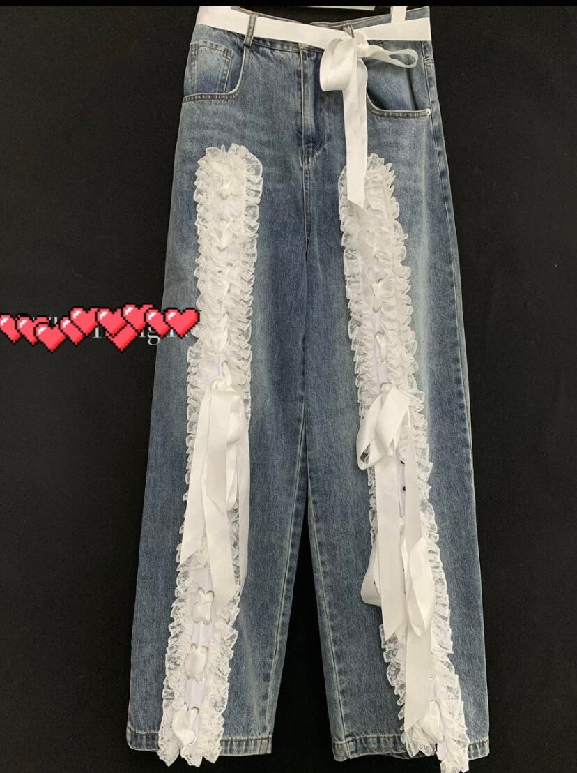 リボン デコレーション デニム パンツ、ボトムス 白